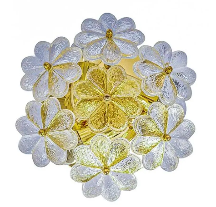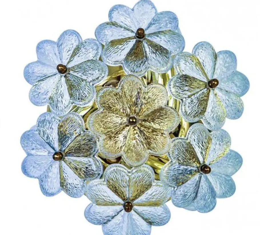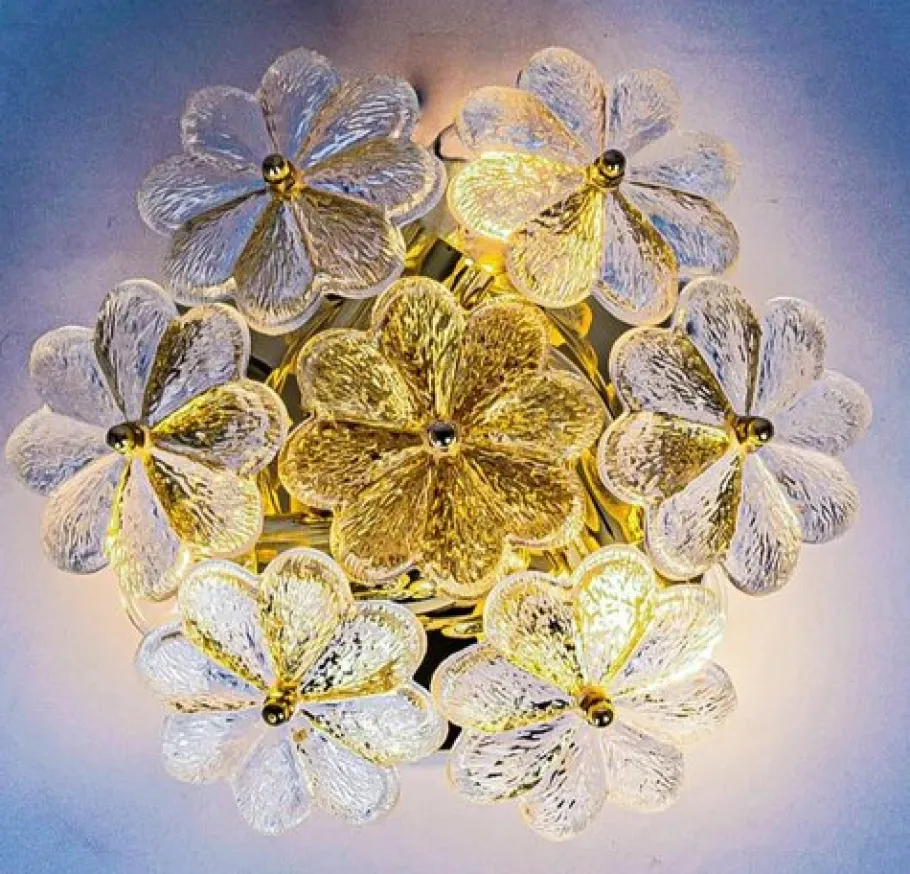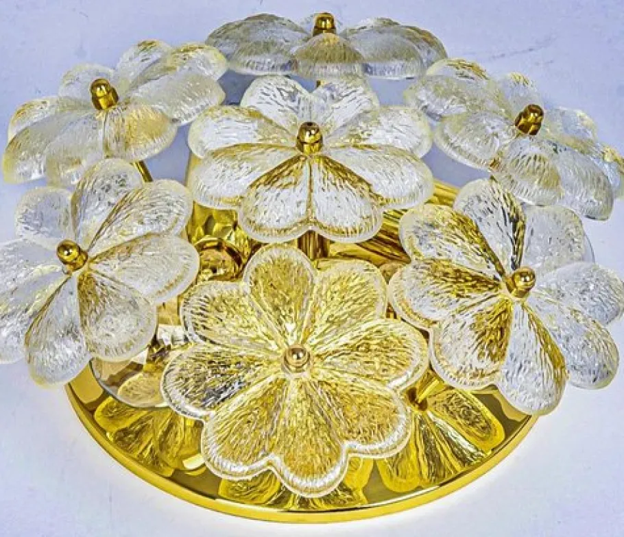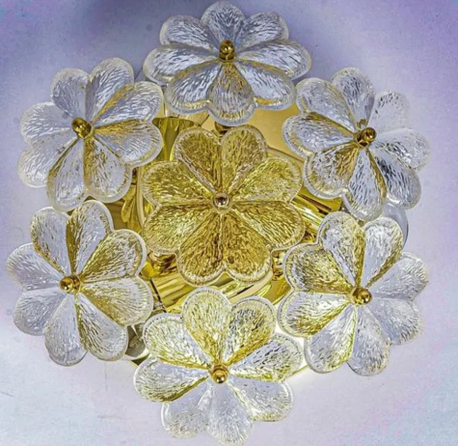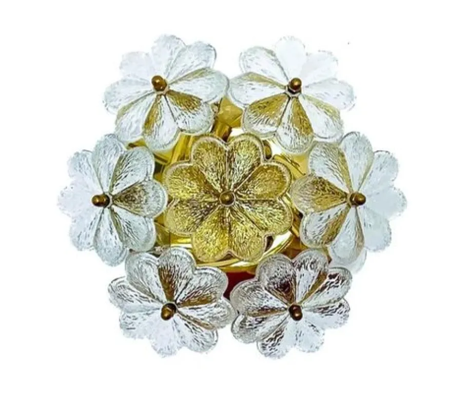Crystal Murano Glass and brass flush mount with 7 overlapping clear glass flowers and 3 / E14 light bulbs each. Beautiful design from the 60´s by Ernst Palme (Palwa), Germany.