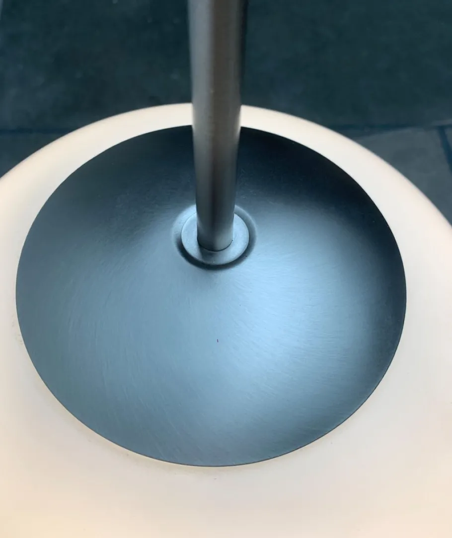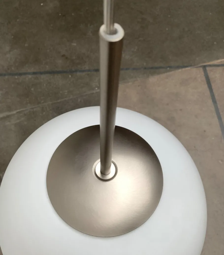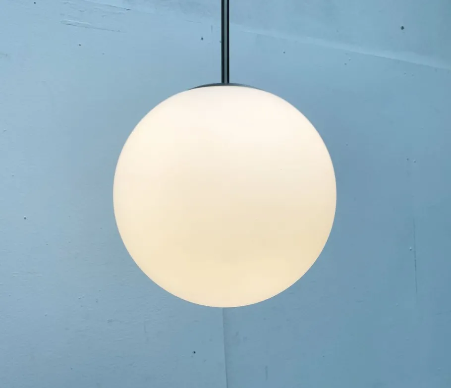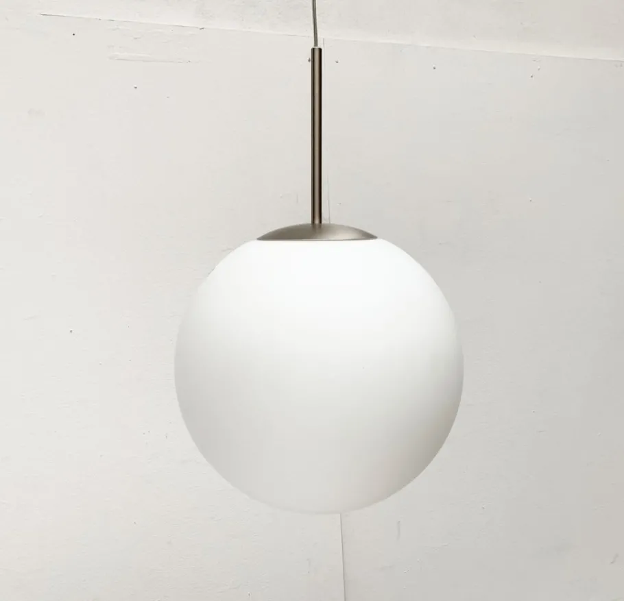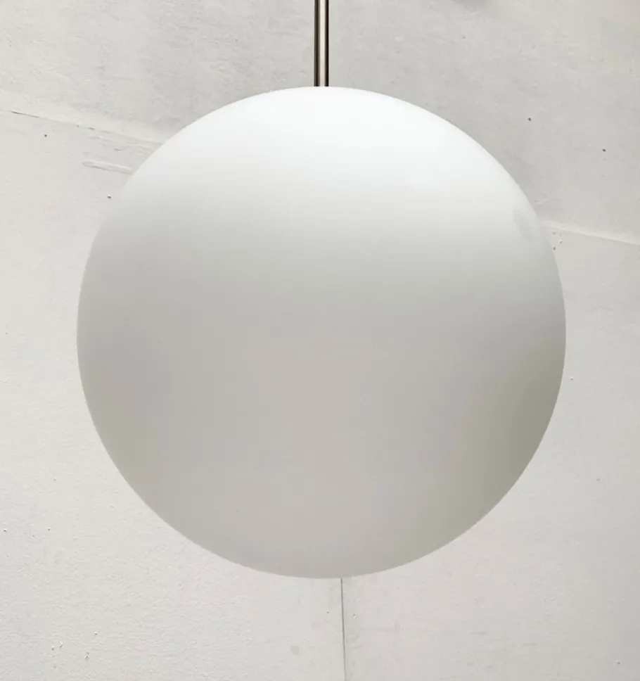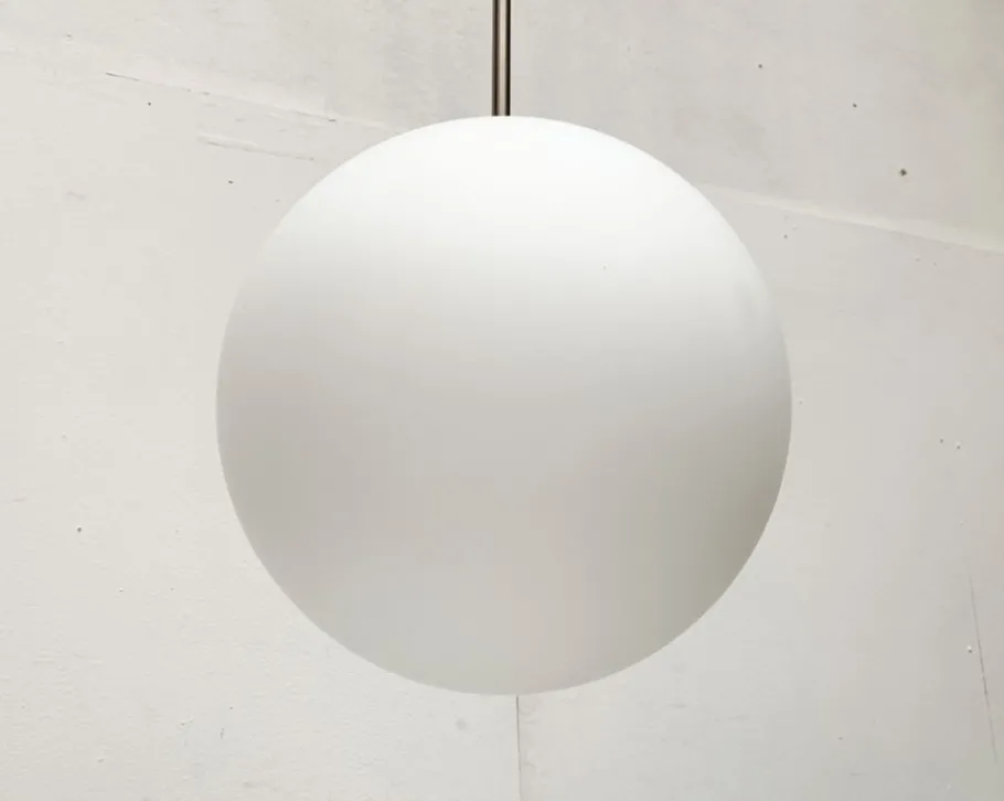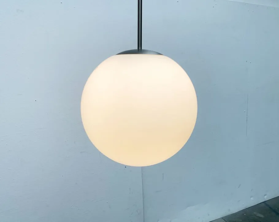 Classic ball pendant lamp. Striking is the imposing size of the opal glass sphere of 35 cm. The mounting merges seamlessly into the shape of the diffuser ball. The matching canopy is included.