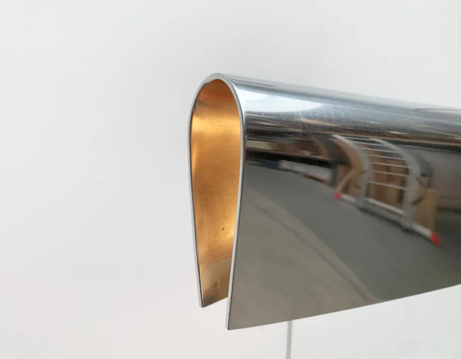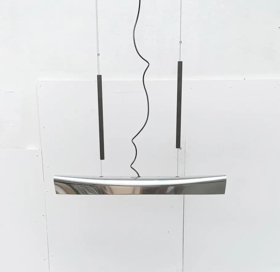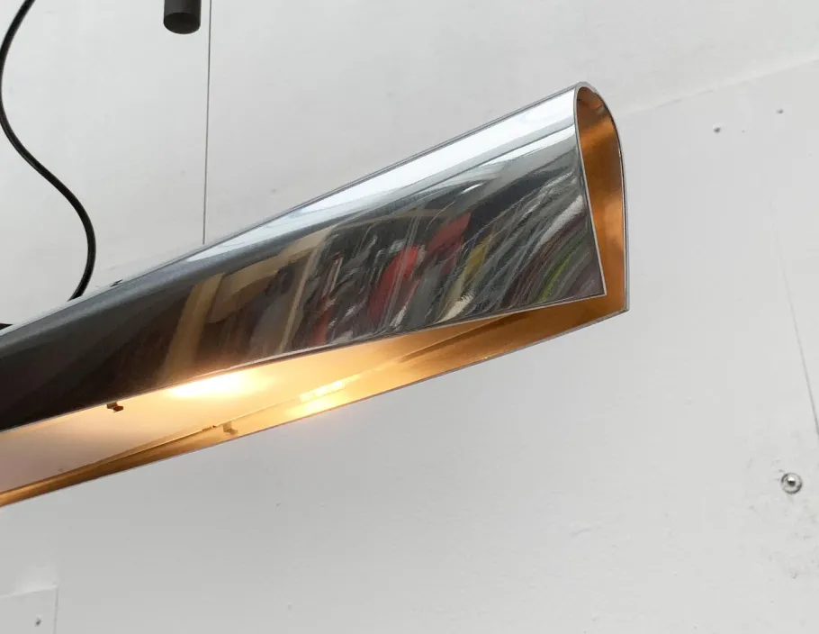 The elongated lamp body of the Nile is formed from a folded sheet of aluminum. This creates this tubular body with the bulbous center and open ends. At the bottom, the luminaire body closes with a diffuser disc made of frosted glass, which is held all around with a pronounced joint with clips. A special feature is the infinitely variable height adjustment via a pulley system with two weights. In contrast to the aluminum of the luminaire, the weight rods are finished in matt anthracite. The supply line runs strain-relieved in loops in the middle. The lamp is unfortunately no longer produced and is accordingly rare.