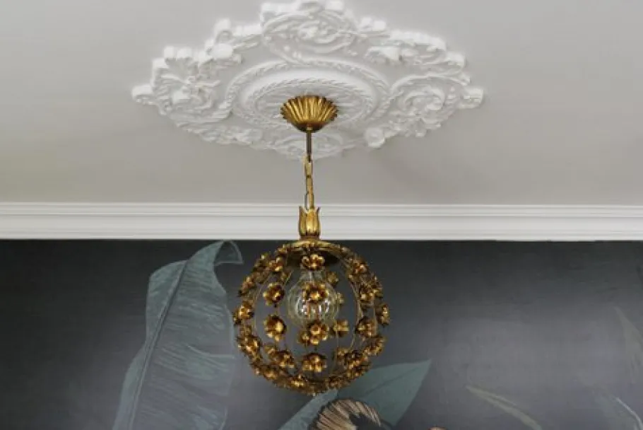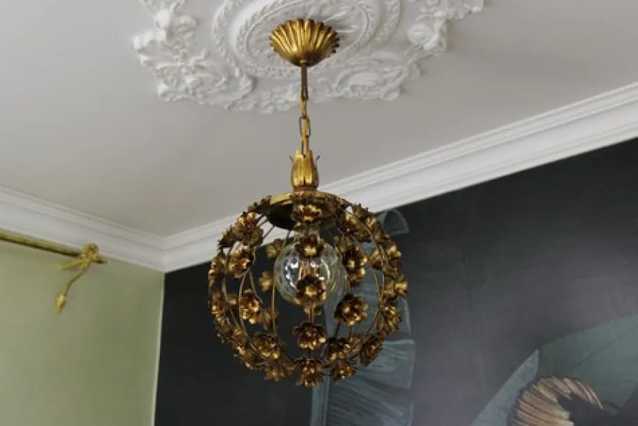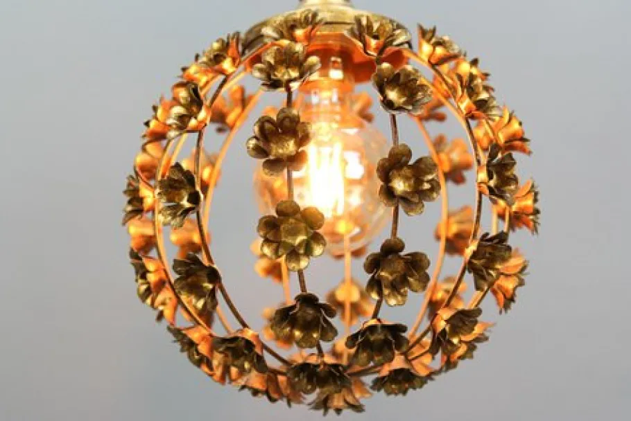This beautiful gilt metal pendant chandelier features a sphere-shaped frame decorated with flowers that surround the single light with a new socket for an E-27 (E26) size light bulb.