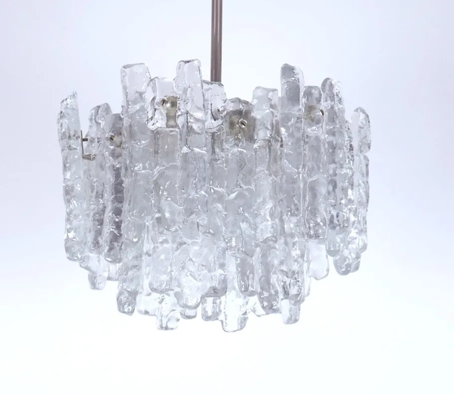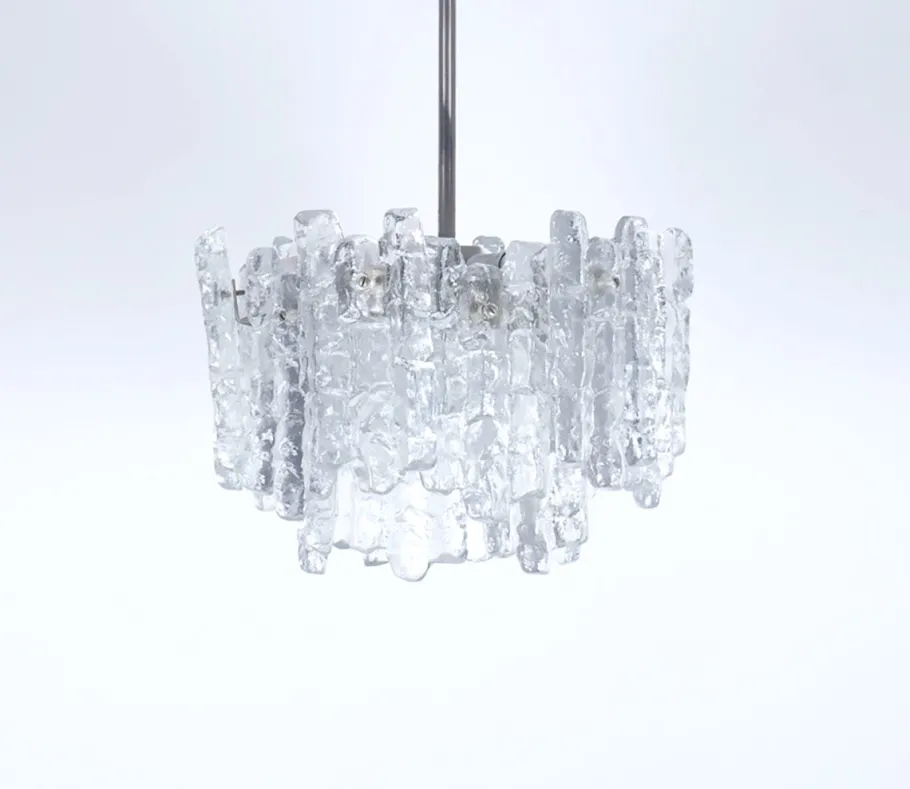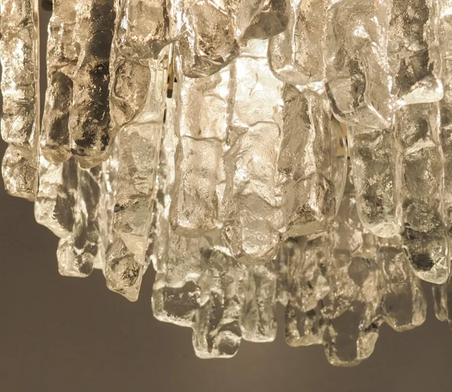 The lamp has a metal frame with a double row of thick Murano glass discs.