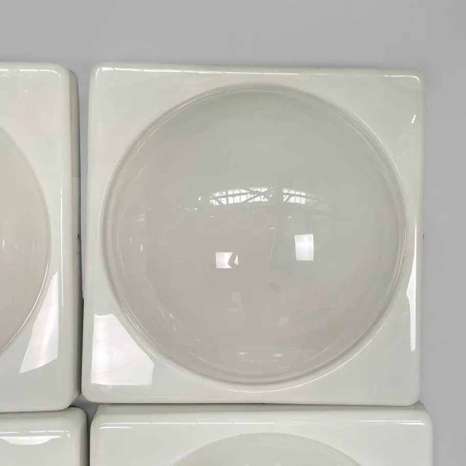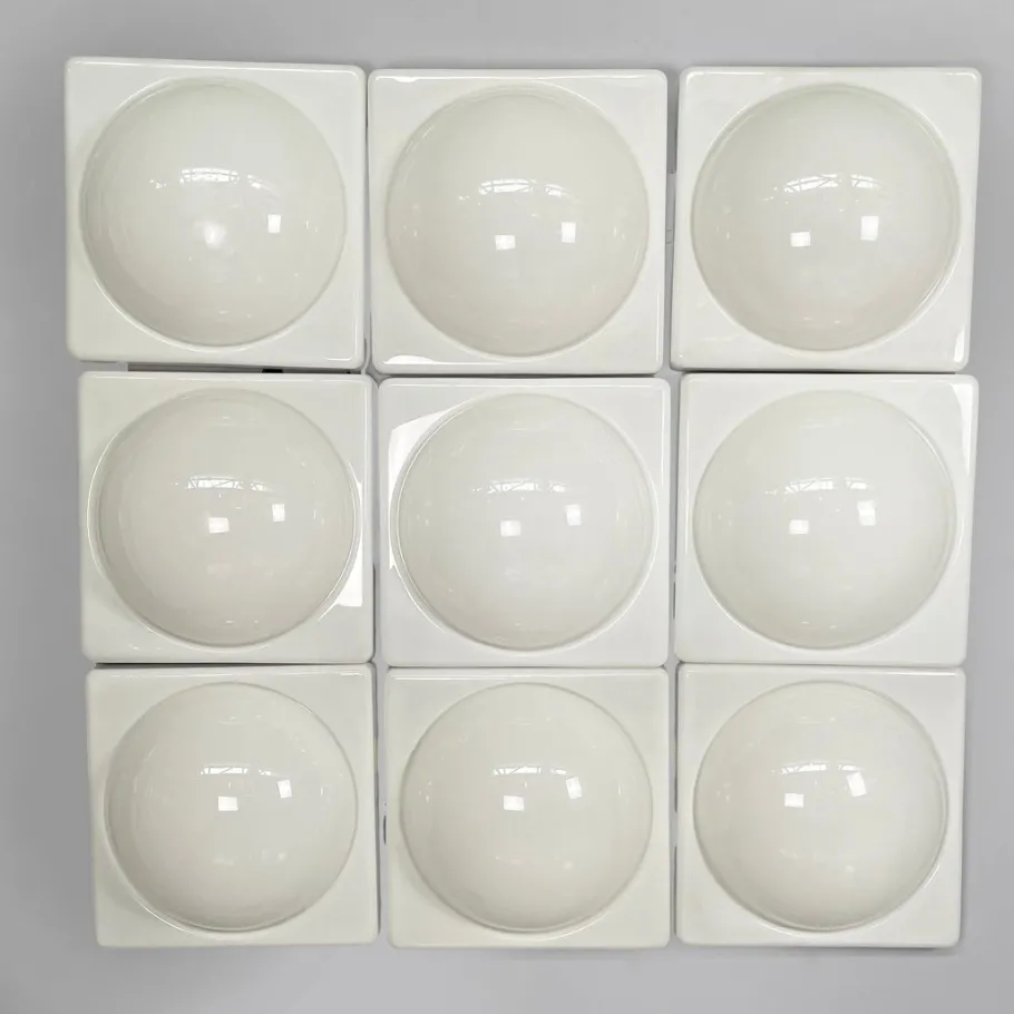 Set of nine wall lamps with a semi-spherical diffuser in molded plastic. The base is square and made of opaque white plastic.