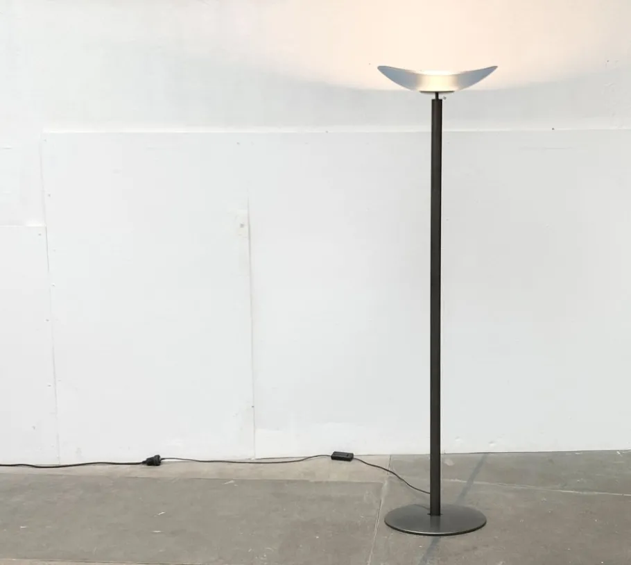 A postmodern design with special proportions. This floor lamp is a functional light source and an impressive object at the same time. An elegantly curved bowl made of satin, blue glass serves as a diffuser. The colored shell sits at the end of a long shaft. The shaft is kept in a dark shades of gray and lentil -shaped. The transition of the shaft to the oval plate foot takes place via an elegant joint.