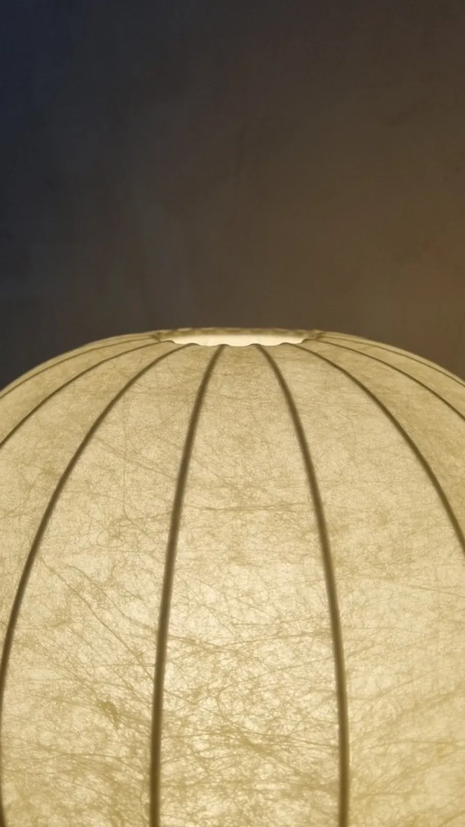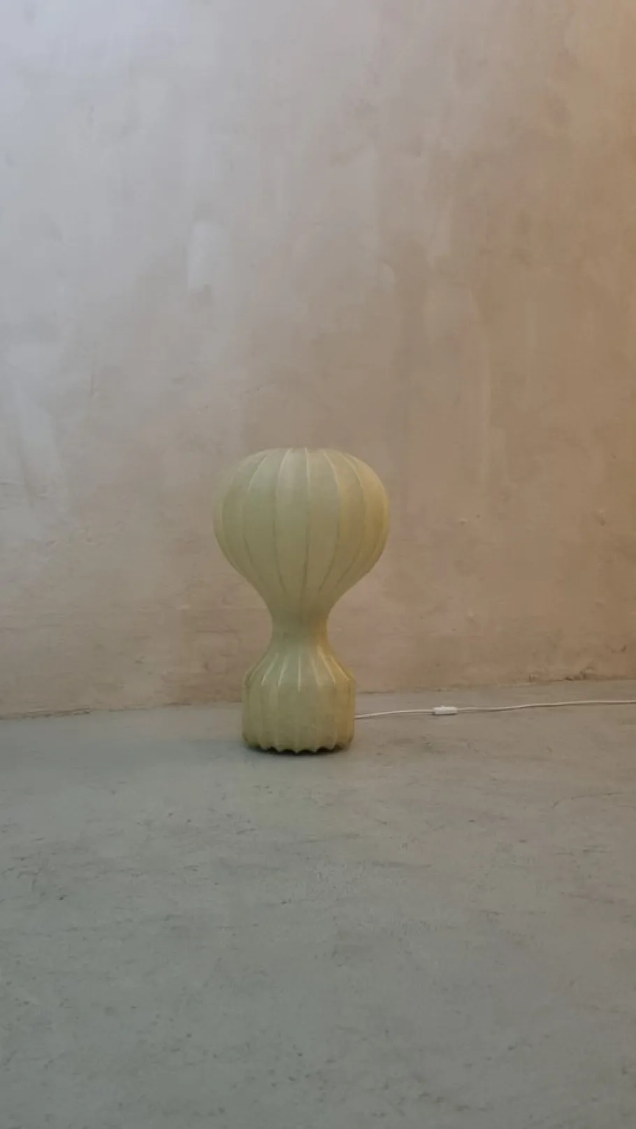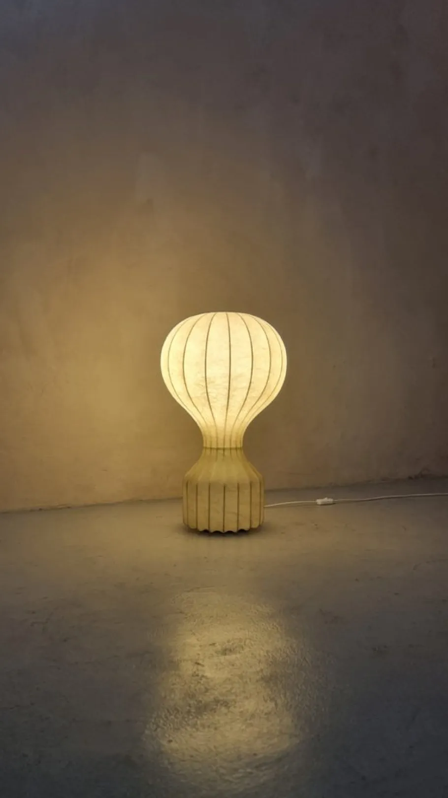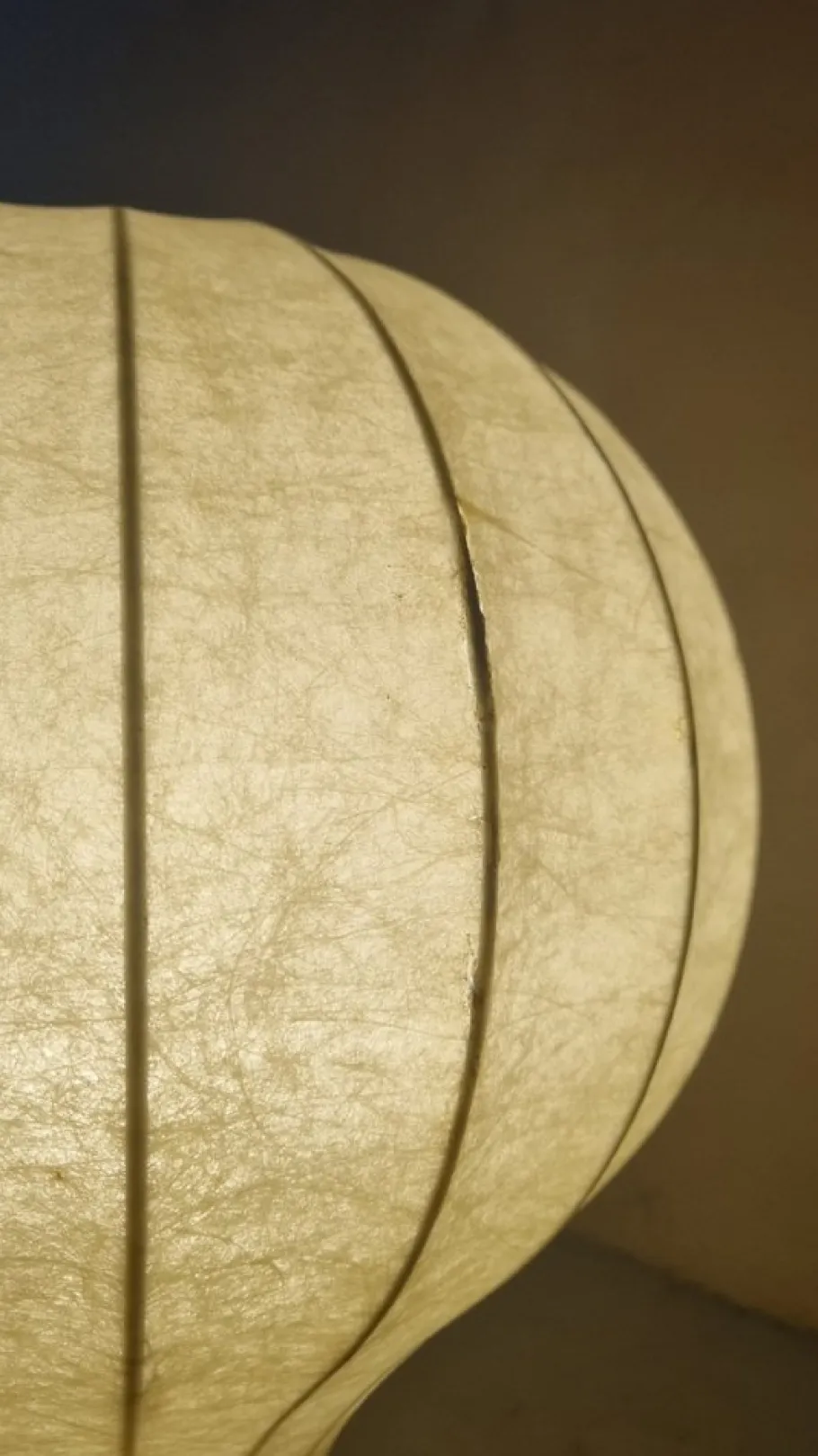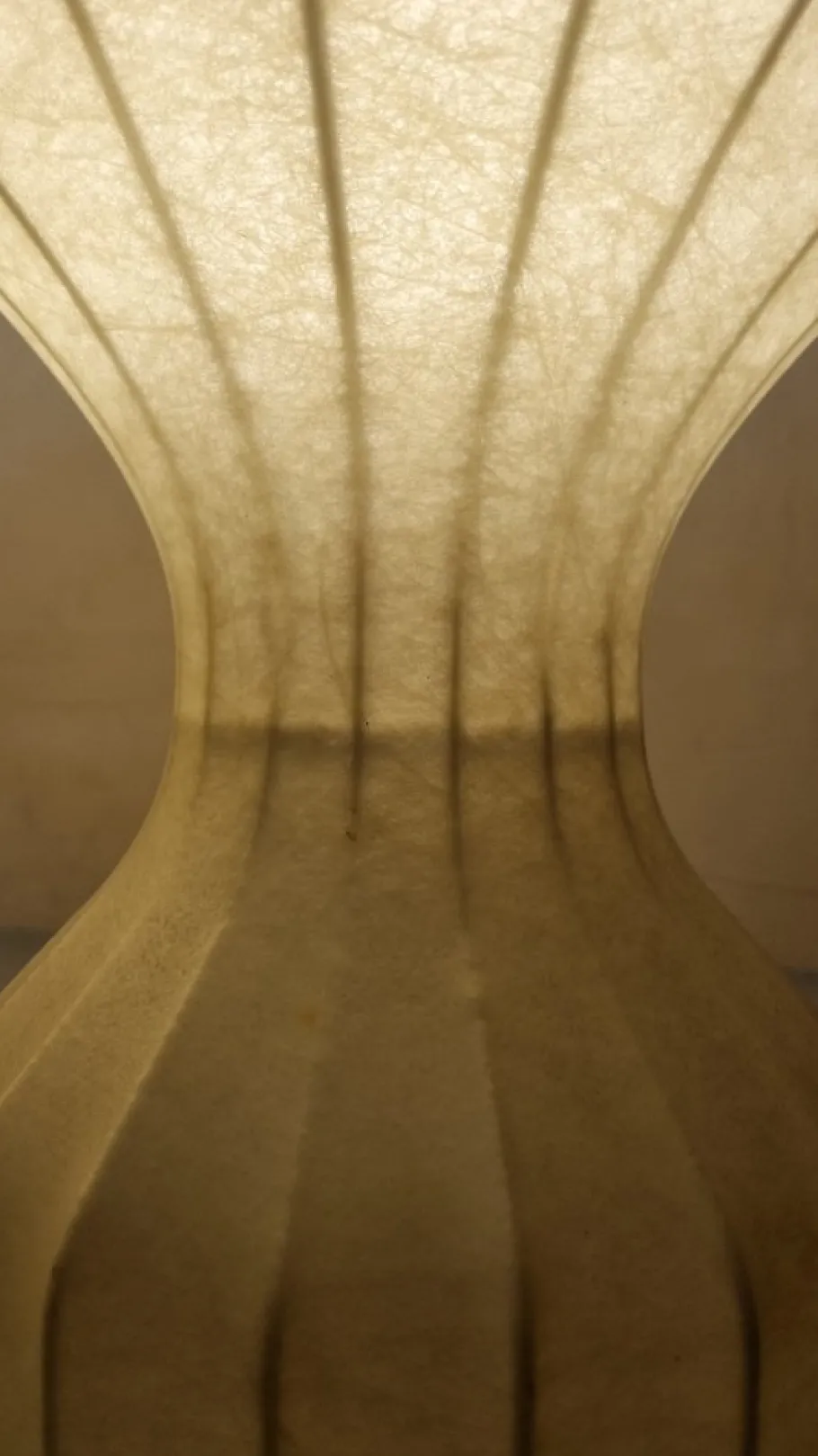 Experimenting with a patent from the Merano-based company Heisenkeil, acquired by Flos, the Castiglioni family explored the expressive possibilities of a synthetic fiber, already used in some lamps designed by George Nelson and Isamu Noguchi, called cocoon (cocoon). This material was used by the U.S. military to store weapons for transport or no longer in use. The shape of the diffusers is generated by the arrangement of the fiber, which rests on the structure, adhering only to the most prominent points. The Luminaires are formed, in fact, by a thin core of white lacquered metal rod, wrapped by the casing obtained from a film formed by sprayed plastic polymers. This produces volumes of unusual shape, certainly intuited by the designers, but which could hardly have been designed without laboratory experimentation. In fact, the final shape is the result of punctual intervention in the rotation of the structure while spraying the fiber, which is more intense at points of greater prominence than in other areas.