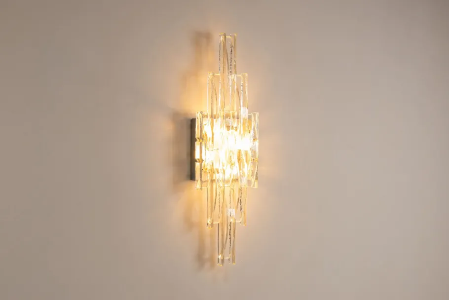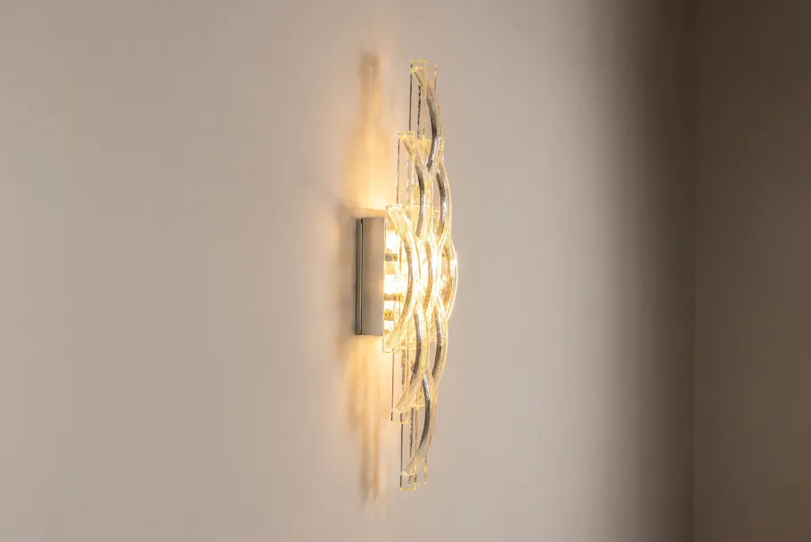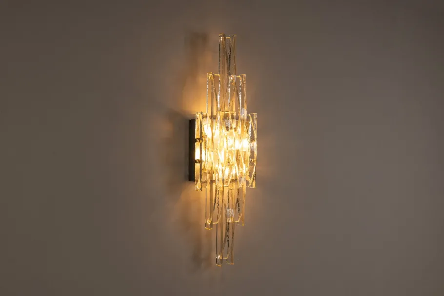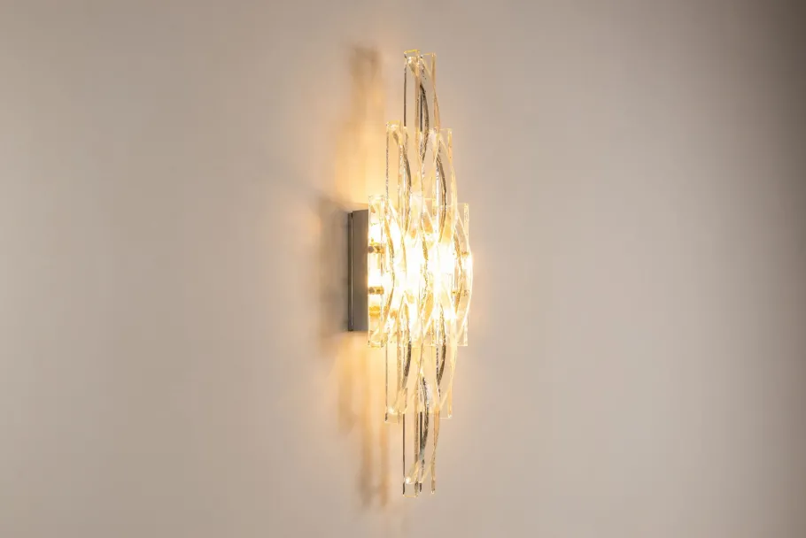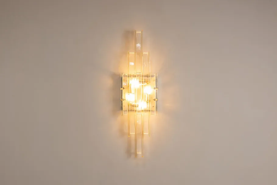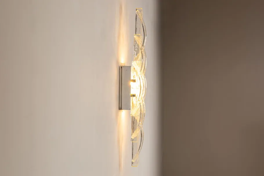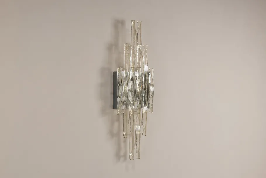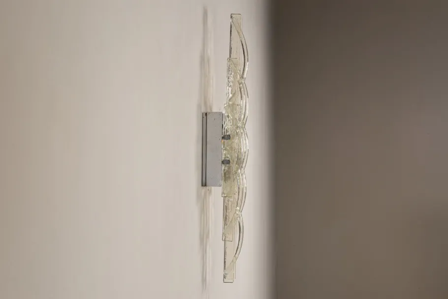 This piece is constructed from an architectural composition of hand-moulded glass elements arranged in a vertical configuration. Each ribbon of glass is slightly curved and organically shaped, catching and refracting the light in a soft, diffused glow. The glass has a lightly bubbled texture, typical of Poli’s work, that gives the surface a tactile quality and refracts the light unevenly, adding depth and visual movement. These elements are mounted on a rectangular metal backplate.