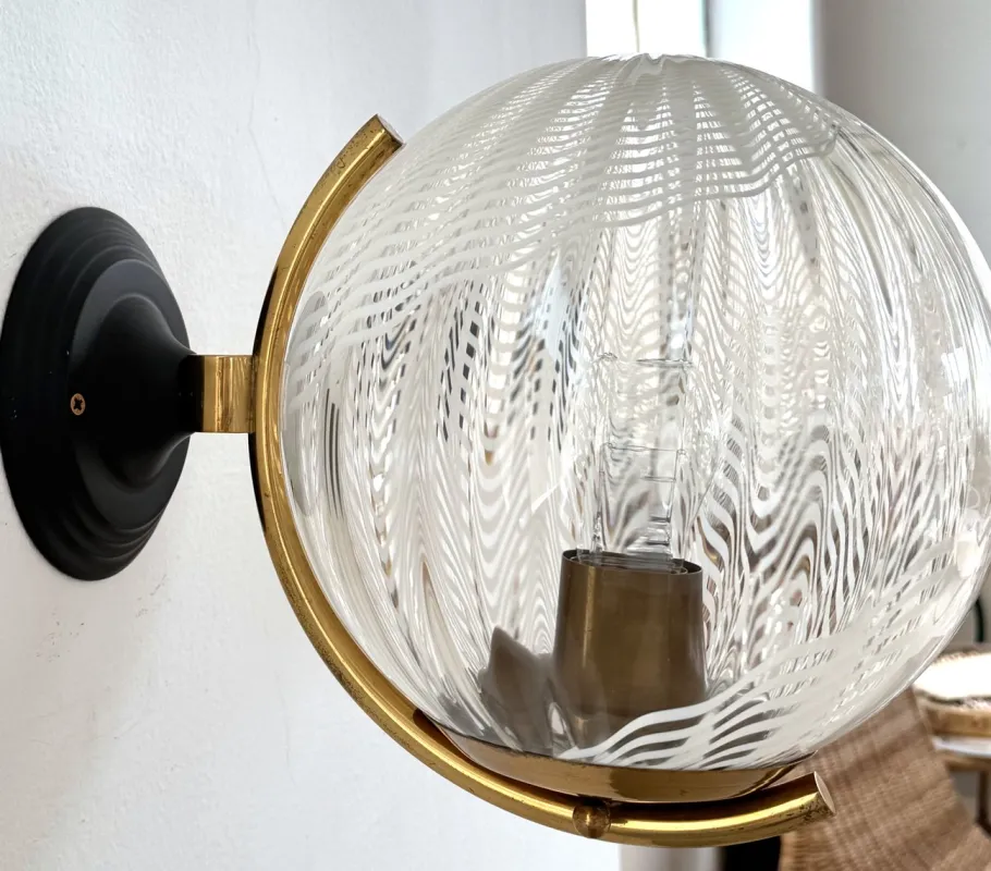 The spherical glass shades have a wave shape with irregular white stripes running across them.