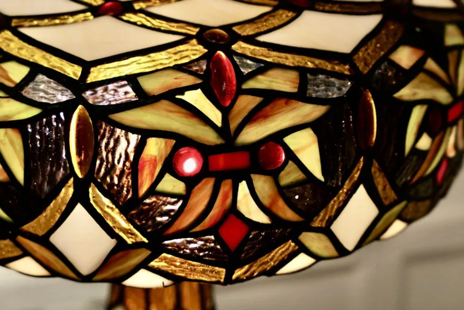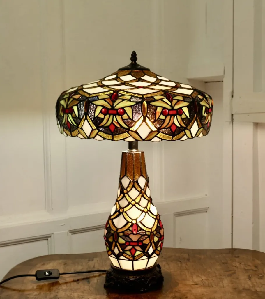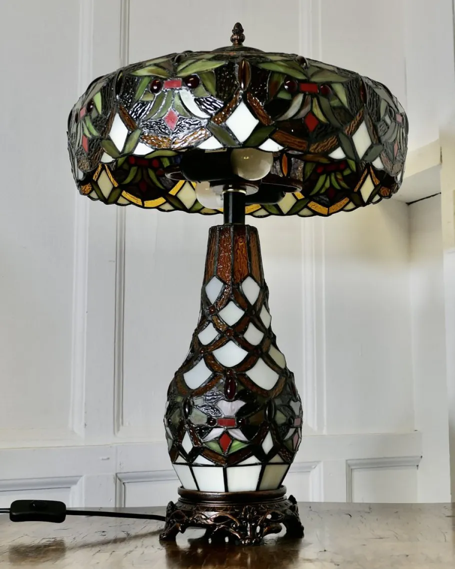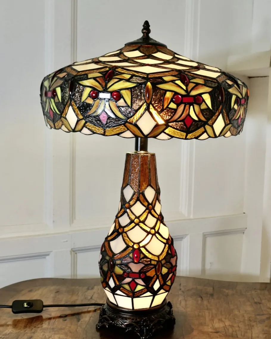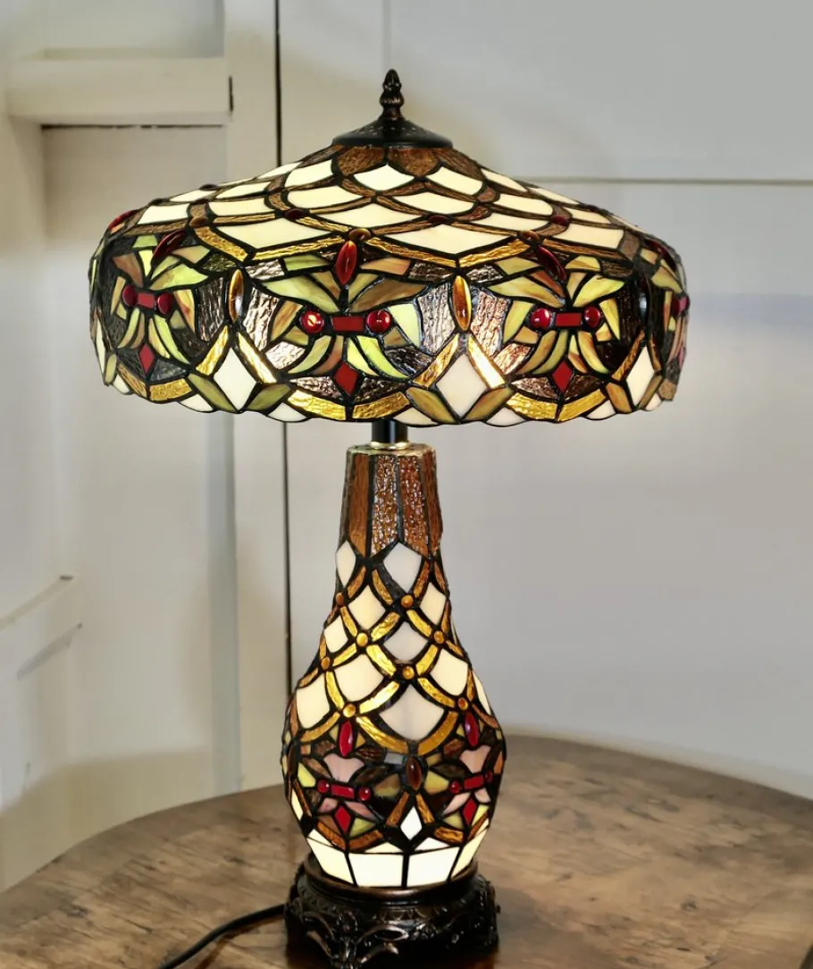A very unusual and stunning piece, the lamp and the shade are made in leaded and jewelled glass, the base of the lamp has a lightbulb inside to show the superb design which is repeated in the large shade which has 2 more lightbulbs, as you can imagine this a is magnificent and colourful piece