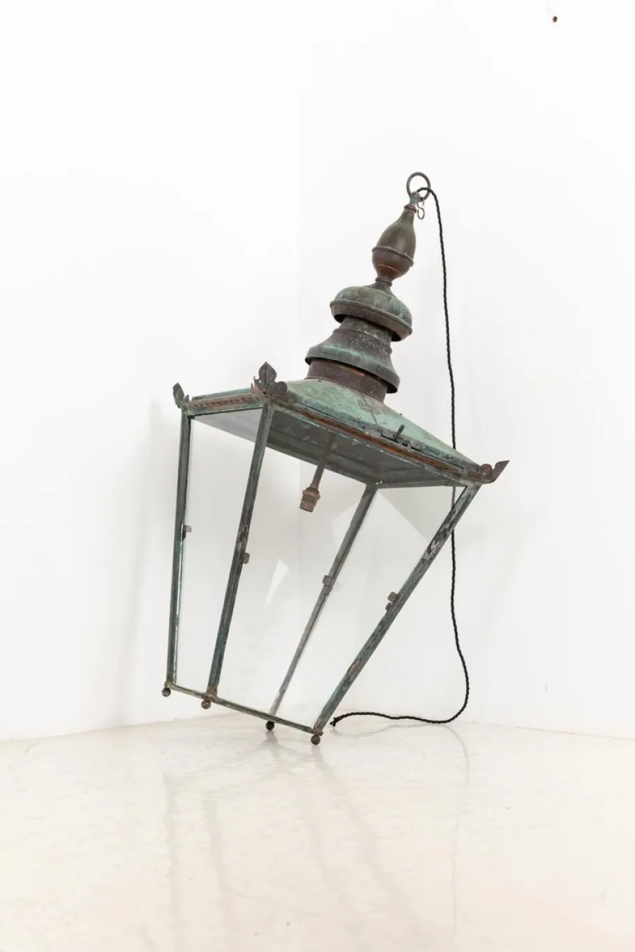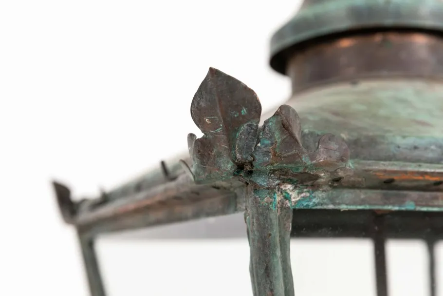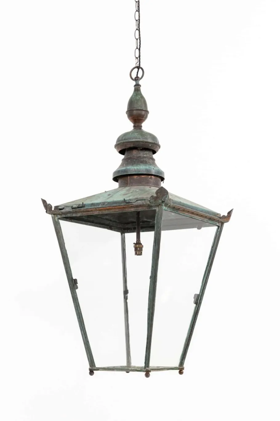 A finely constructed square lantern, presented in original as found condition. The copper has developed a rich, natural patina through decades of oxidisation. Glazed on all sides with the original glass panels, and featuring a debossed maker’s tab at the top of the lantern body.