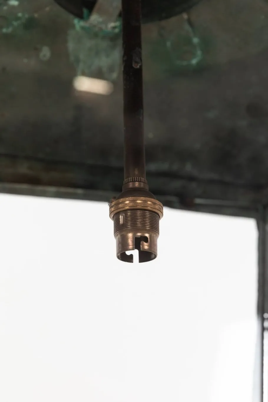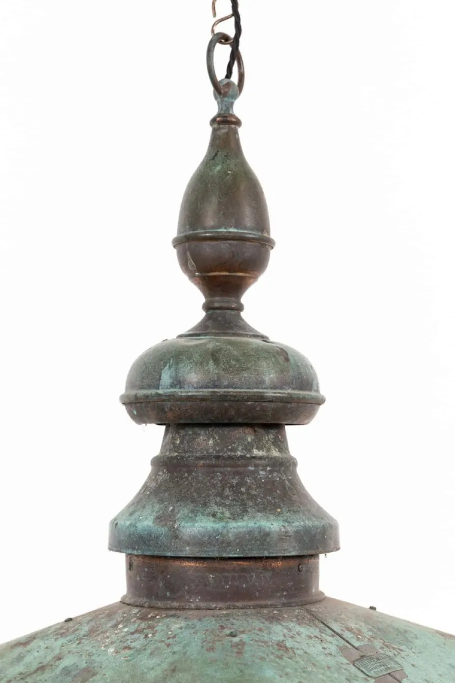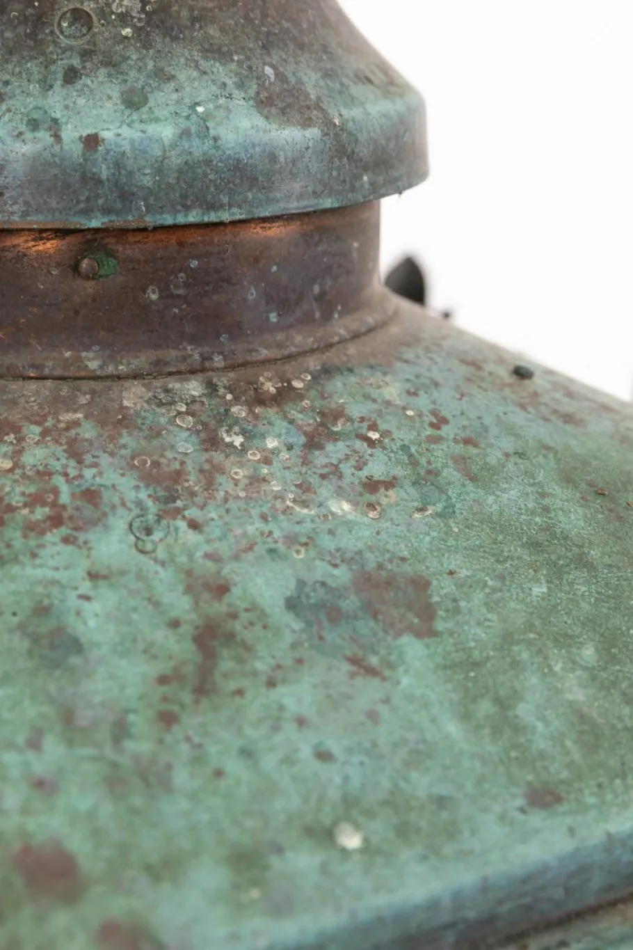 A finely constructed square lantern, presented in original as found condition. The copper has developed a rich, natural patina through decades of oxidisation. Glazed on all sides with the original glass panels, and featuring a debossed maker’s tab at the top of the lantern body.
