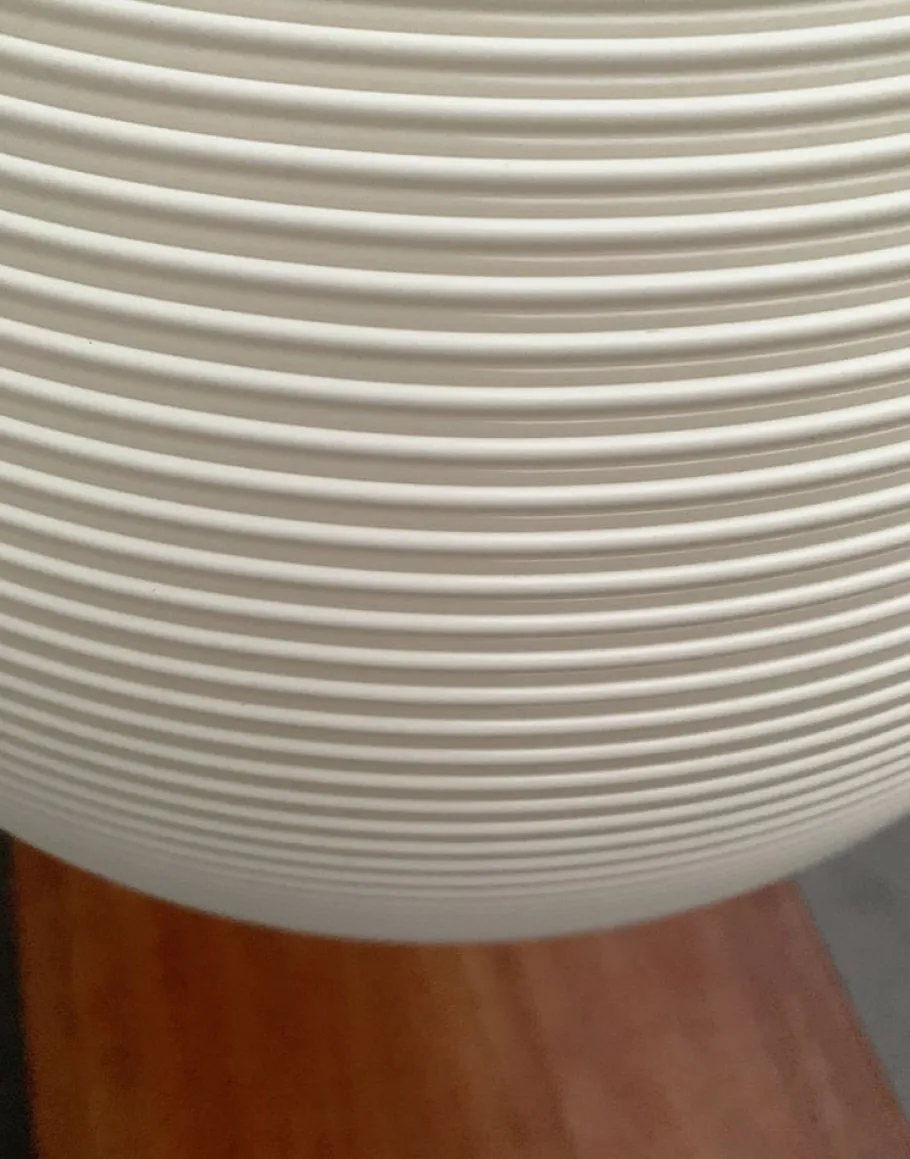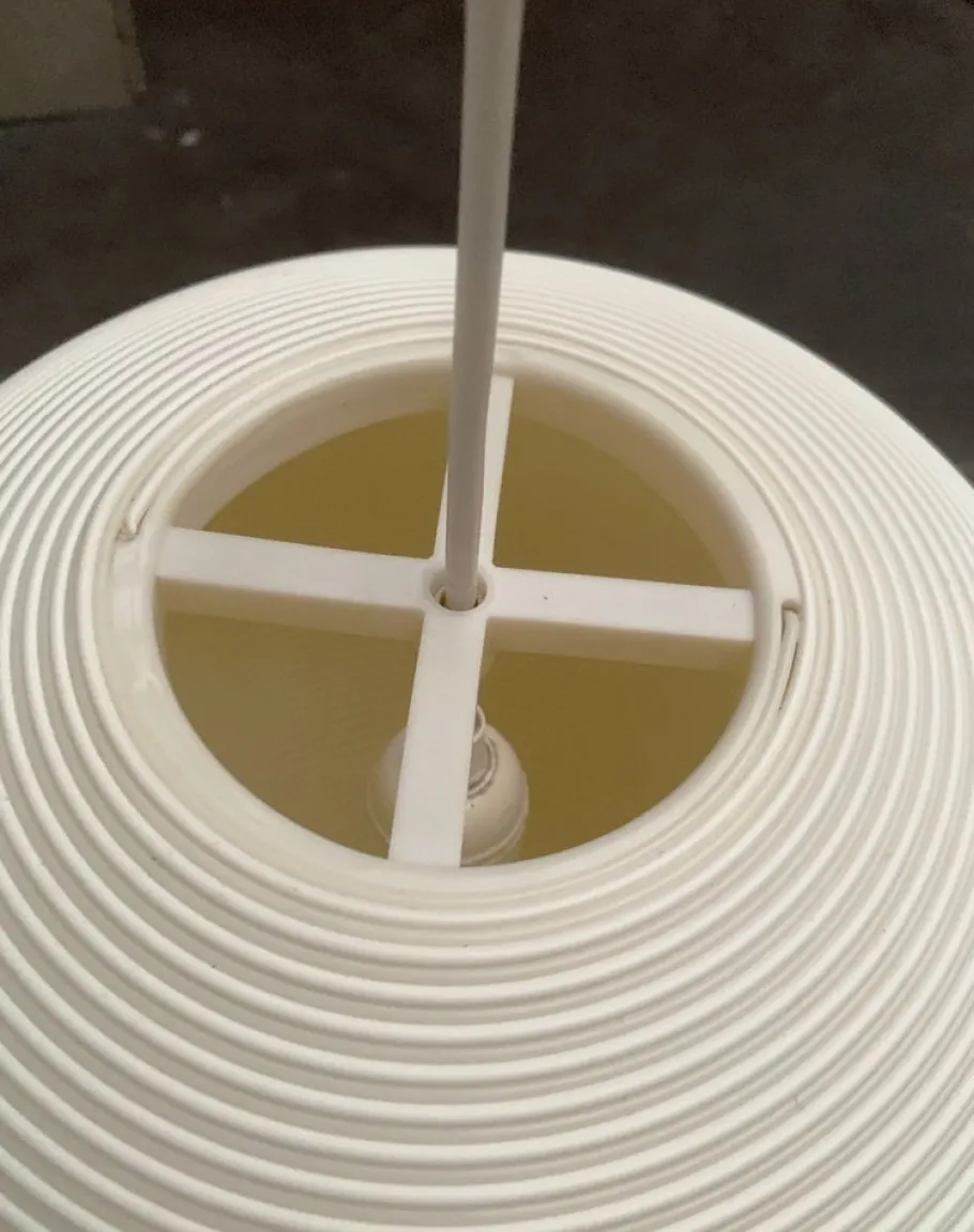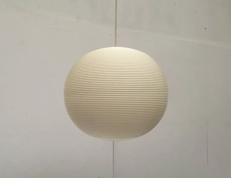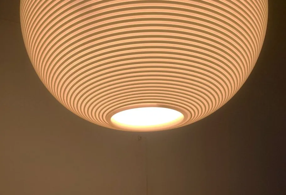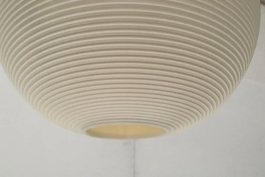 Minimalist pendant lamp made of plastic. The symmetrical luminaire body consists of a translucent plastic (rotoflex) and is circumferentially provided with a groove structure. Due to the special materiality, this luminaire acts as an elegant object in the single and switched-off state.