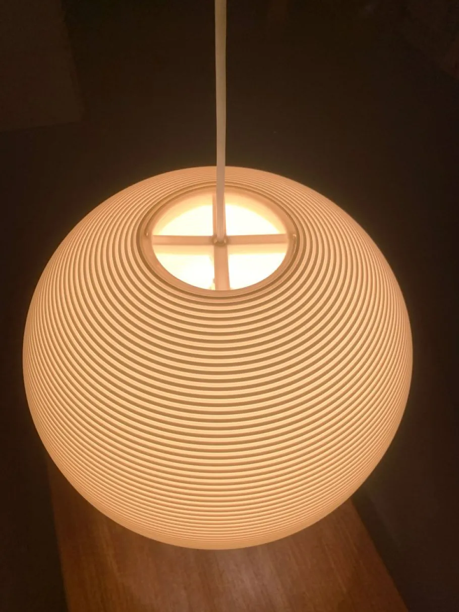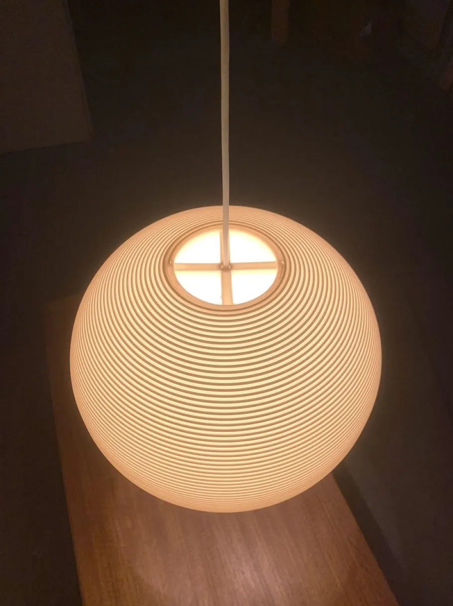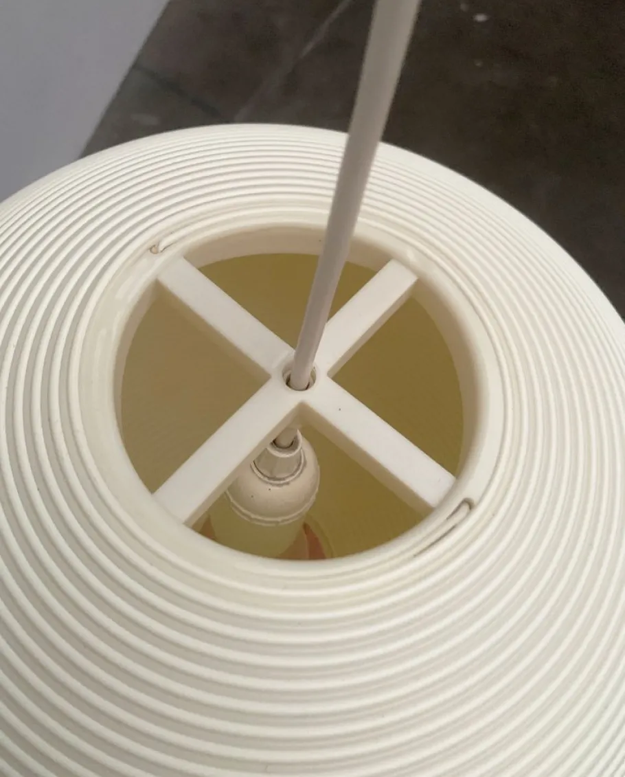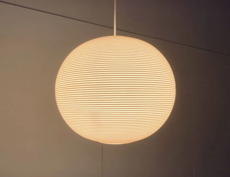 Minimalist pendant lamp made of plastic. The symmetrical luminaire body consists of a translucent plastic (rotoflex) and is circumferentially provided with a groove structure. Due to the special materiality, this luminaire acts as an elegant object in the single and switched-off state.