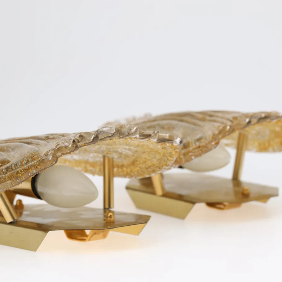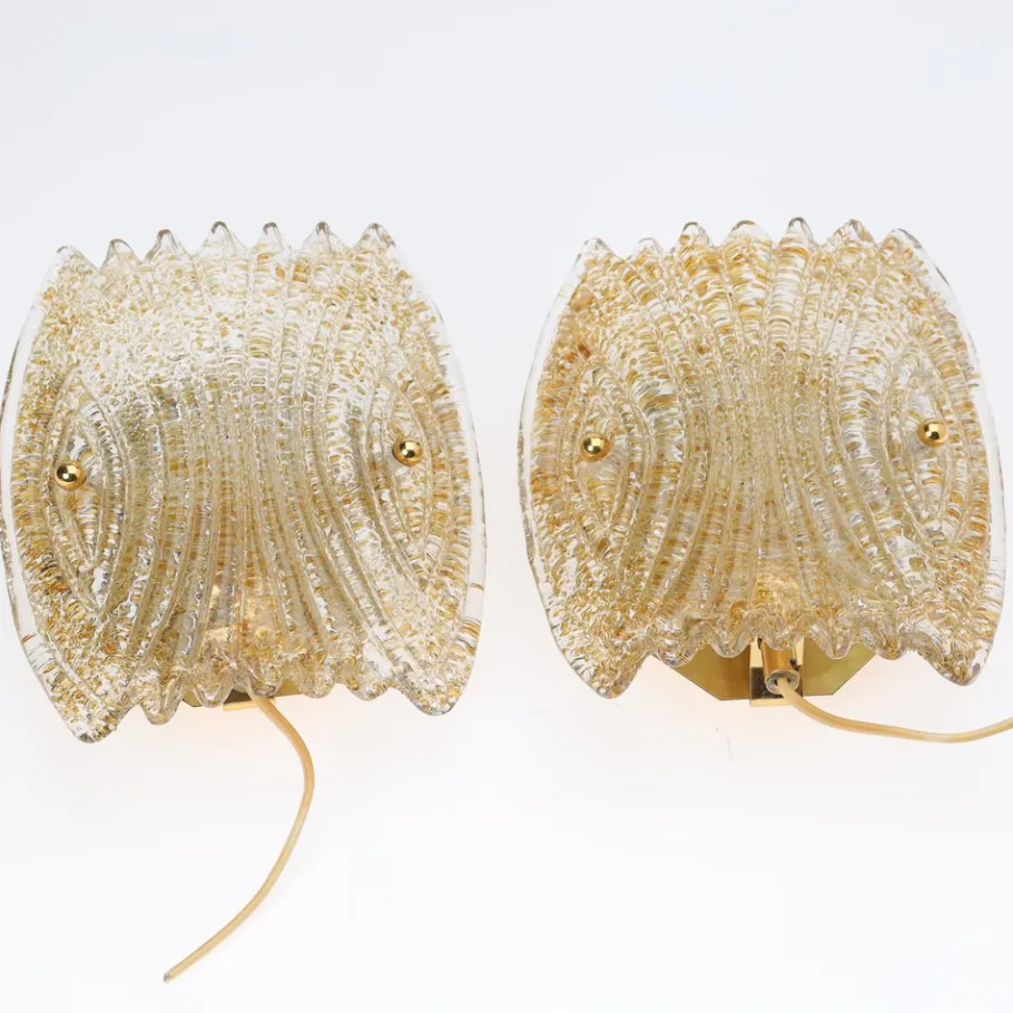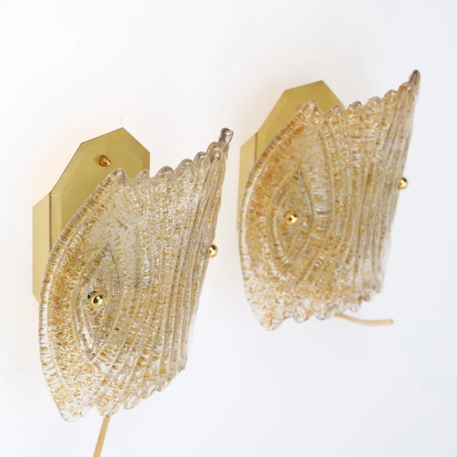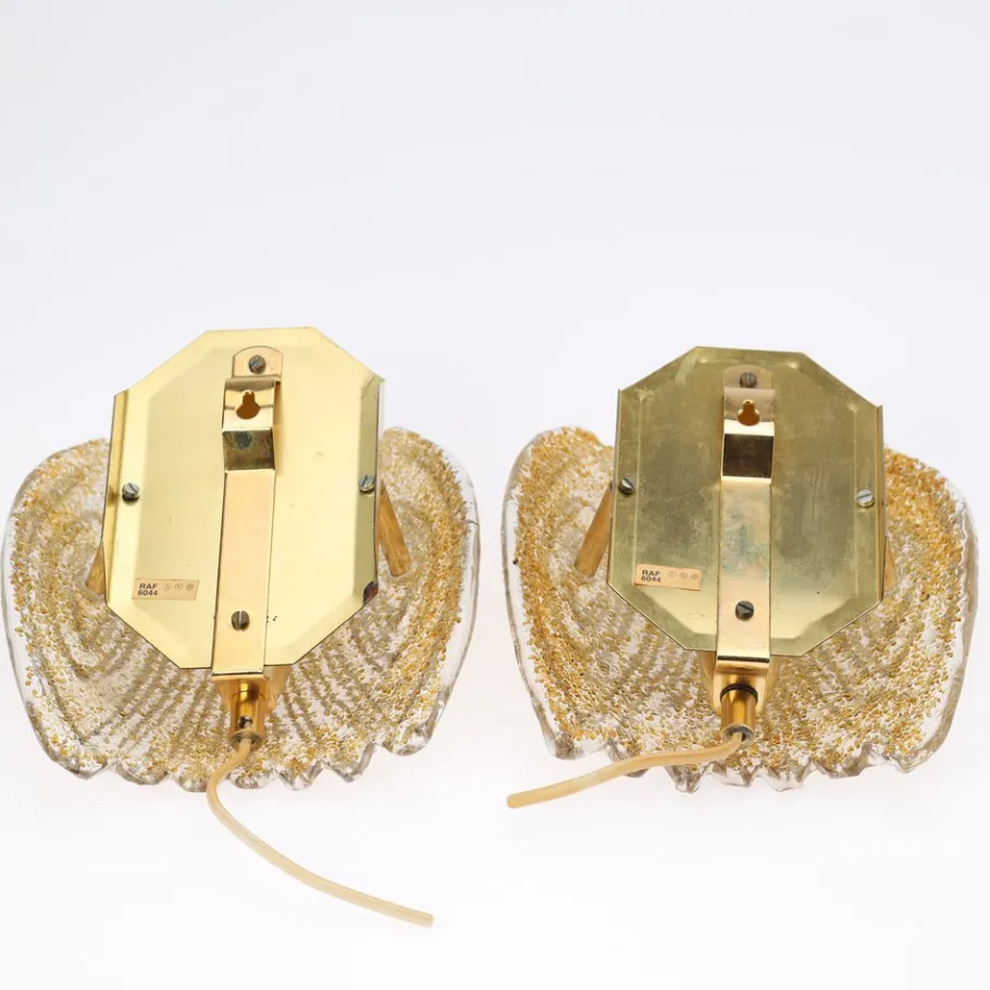 This pair of vintage wall sconces from Reijmyre Armaturfabrik (RAF), Sweden, exemplifies Scandinavian mid-century design. Crafted in the 1960s, these sconces feature glass with a decorative relief pattern on the front and a granulated back, elegantly mounted on gold-tone metal backplates. Each sconce is fitted with an E14 socket (bulbs not included), and both retains its original RAF 6044 label, confirming its authenticity.