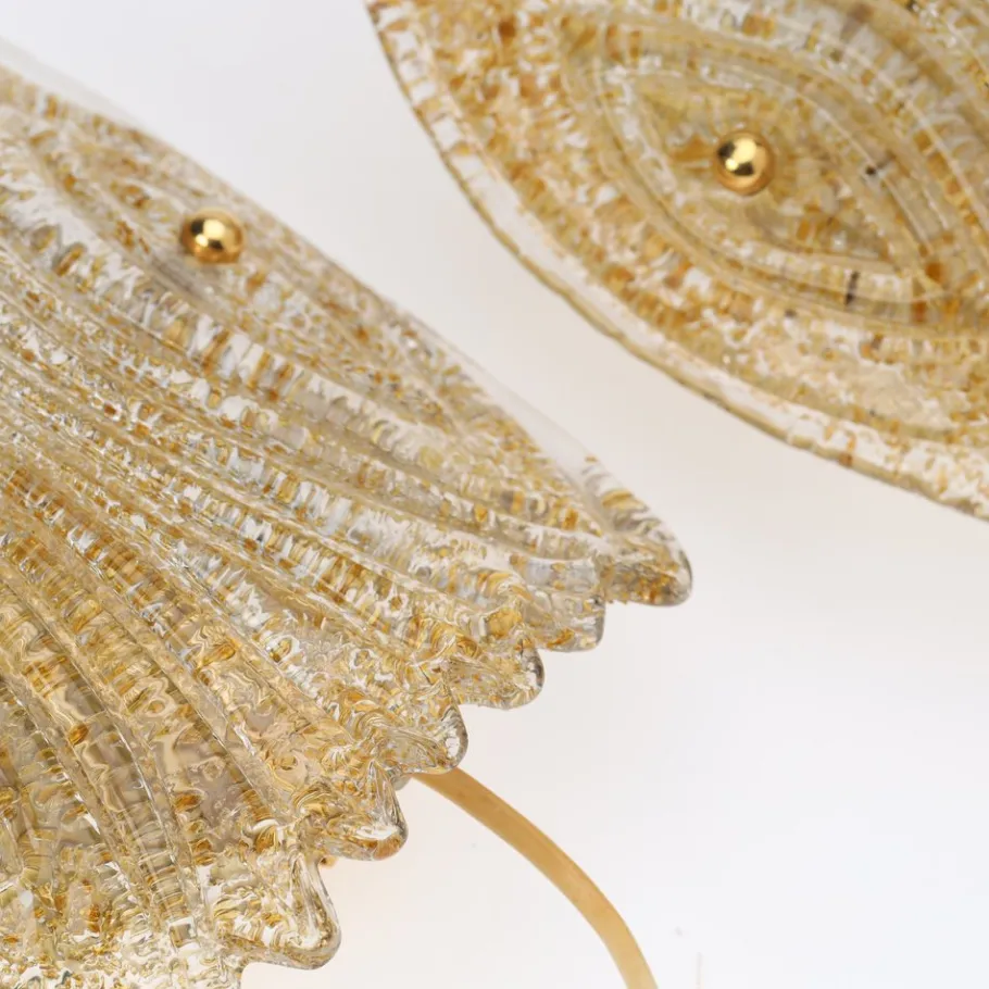 Highly unique and beautiful shape resembling a crest. Minute fragmentation of the glass with gold on the interior creates a diffused glow when switched on; the “rugiada” technique. The sconce attached to its backplate with two sweet brass ball screws.