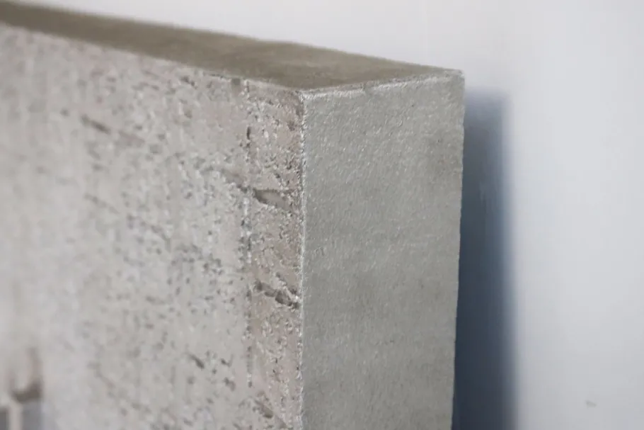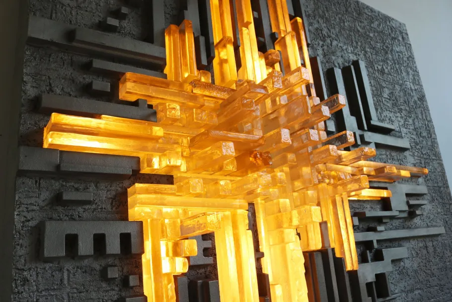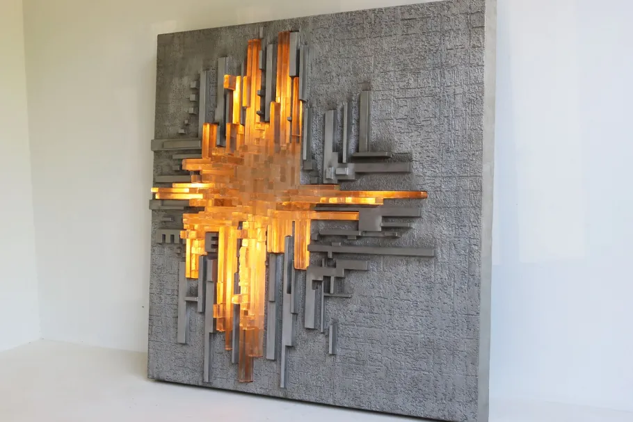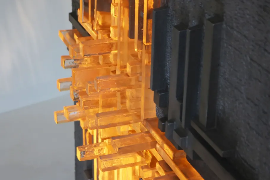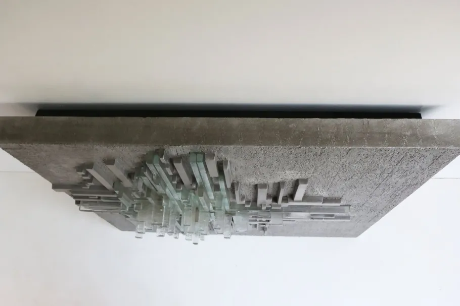 The lamp is masterfully crafted from cast aluminium with deeply textured brutalist patterns, into which strikingly large pieces of Murano glass are set. This bold interplay of raw metal and luminous glass gives the piece both a monumental presence and an atmospheric light effect, blurring the boundary between functional lighting and pure sculpture.