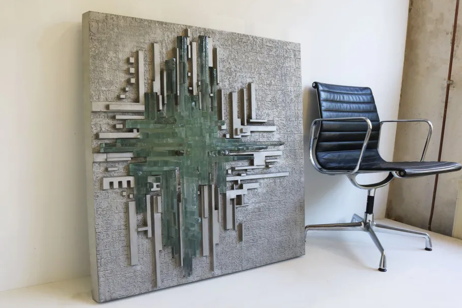 Its geometric force and material contrast embody the essence of Italian brutalism, while its craftsmanship reflects the artistic daring and innovation of the era. As both an illuminating fixture and a work of art, it is a statement piece for discerning collectors and design-focused interiors. This piece is a solid future investment with the highest quality in craftsmanship solid aluminium with hand-crafted Murano glass.