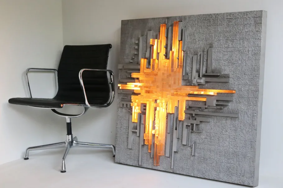 The piece remains in full original condition and is a treat to look at. A unique creation that is both a sculpture and a functioning light. The wall light comes with dimmable function.