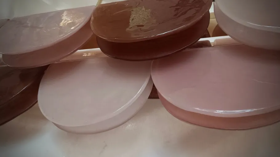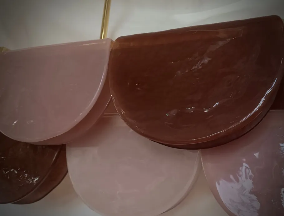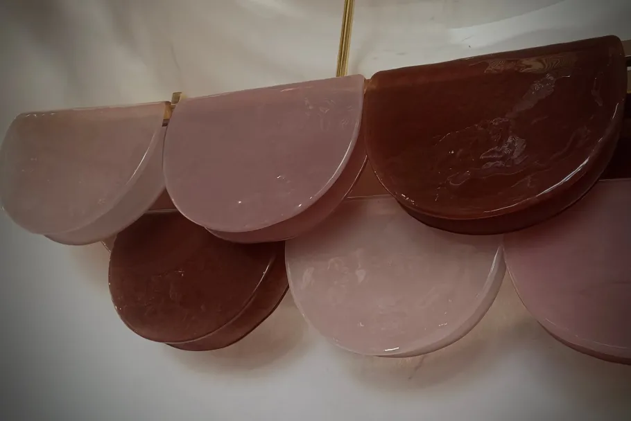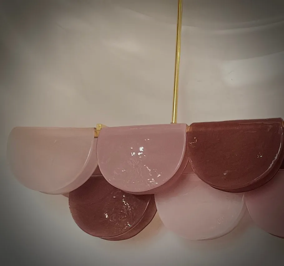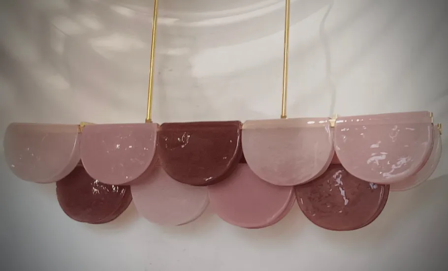 All in Murano glass with a brass structure. The glasses are treated with a special procedure that gives them a lively surface. As you can see from the photos, its color is a beautiful shade of pink that goes from light to dark. The chandelier is made up of three parallel brass strips on which LED strips are attached, half-moon glasses are placed on top. It is a beauty to see it lit because it releases all its elegance. Refinement and style as is in the Murano style, unique pieces that always remain precious.