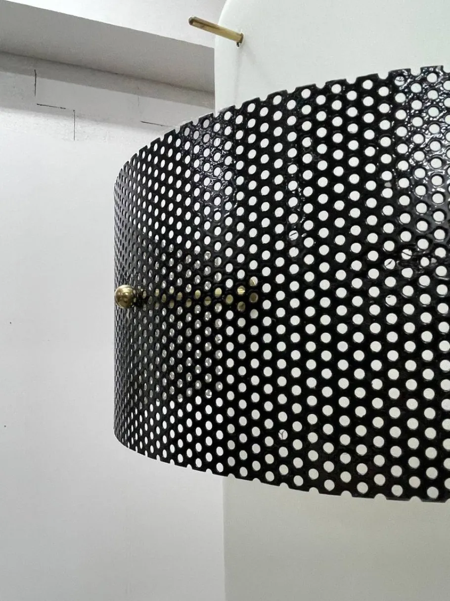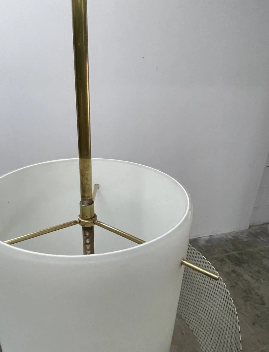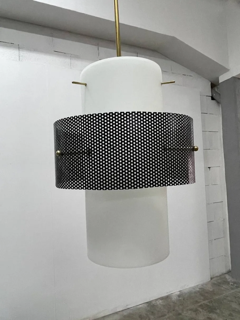 Stilux chandelier with brass frame, perfectly intact cylindrical satin-finish glass diffuser, and black-painted aluminum mesh. Original period wiring. Fits a bulb with a large socket.