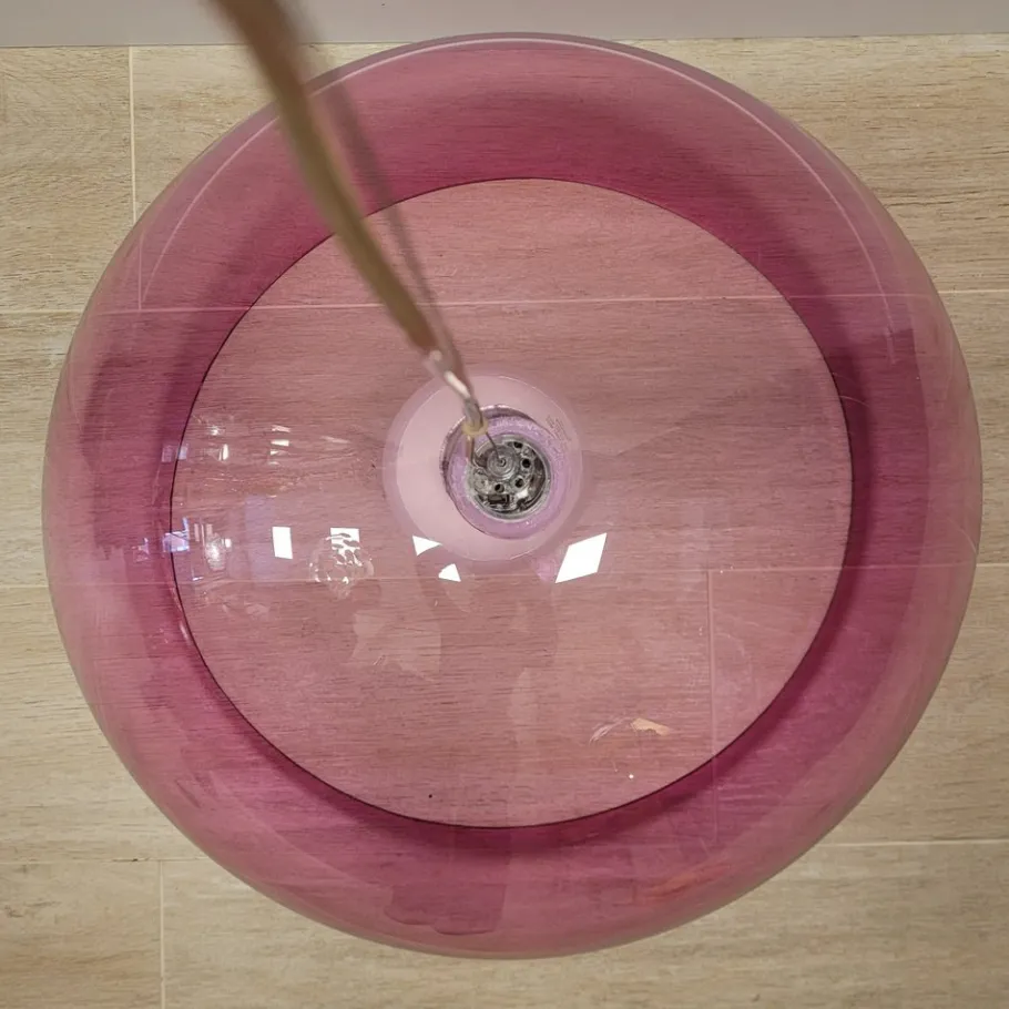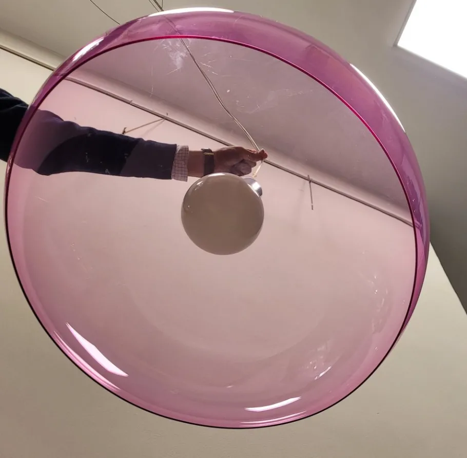The particular transparency of the material and the brightness of the colors reminds the flashes produced by a soap bubble with the light reflexes. In addition, the screen shape is not perfectly halfpheric, but the intersection plane is a bit below the height of the diameter, to collect the greatest amount of light. Ferruccio’s unique and pioneer design makes this lamp an exclusive and modern product.