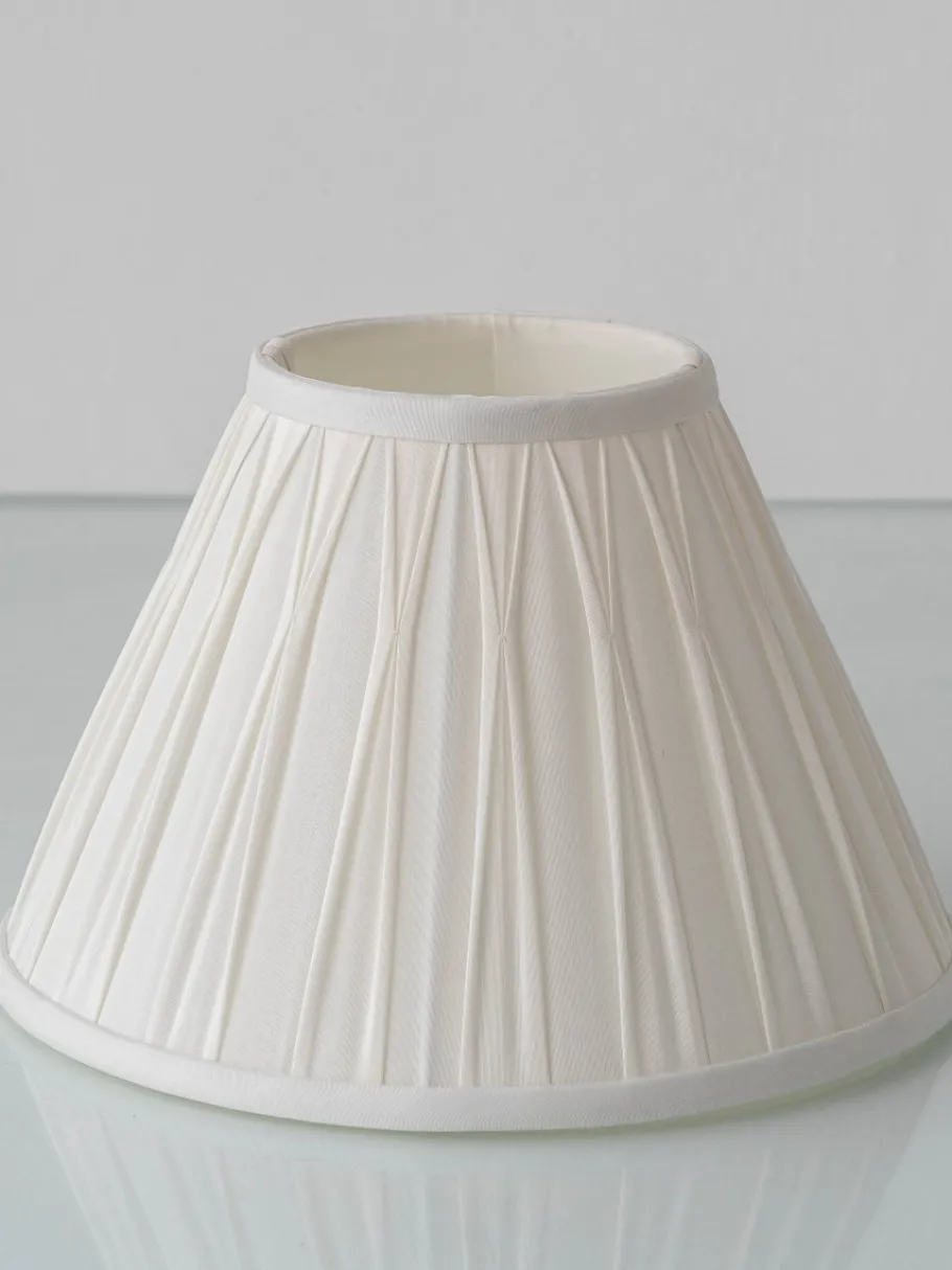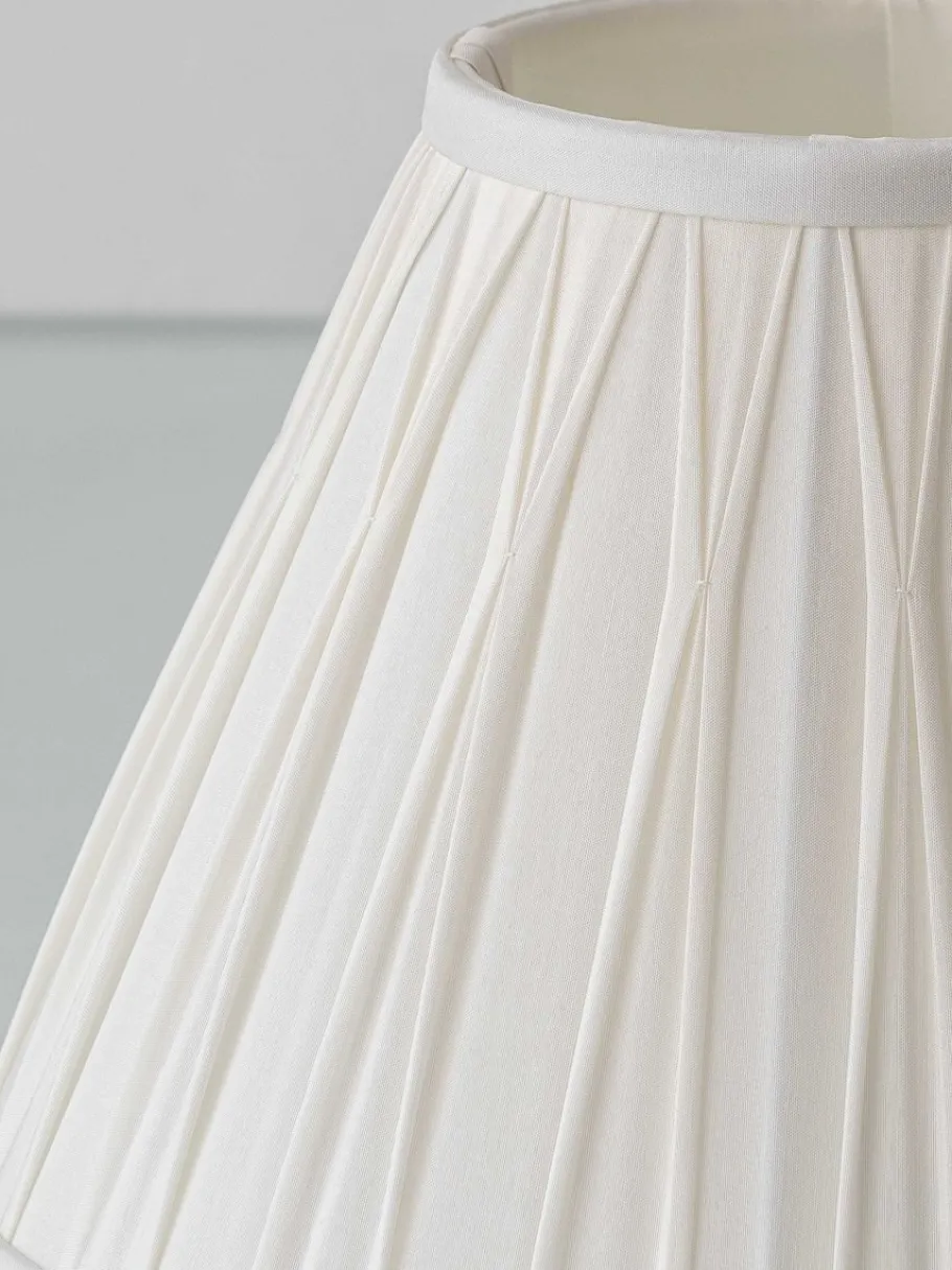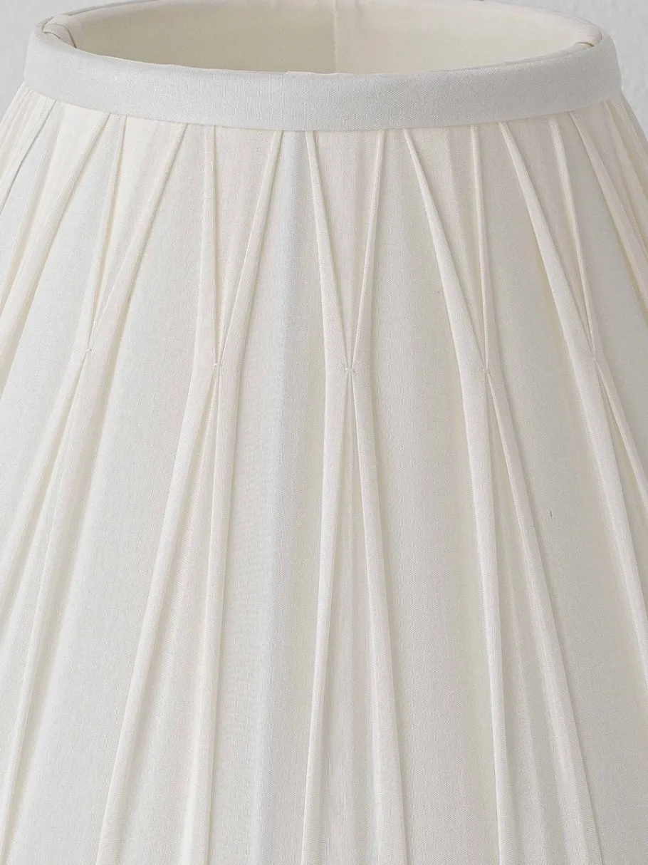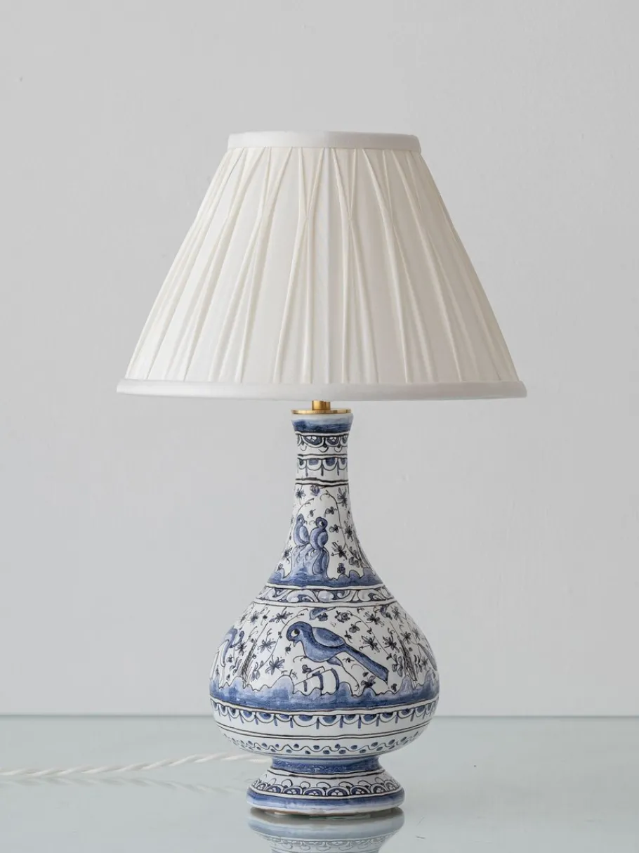Paired with a new pleated white silk shade, the lamp offers a soft, beautiful light. Its versatile palette suits coastal, classic, and eclectic interiors, while the playful folkloric motifs add warmth and charm to any room, perhaps even a nursery or children’s room.