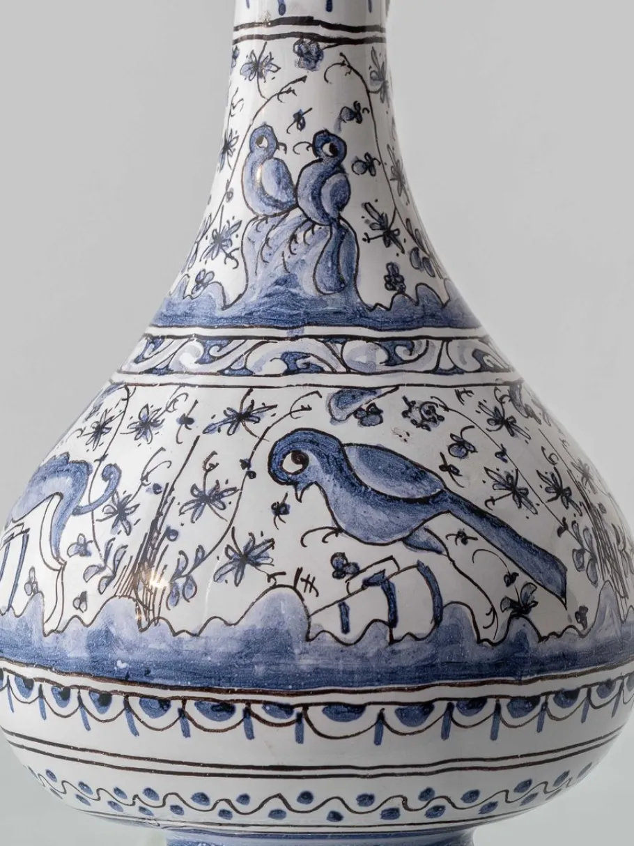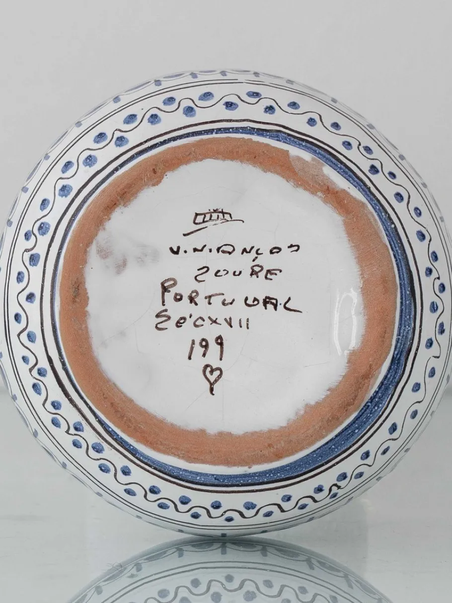 The vase is hand-signed V.N. Anços / Soure / Portugal / Sec. XVII / 199, a mark typical of mid-20th-century workshops in the Coimbra district known for their revival wares. These motifs—playful animals, ornamental borders, and dotted “moscas”—connect the piece to centuries of Iberian ceramic tradition.