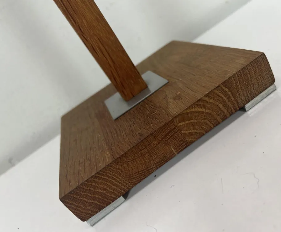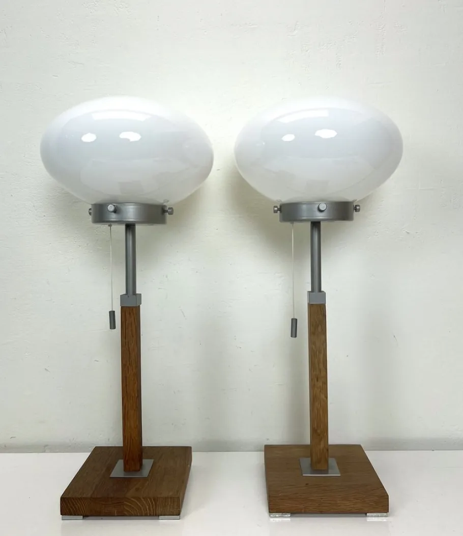 The lamps have a solid wooden base and mouth-blown mushroom shaped glass (opaline) spheres which spreads a very atmospheric light. (A minimal color difference in the mouth-blown glass)