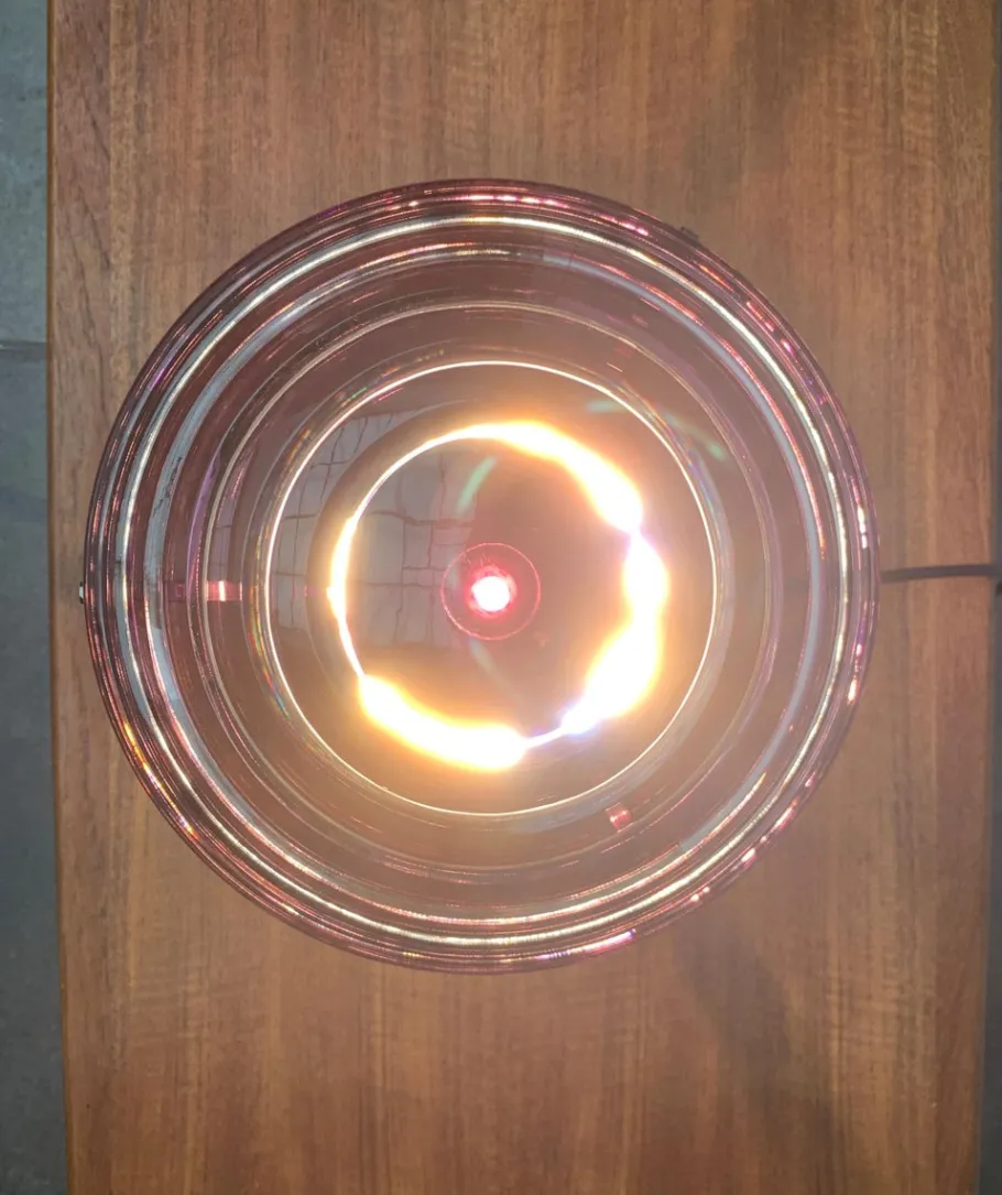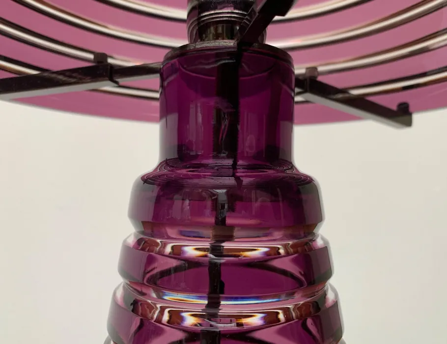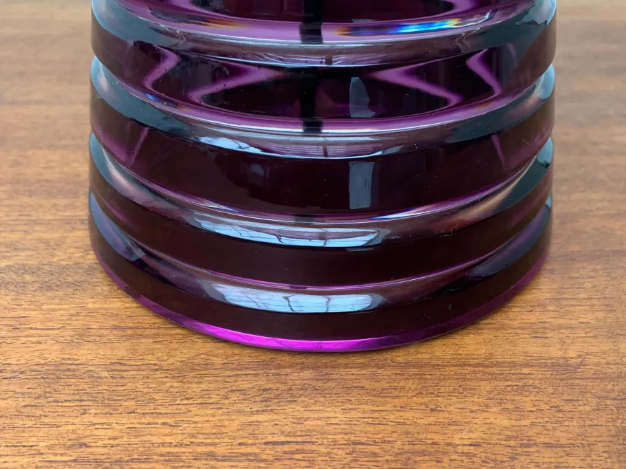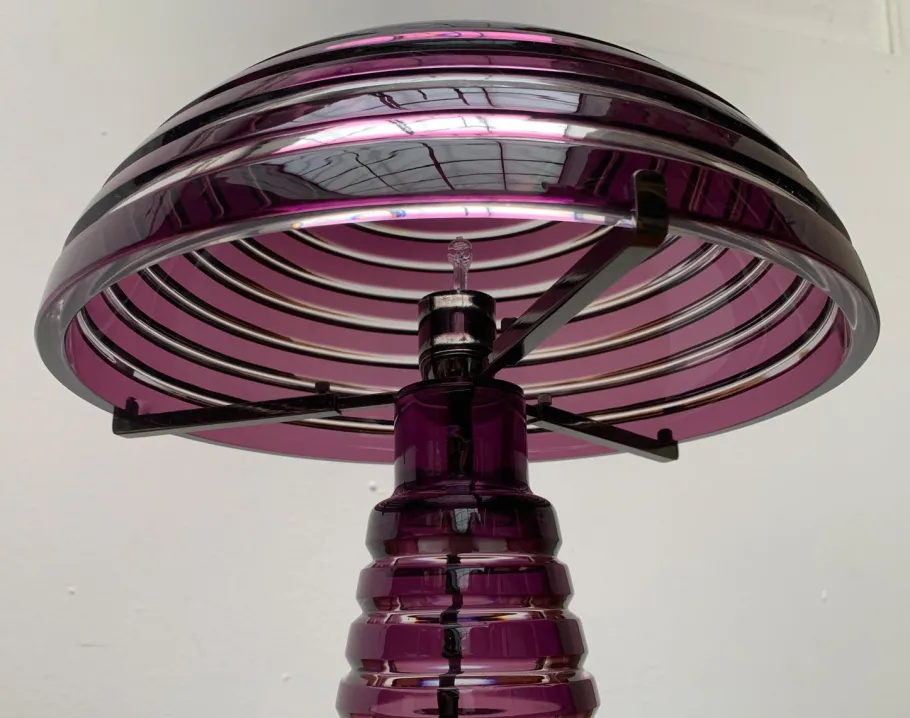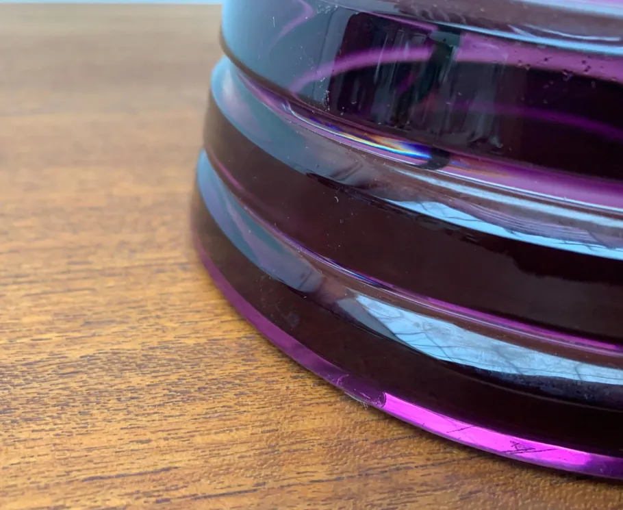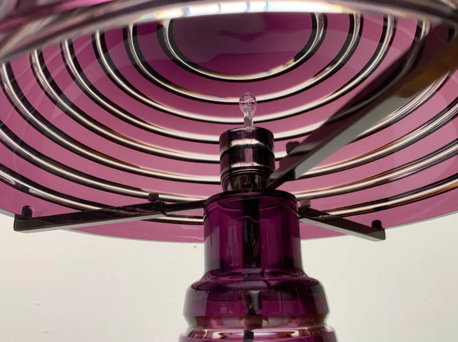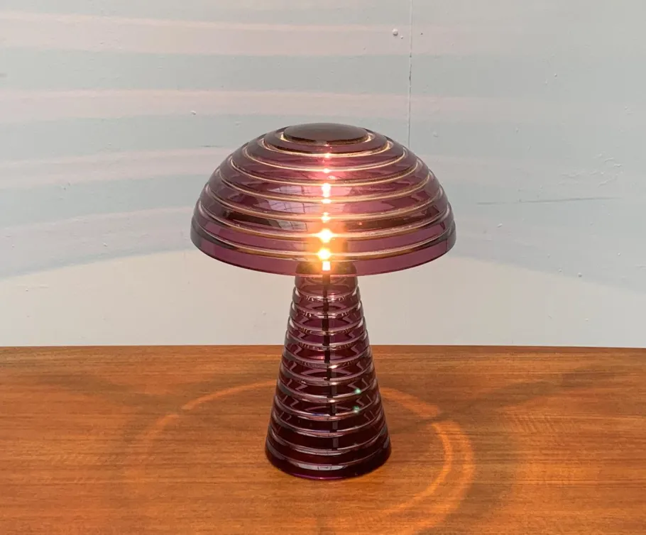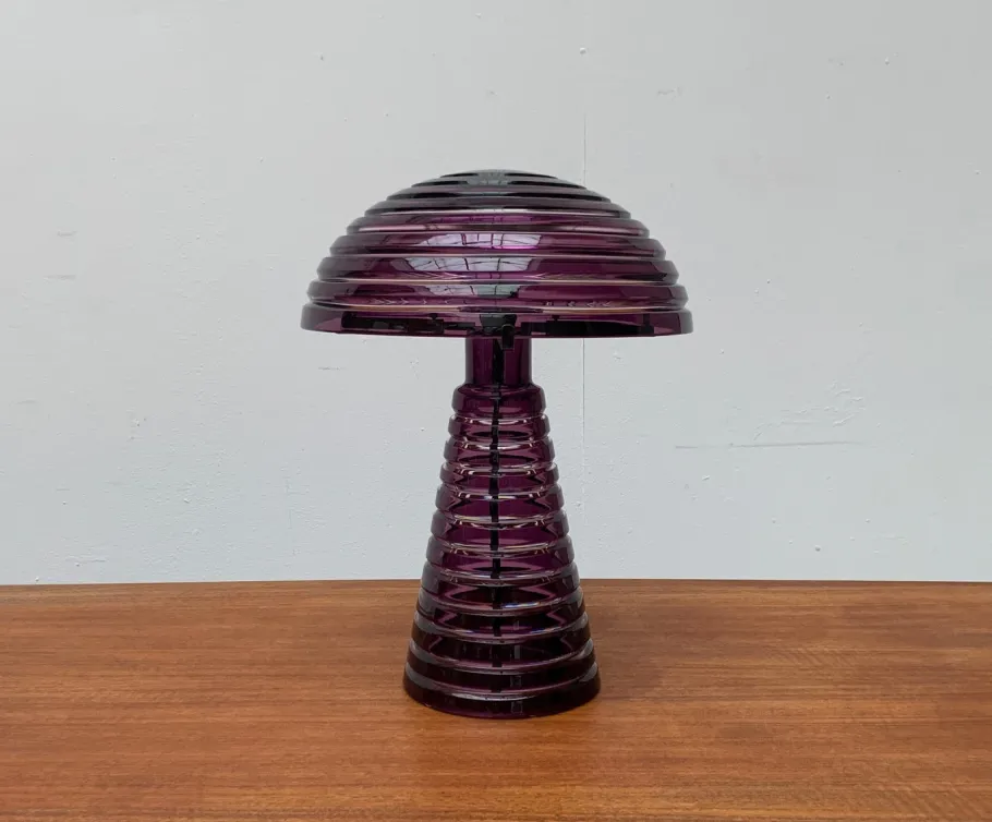 Screen and foot of the luminaire are made of colored glass and show a circumferential groove structure. In contrast to the violet glass surfaces, the groove is clearly executed and let the light differ slightly. The foot is cone-shaped. At the upper end, the sitting sitting on the radially three arms depart and on which the dome-shaped screen is located. A complex circuit switch can switch two brightness levels. The transformer is integrated in the plug.