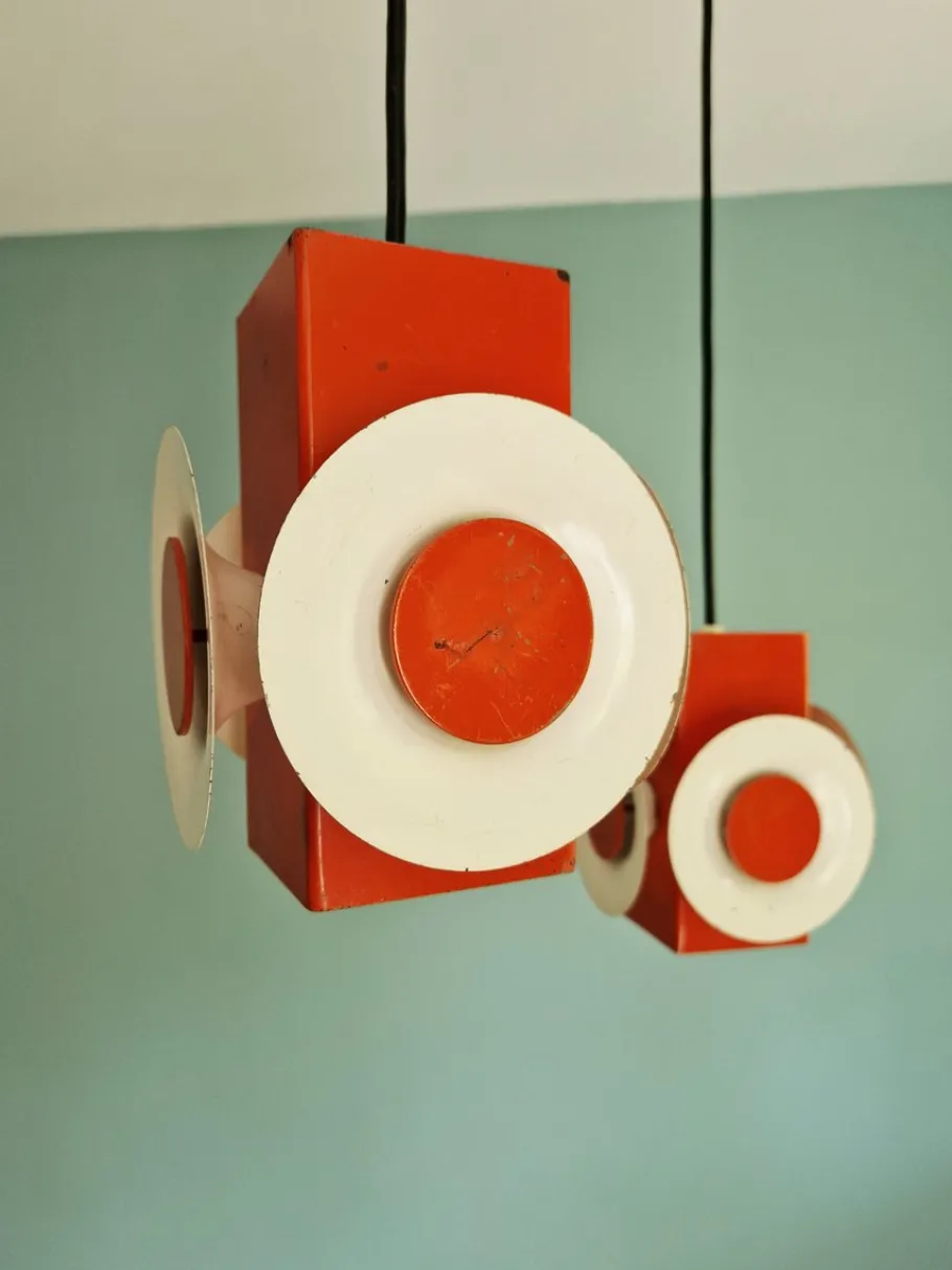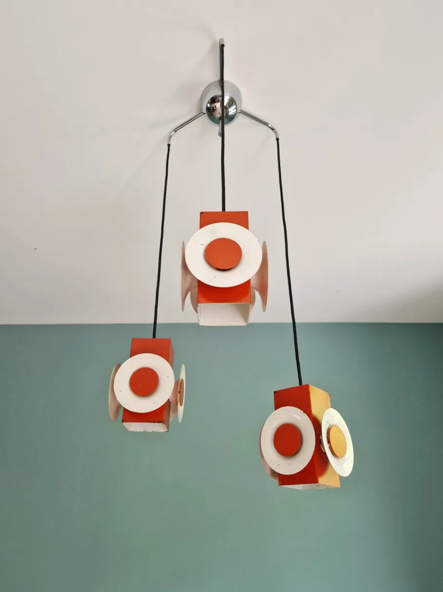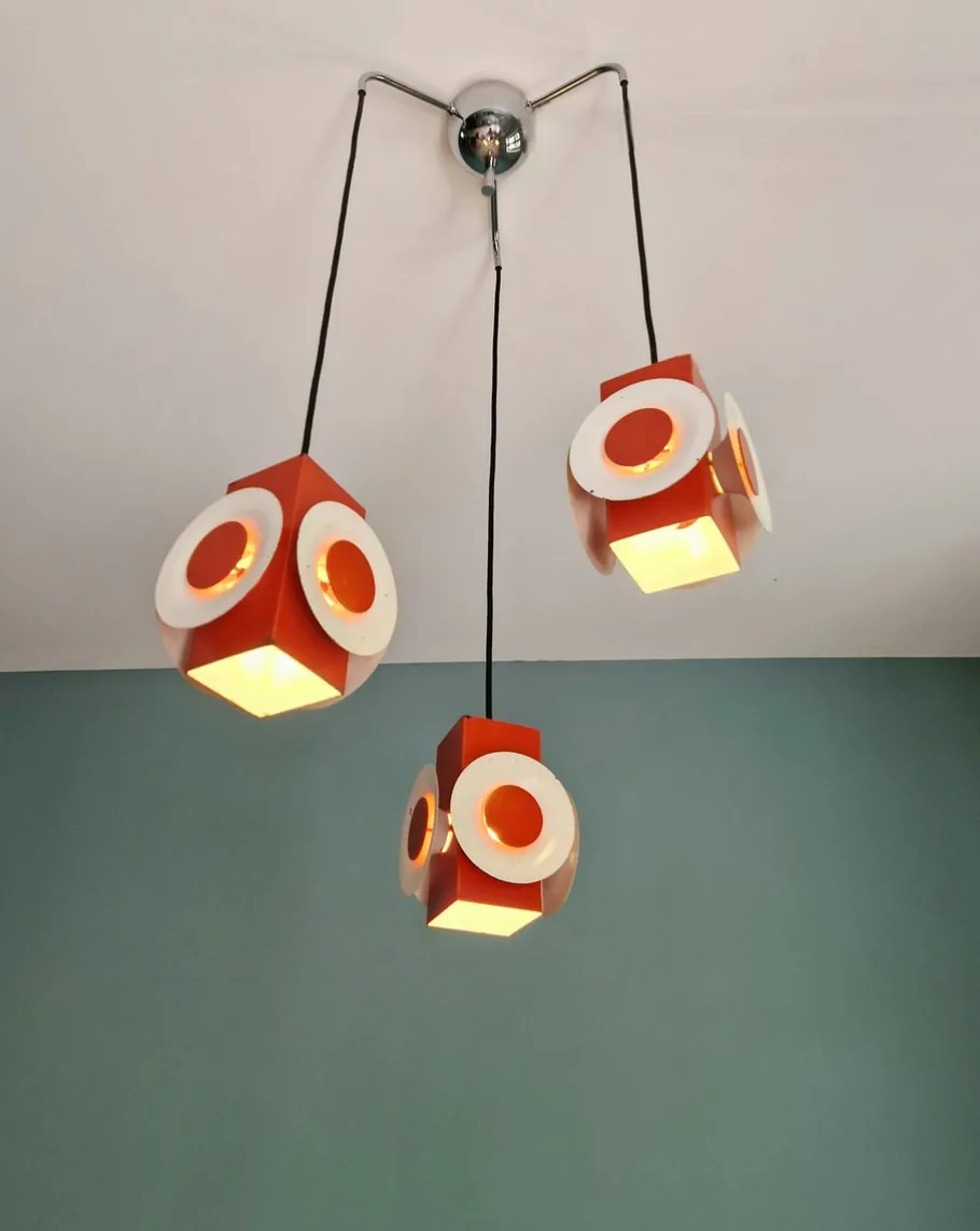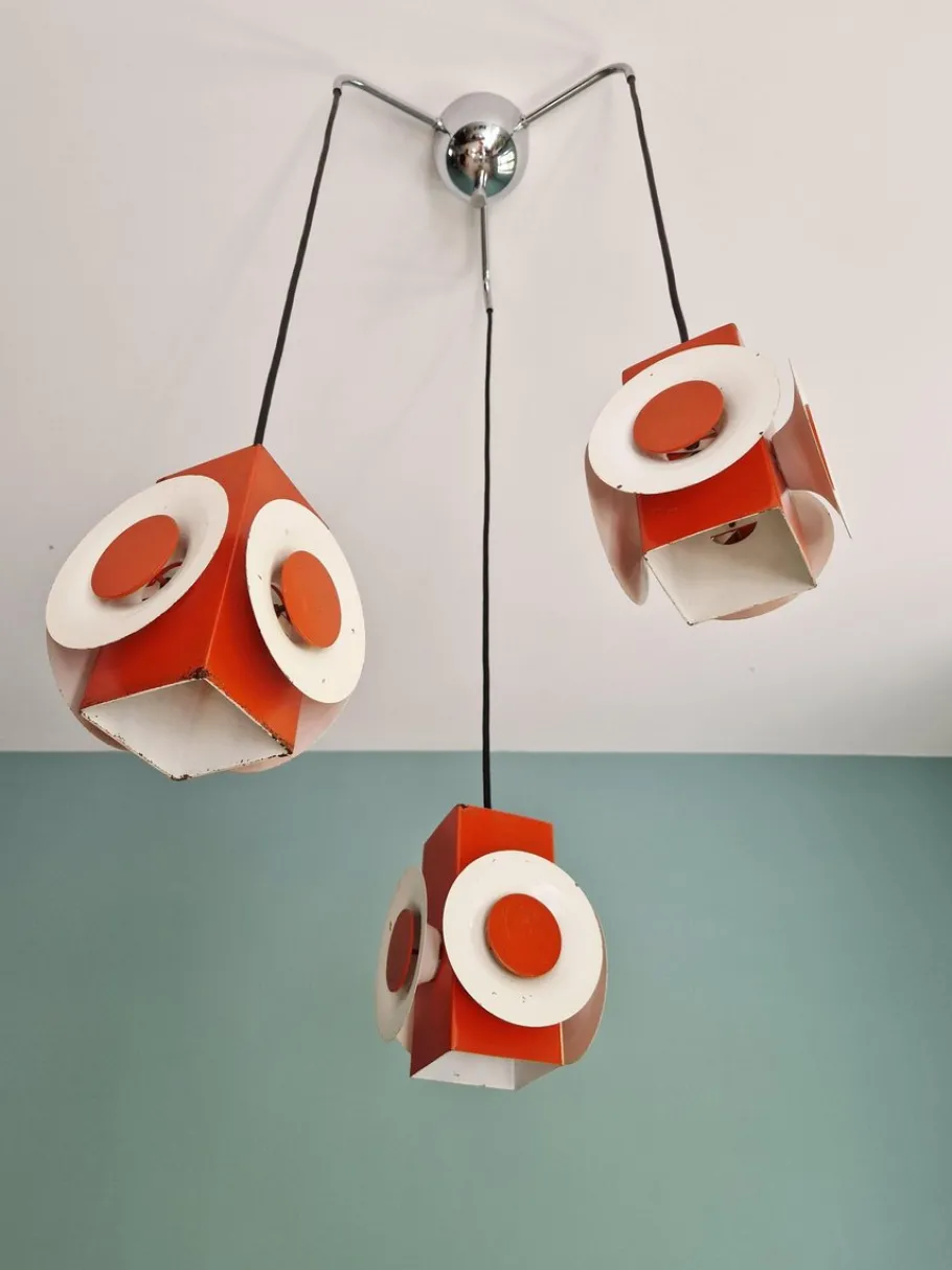 This chandelier features a chrome-plated metal frame and three orange and white lacquered metal shades.
