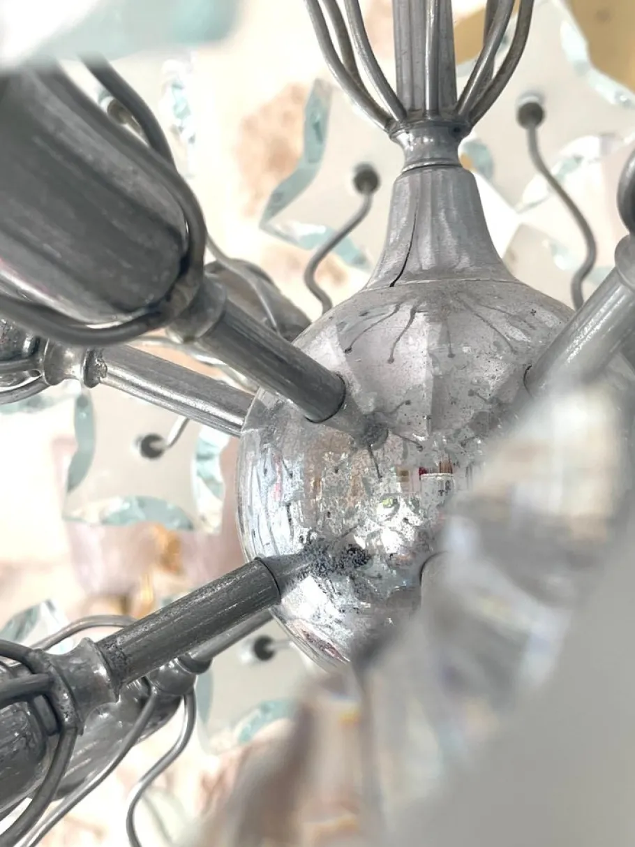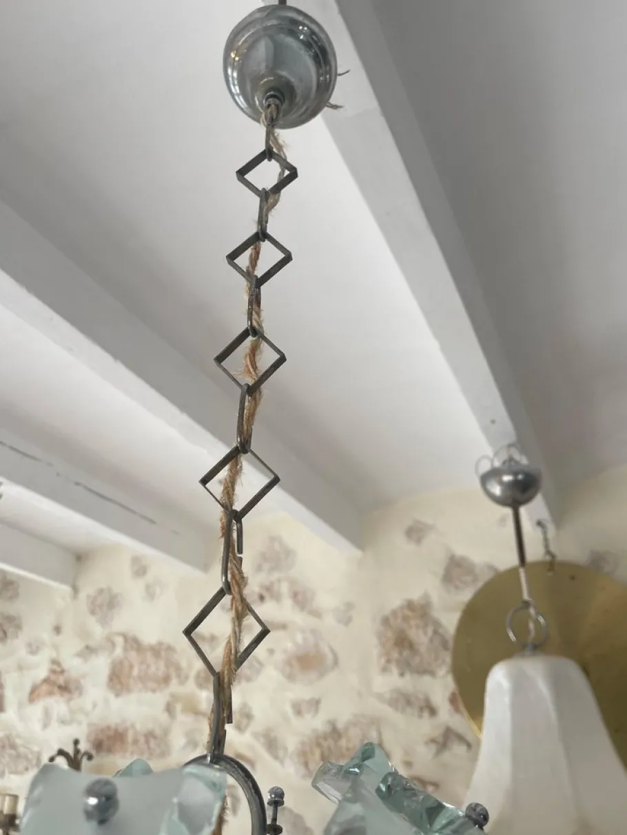 Despite its vintage status, this chandelier is in excellent condition and fully functional, requiring three E14 bulbs to create a warm and welcoming ambiance. with a maximum length of 90cm and a weight of 7 kg, it makes a substantial yet gracefully sophisticated addition to your interior. The metal has a natural patina. Discover the enduring beauty and artistry of Fontana Arte through this exceptional vintage Sputnik chandelier. It is a true work of art that adds a touch of Italian elegance to any decor.