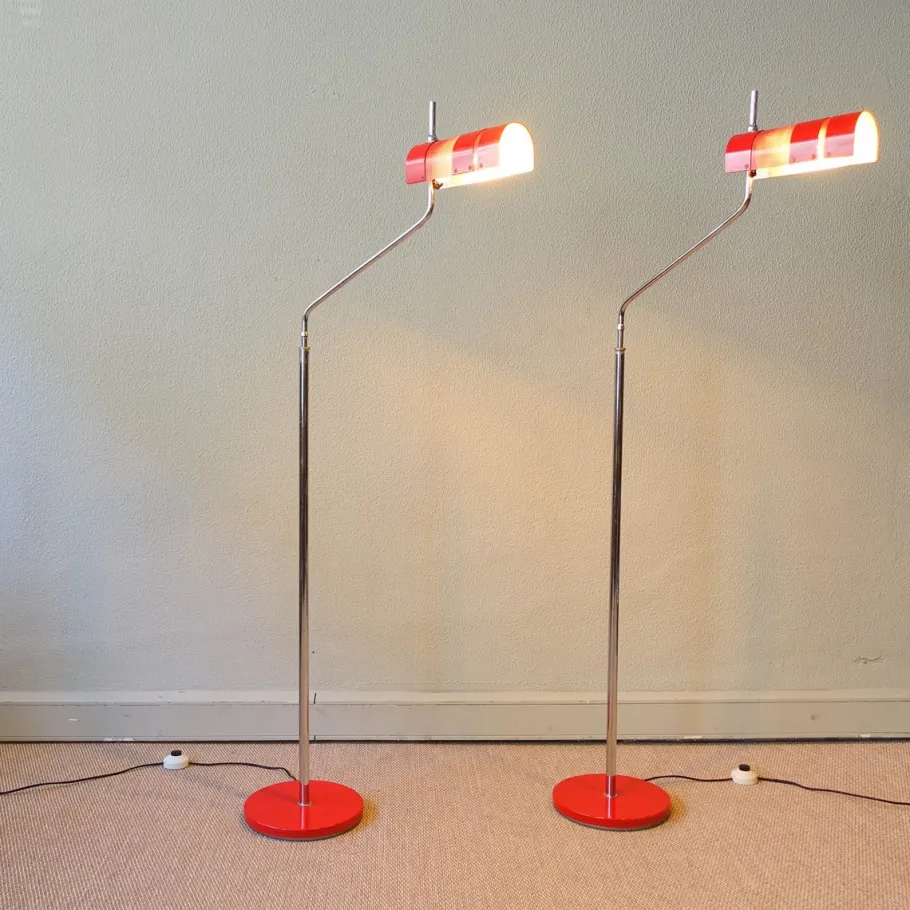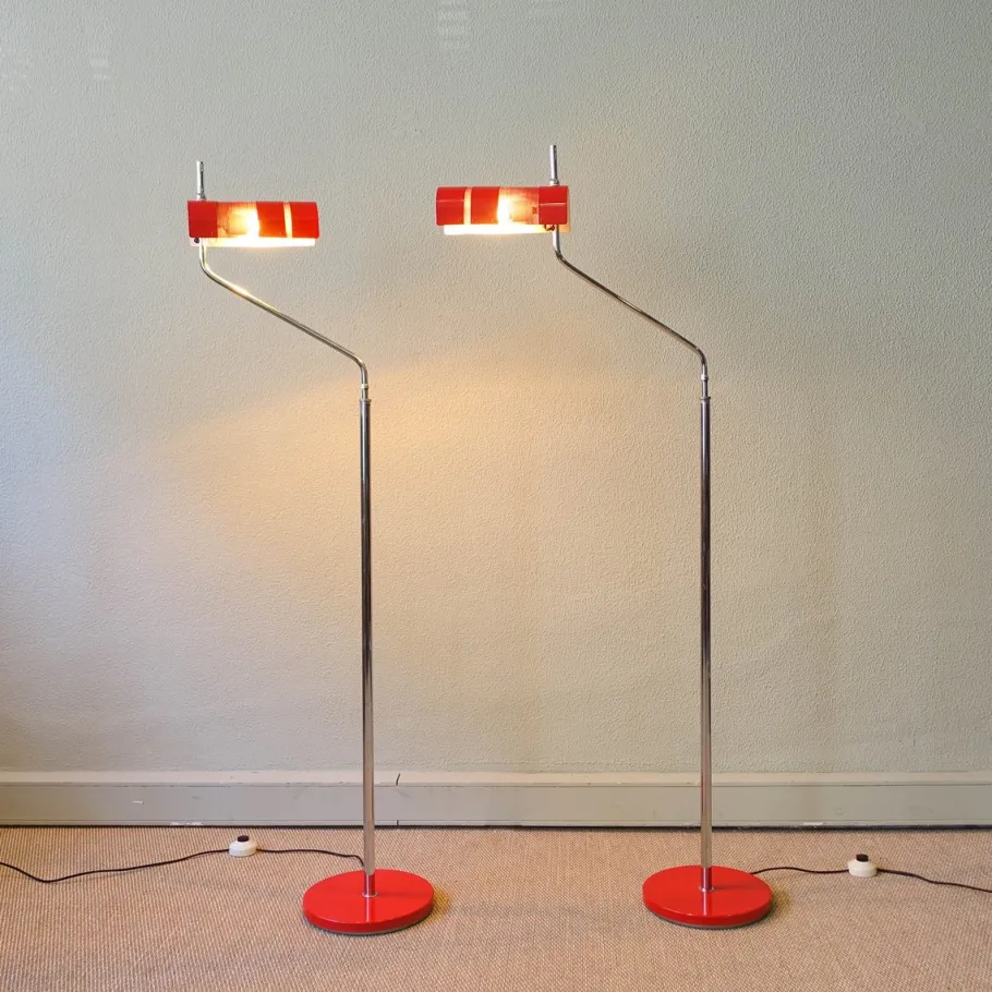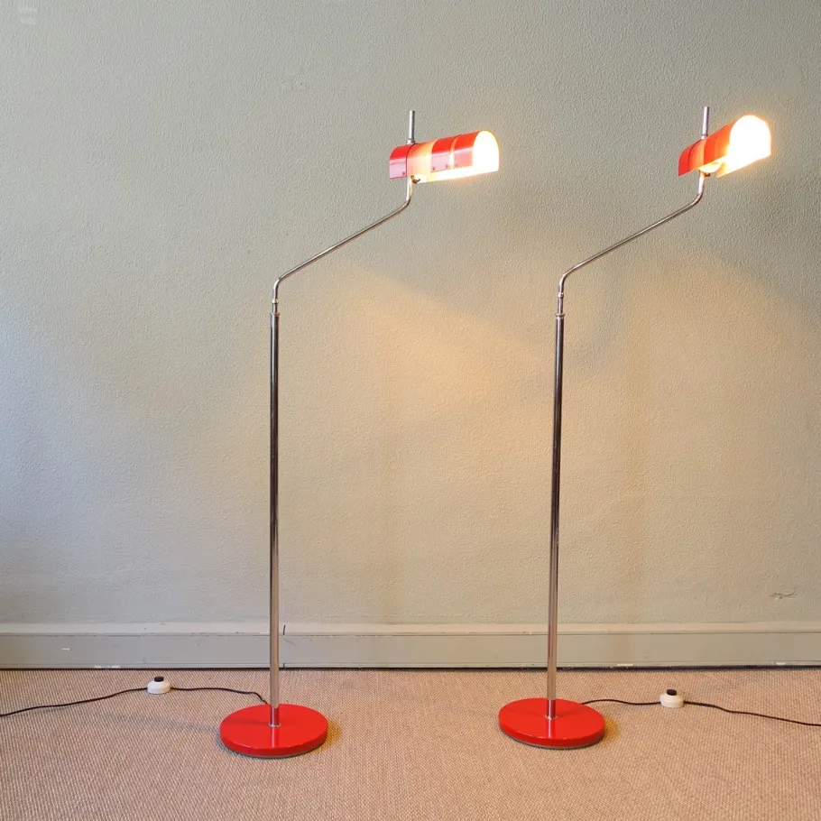 It features a red shade and base with polished chrome arm. It is has a swivel shade and the arm rotates completely. It can also be adjusted by height. In an very good vintage condition.