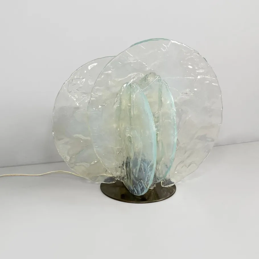Table lamp model 335 with a brushed copper base. The frame is composed of perfectly matched Murano glass discs. The iridescent opaline glass pieces fit together thanks to the grooves.