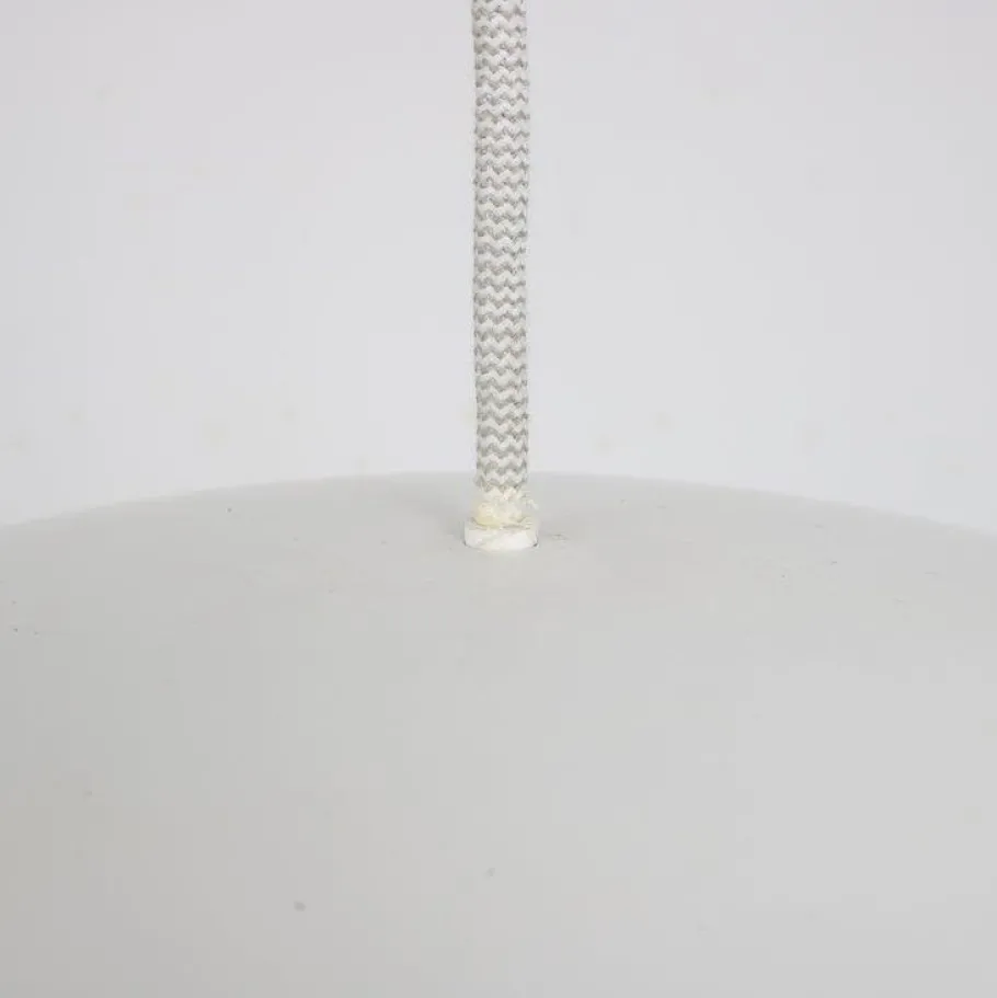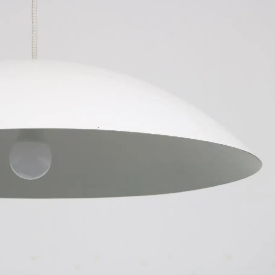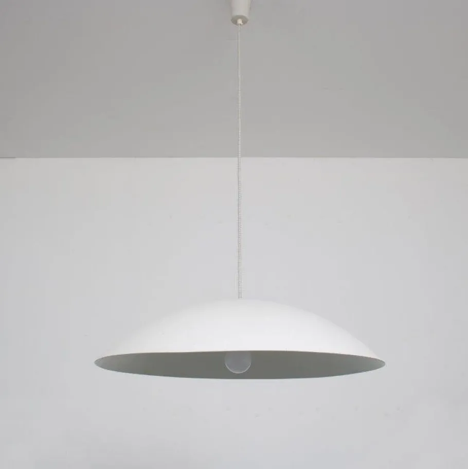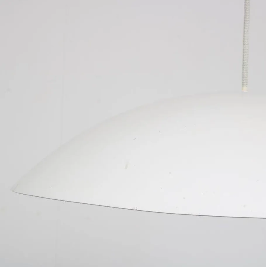 This is an elegant, modern design with a lovely round, minimalist shape. Made of high quality white lacquered metal, allowing the piece to seamlessly fit into many different decors. The white fabric cable keeps the harmony in the design. All together, ads a subtle touch of modernist luxury to the interior while emitting a bright, downwards light. This makes the piece most suitable for a dining room, living area or any space looking for some nice additional light and atmosphere. A beautiful find of mid-century Scandinavian design!