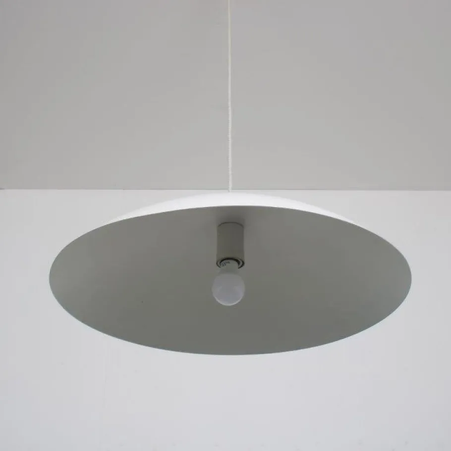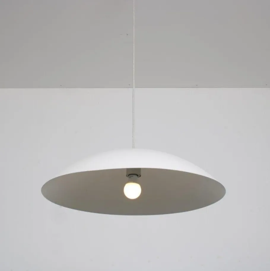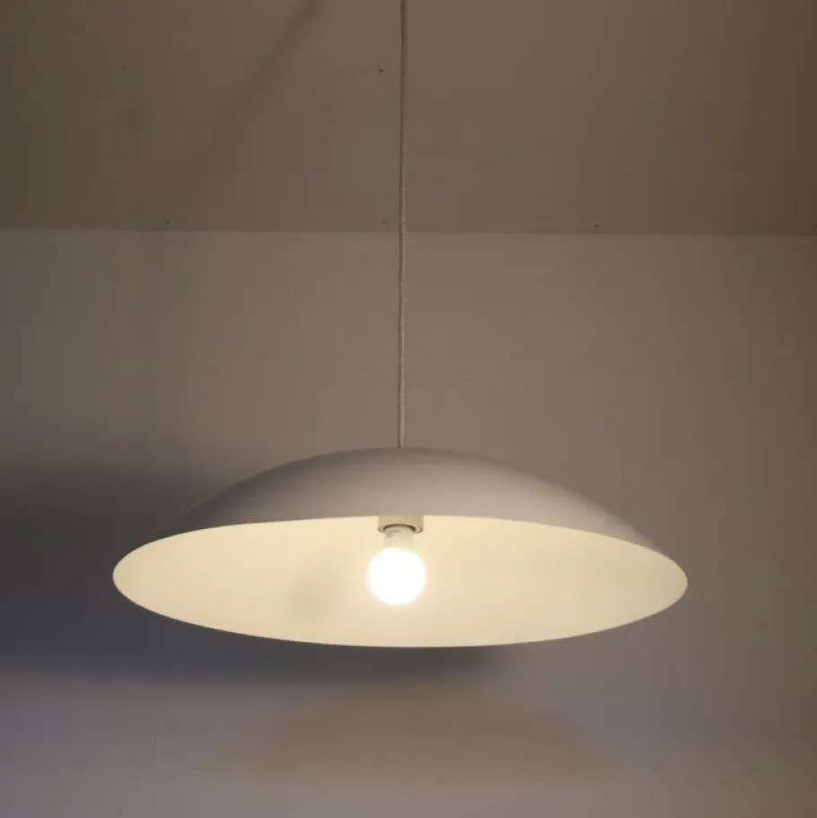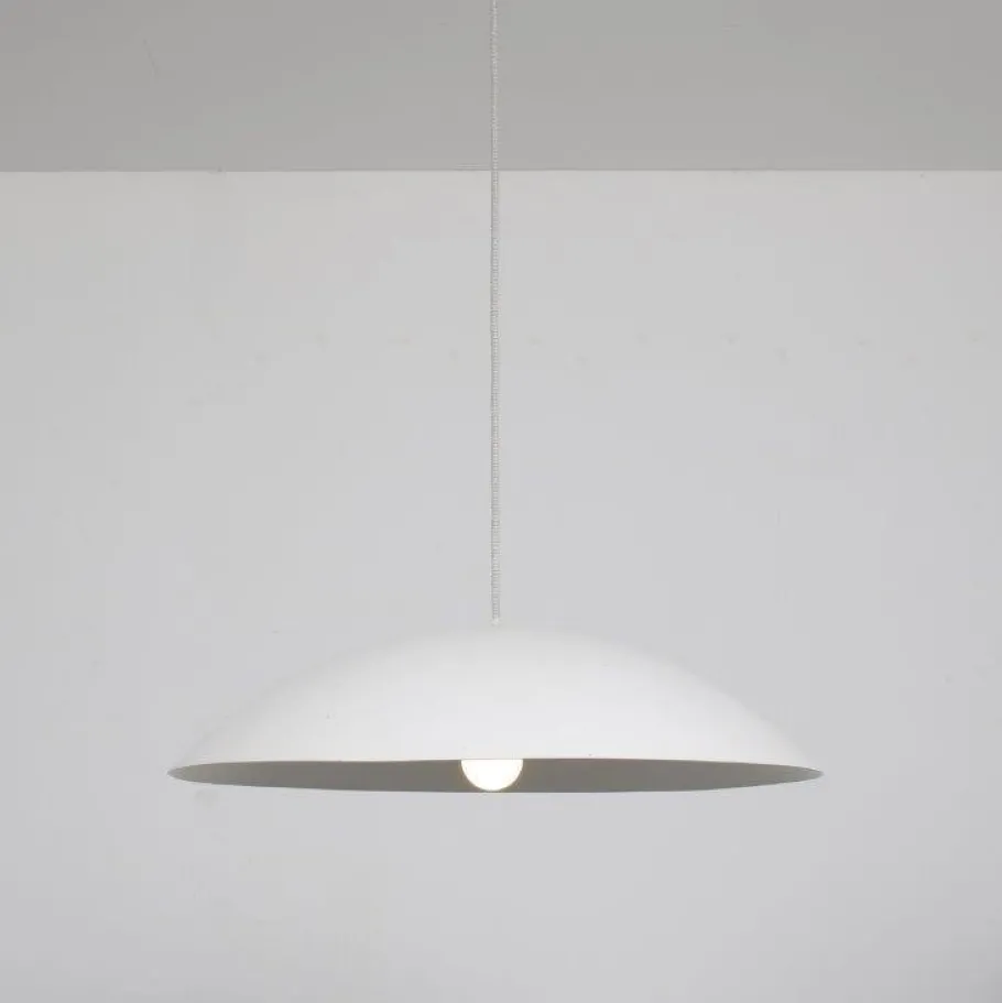This is an elegant, modern design with a lovely round, minimalist shape. Made of high quality white lacquered metal, allowing the piece to seamlessly fit into many different decors. The white fabric cable keeps the harmony in the design. All together, ads a subtle touch of modernist luxury to the interior while emitting a bright, downwards light. This makes the piece most suitable for a dining room, living area or any space looking for some nice additional light and atmosphere. A beautiful find of mid-century Scandinavian design!