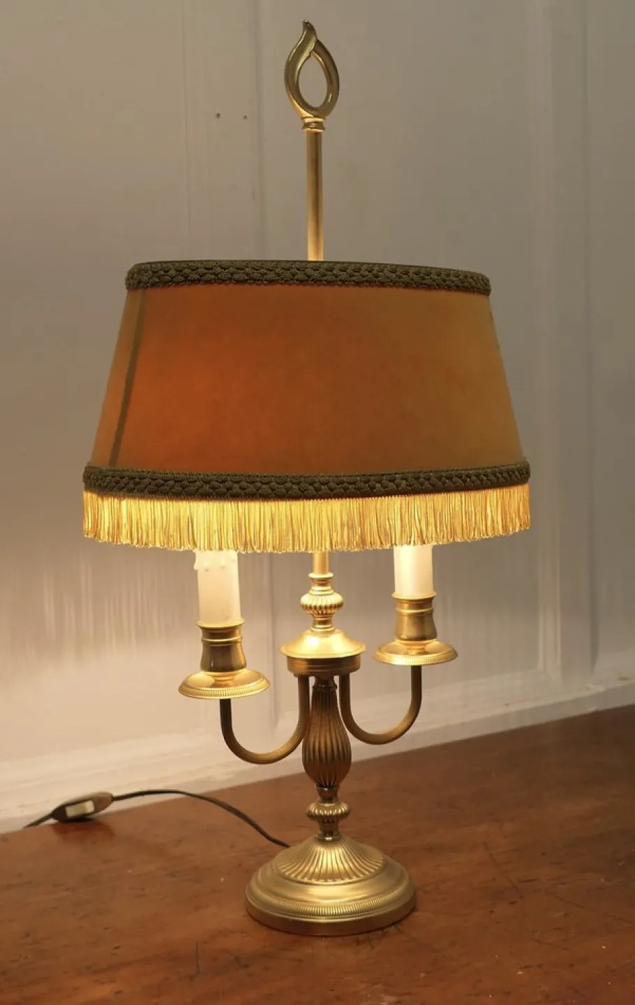 A lovely piece, a brass twin sconce lamp with its original velvet fringed shade