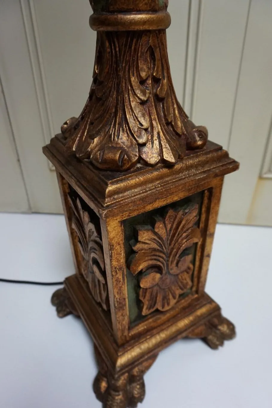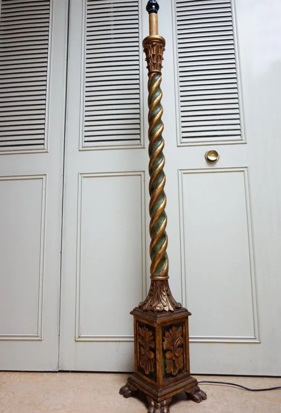 – The lamp features Baroque motifs such as C-scrolls and acanthus leafs and other Baroque motifs with a twisted spiral column form finishing on a rectangular base with carved claw feet