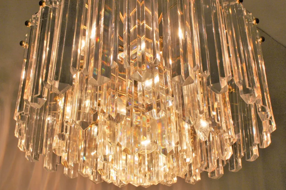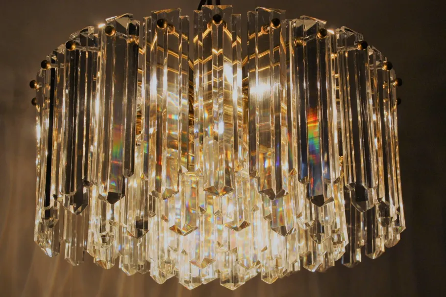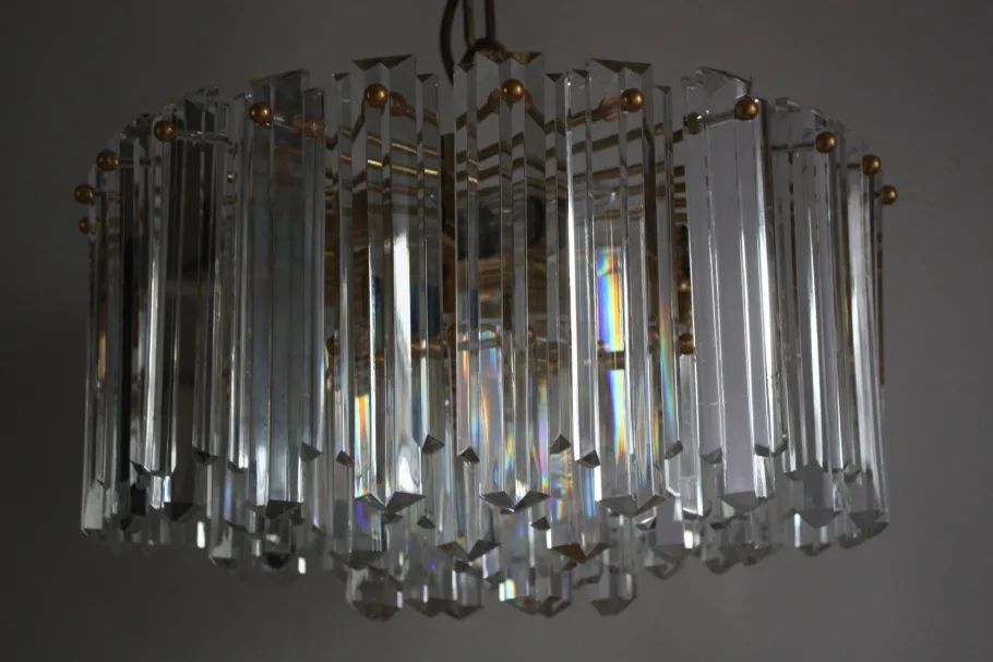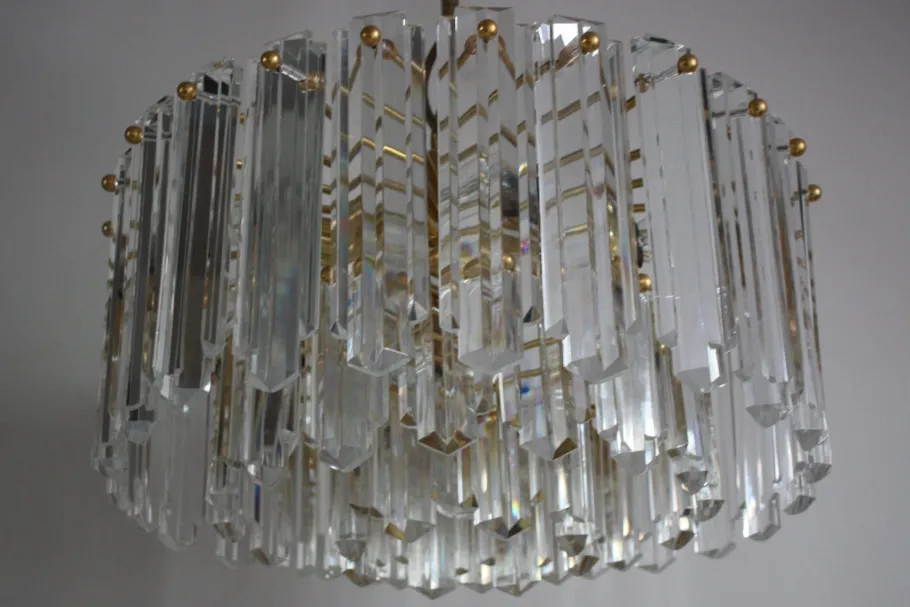 – Twelve-light gilt brass frame suspended with 44 thick cut crystal elements