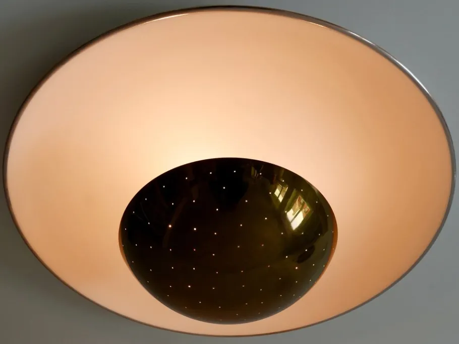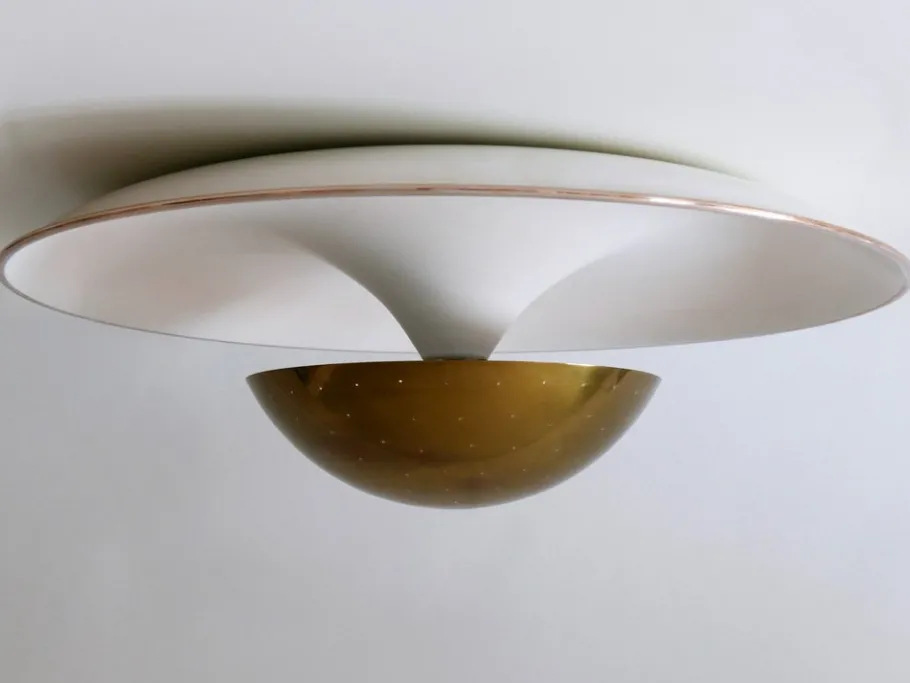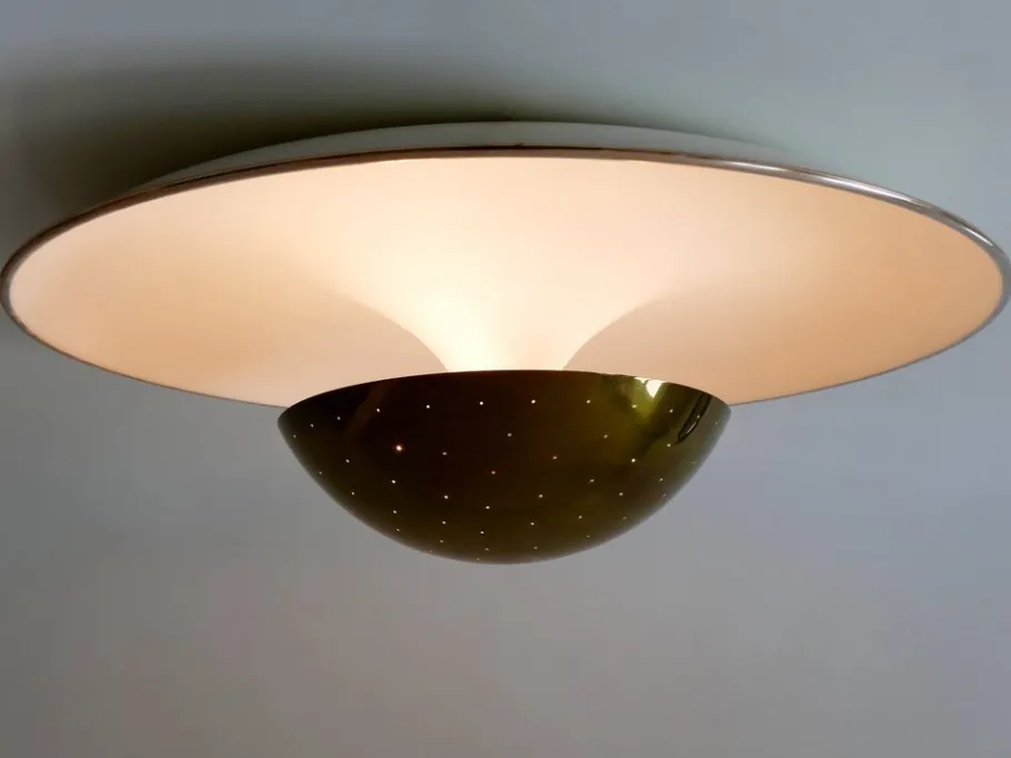 Executed in perforated brass and painted aluminium, the lamp comes with 3 x E27 Edison screw fit bulb holders, is wired and in working condition. It runs both on 110/230 Volt.