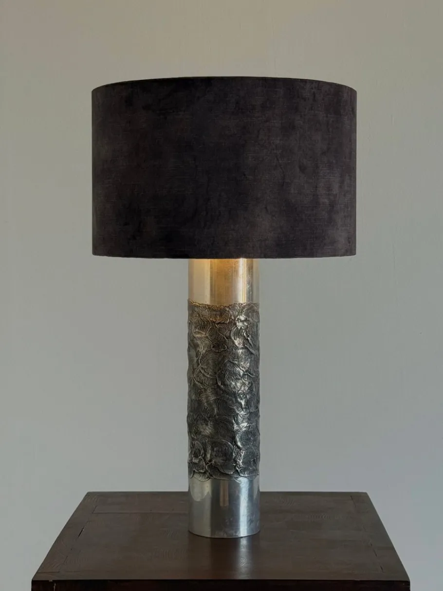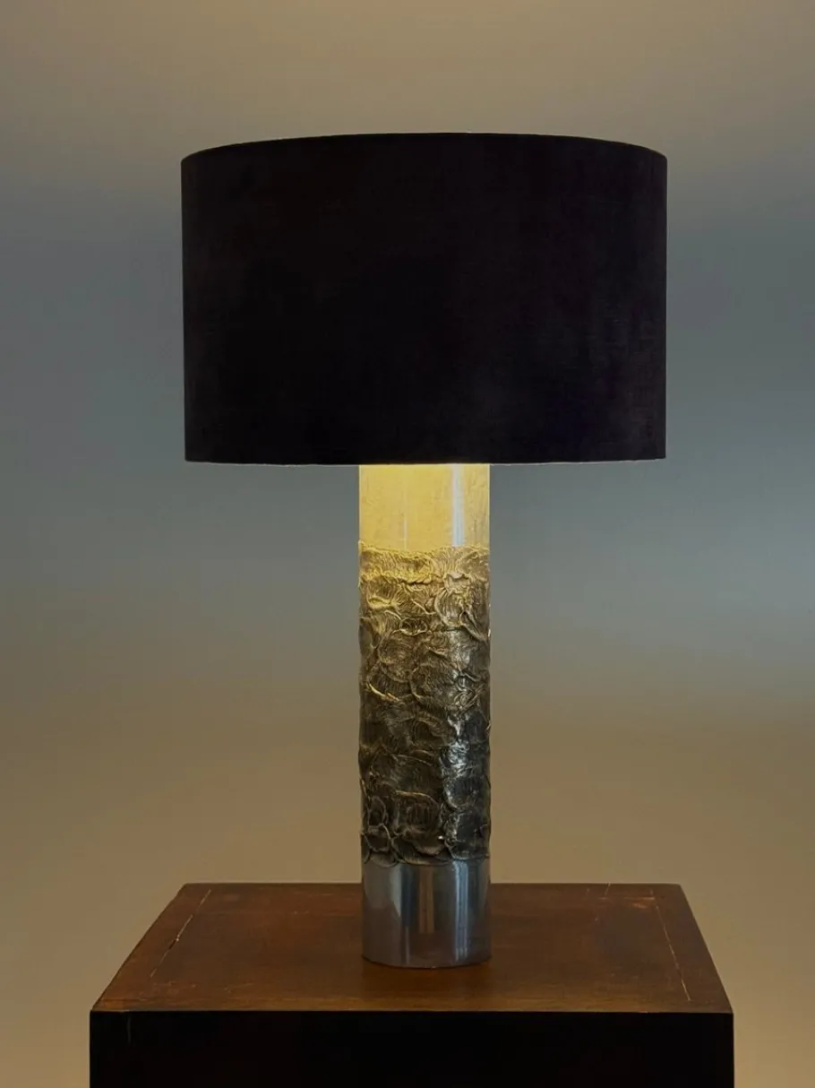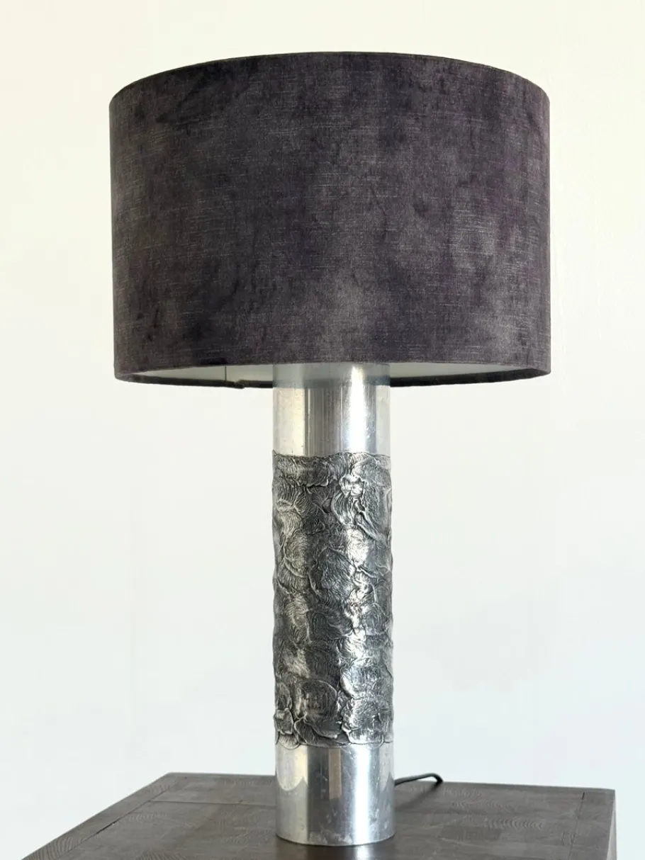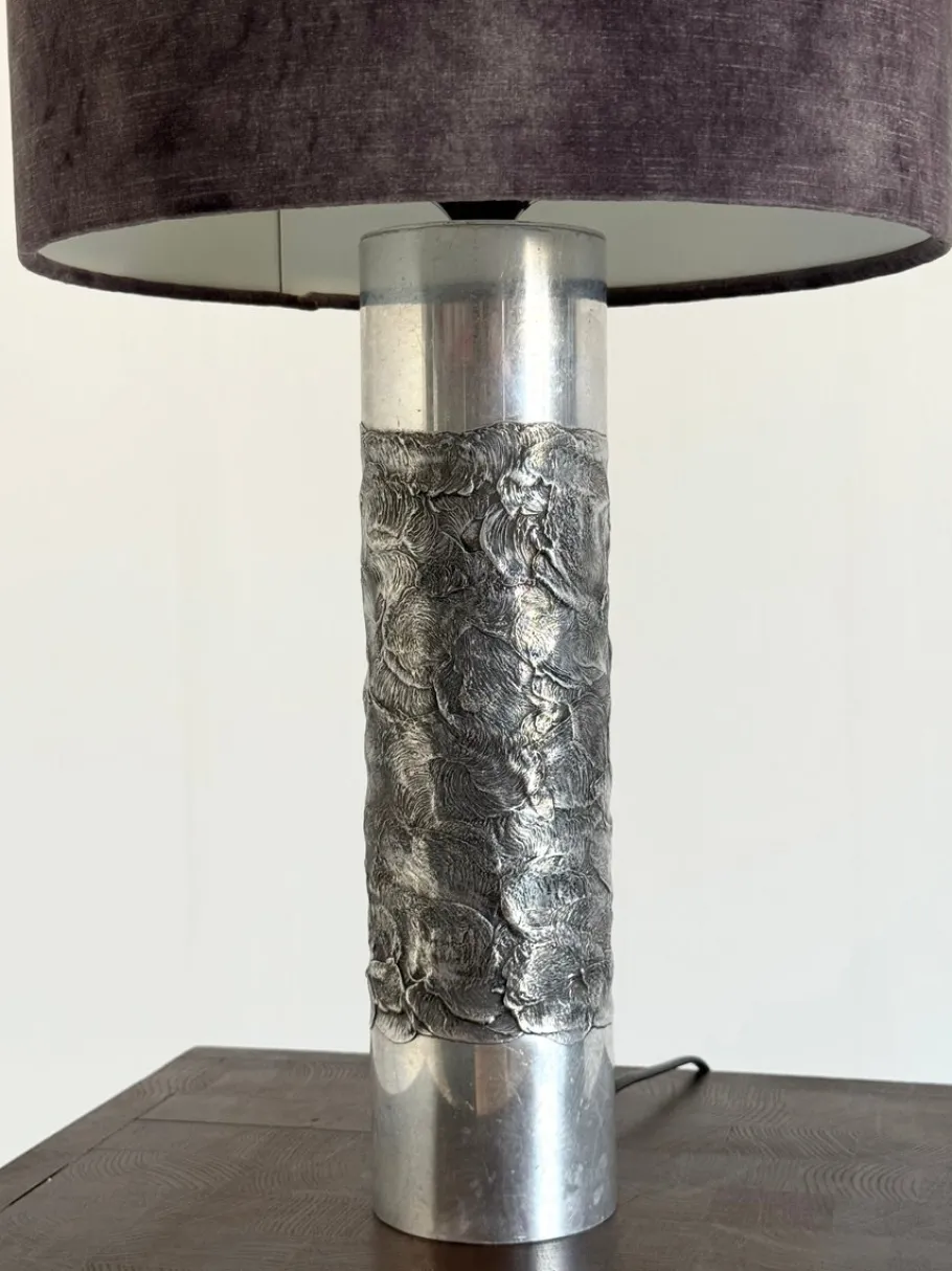 This lamp is a beautiful example of Luyckx’s signature brutalist style, with robust shapes and an industrial look. During this period, Aluclair produced a range of unique objects, including ashtrays, candlesticks, and various lamps in the same burnt aluminum, with craftsmanship and originality at the forefront.