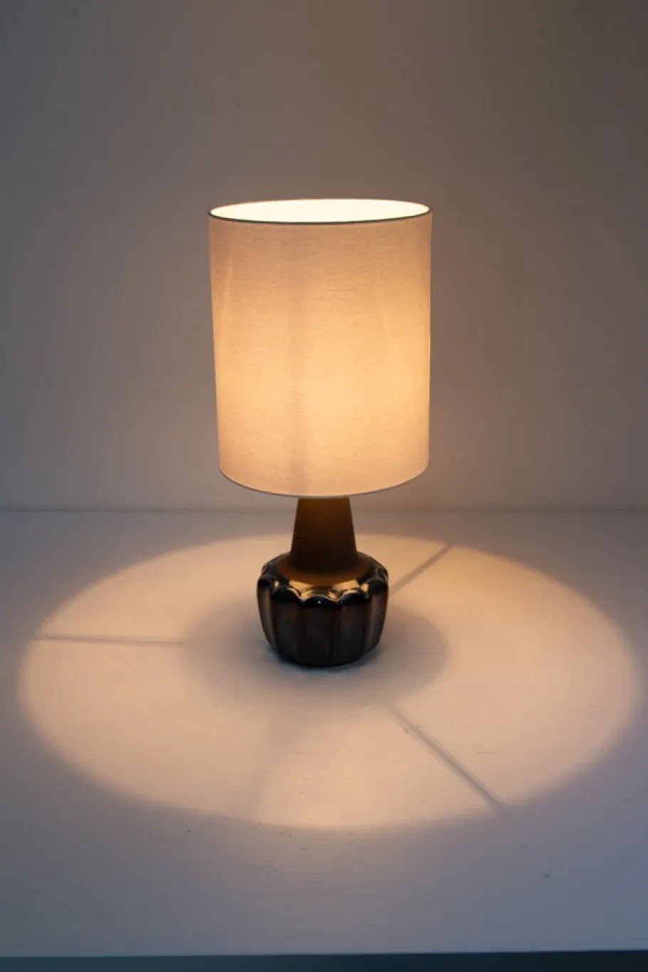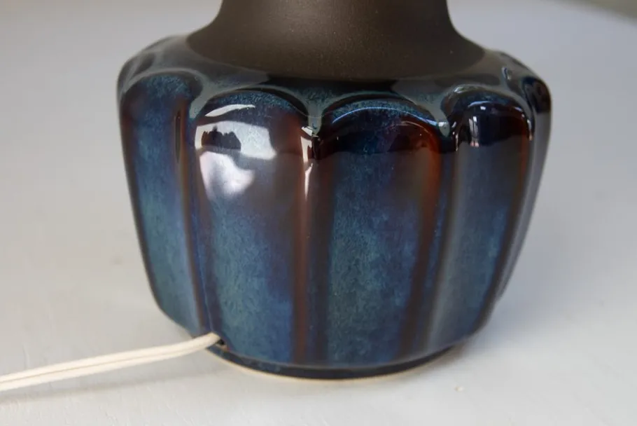 This lamp is from the EJ64 series which can be seen by the wellknown rich glossy blue glaze. It is stamped with “Søholm Denmark Stentøj”, “EJ” (shaped as an eye, which is the signature of Einar Johansen). And model no. 1051.