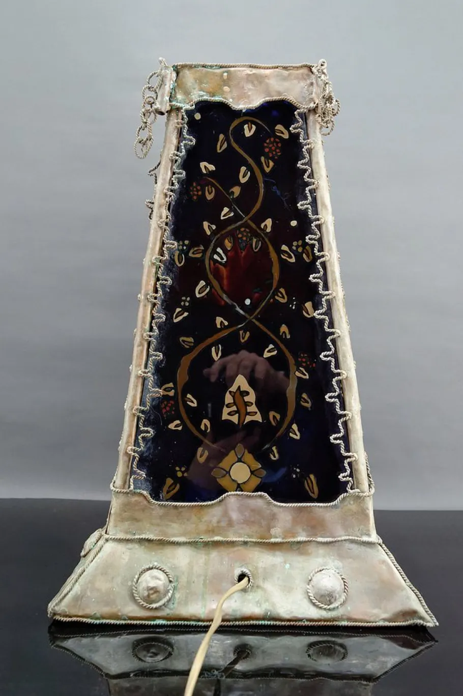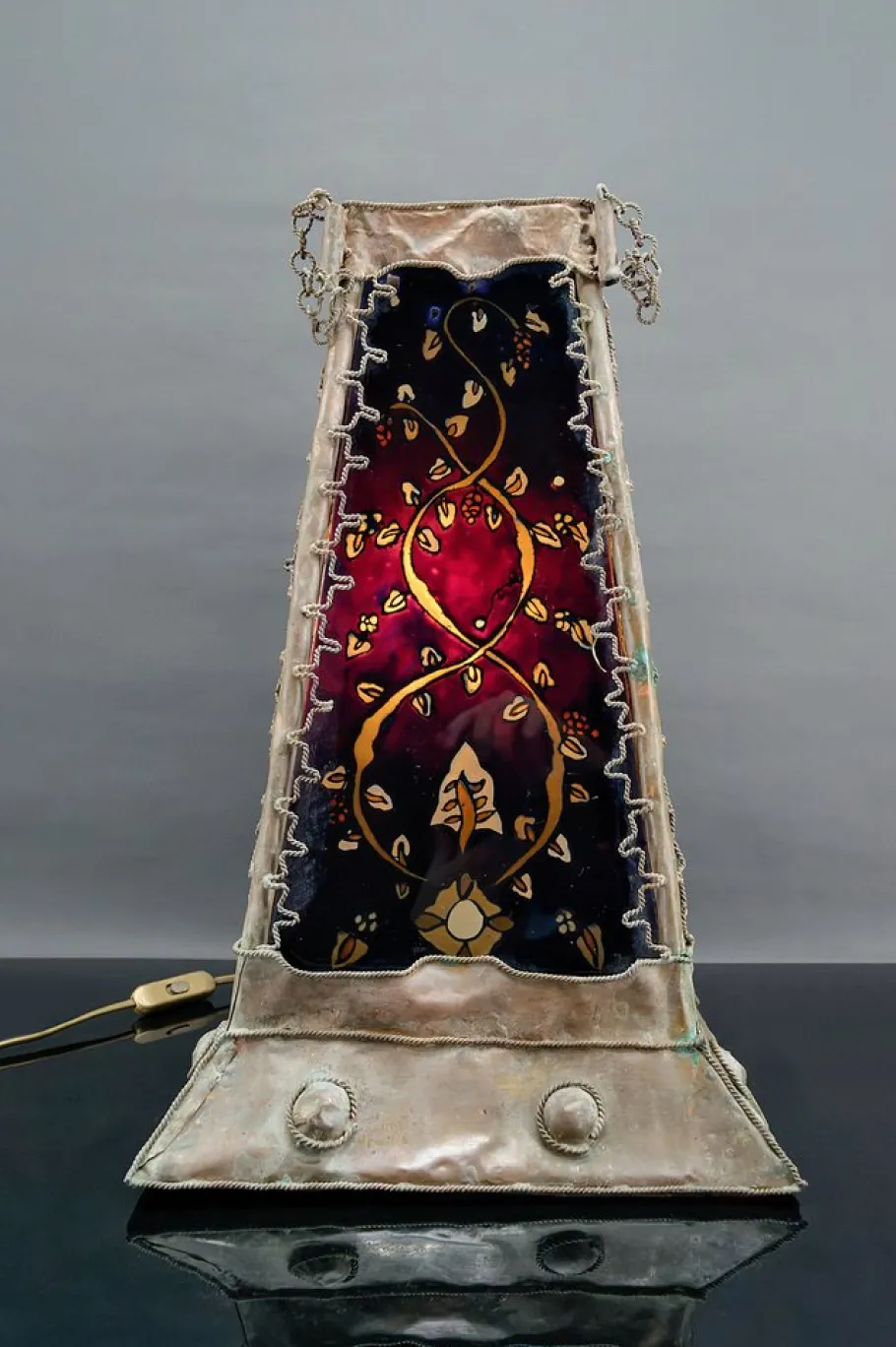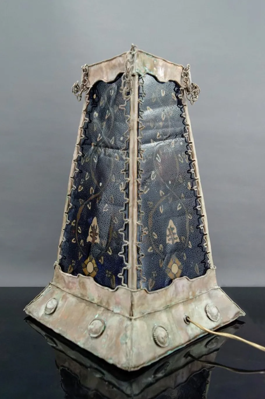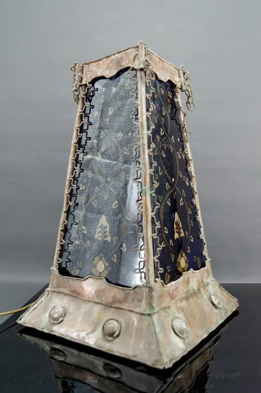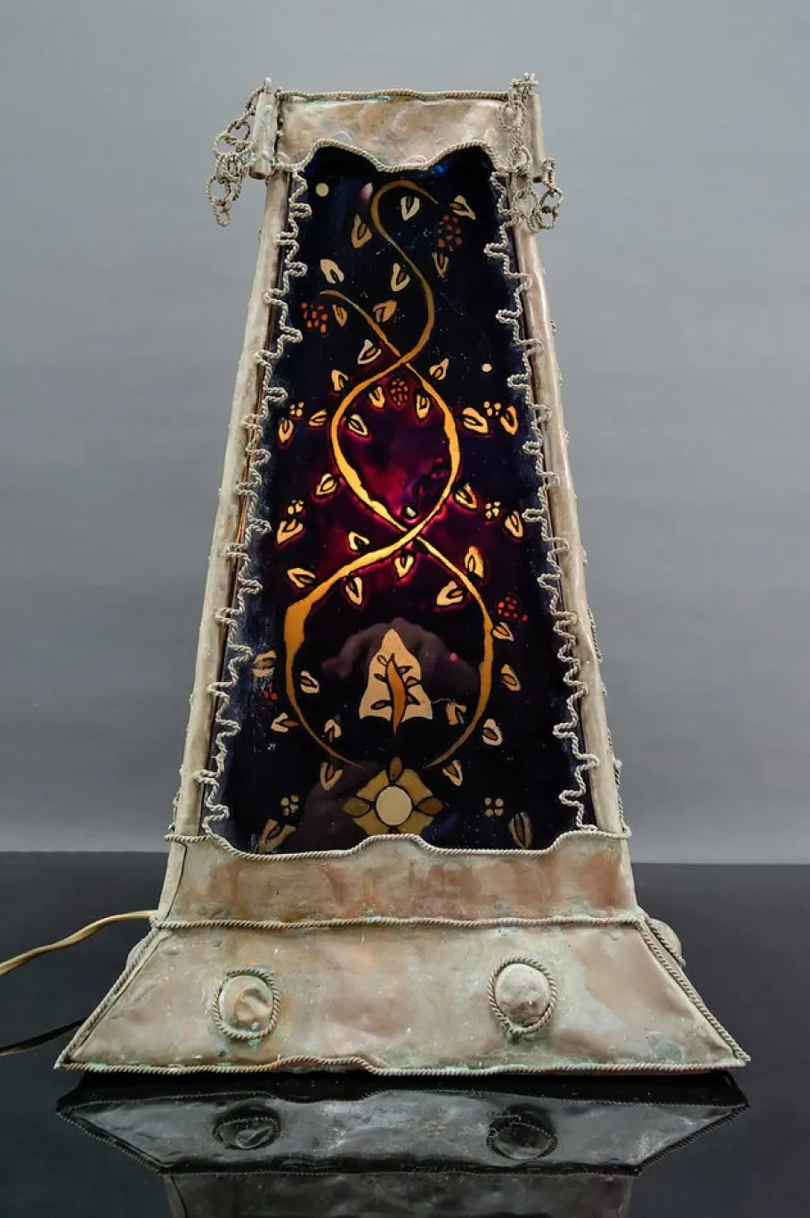 | Materials | Antiqued Glass, Brass, Copper, Glass, Paint, Colored Glass |