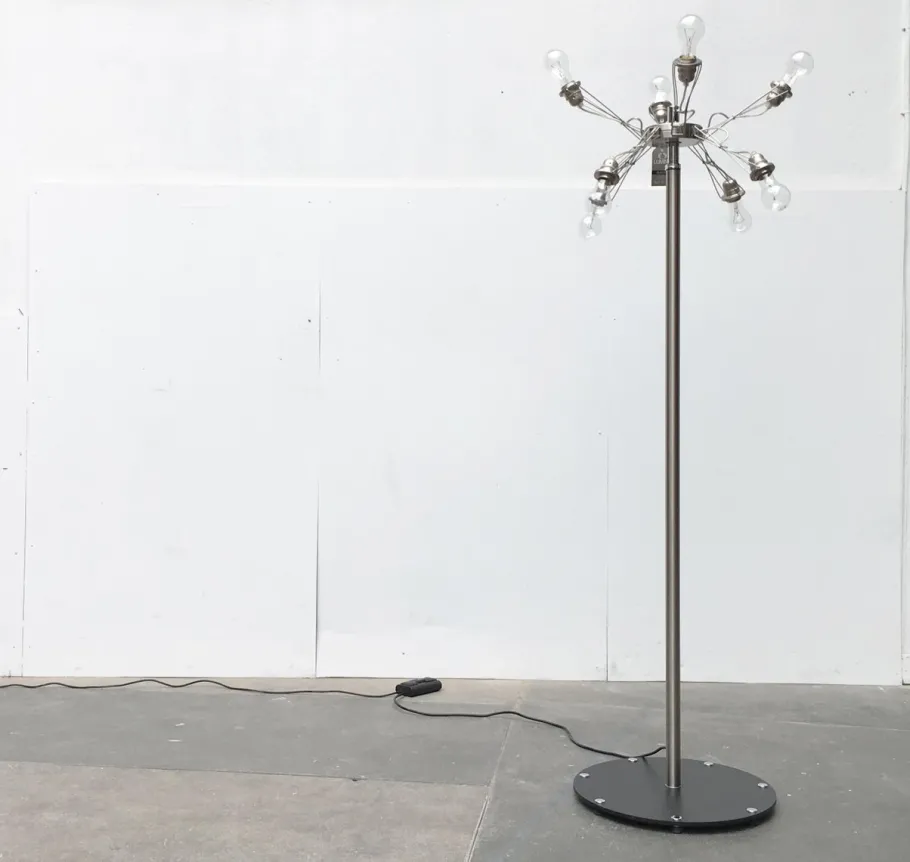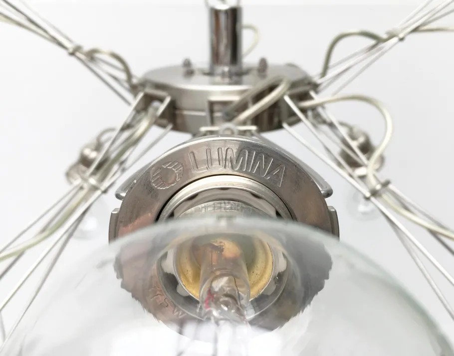 The lamp has 8 normal E27 sockets, in which almost any bulb fits. Designed for clear globe bulbs but other bulbs will fit it as well. The lamp has a double dimmer, each of which can be switched separately in 4 sockets.