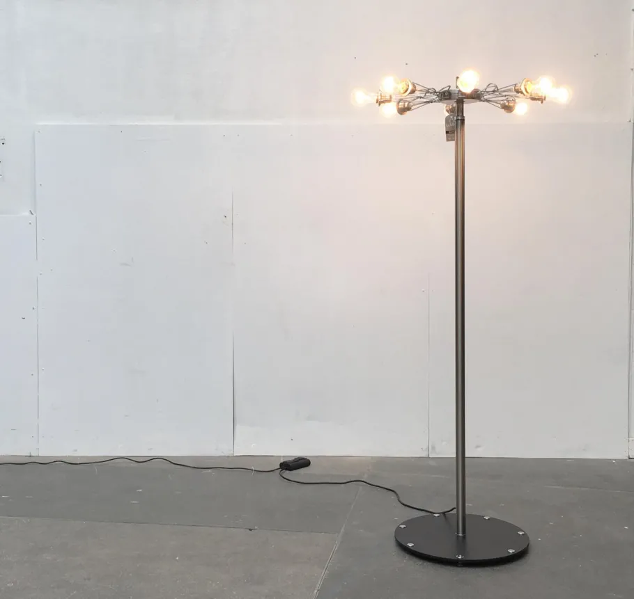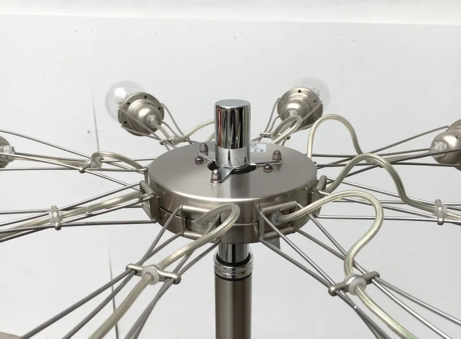 The luminaire consists of 8 arms arranged radially around a central ring. The arms of the lamp are made of a flexible and filigree lattice structure, at the end of each of which sits a socket. The arms can be bent up and down, the socket moves accordingly balanced with. This flexibility gives the luminaire a completely different appearance. From a narrow ring to a three-dimensional, technoid light sculpture.