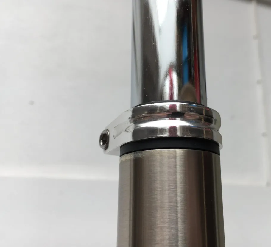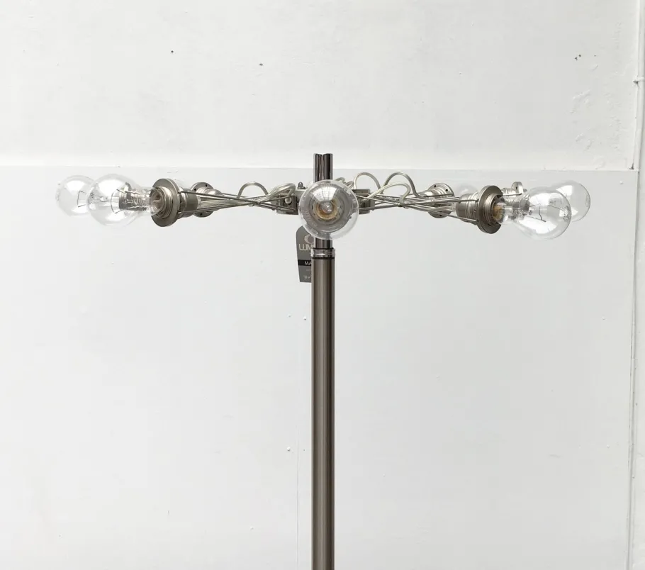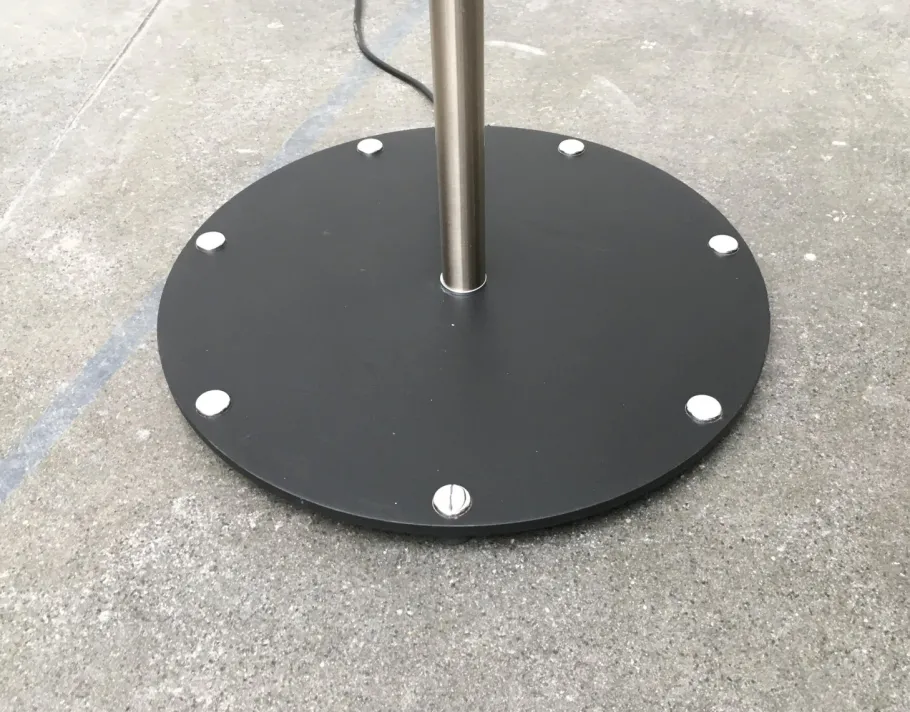This ring is set on a heavy base in the floor lamp version. The rod is divided into two parts, which serves to adjust the height. The lamp can be set very high, which is perfect for high rooms. A special feature is the heavy black plate base with chrome details, which has rubber feet that rotate from the bottom for balancing and safe standing.