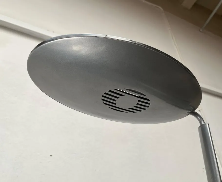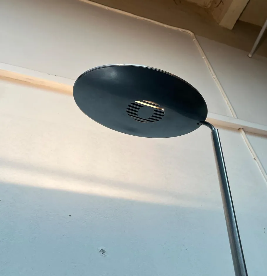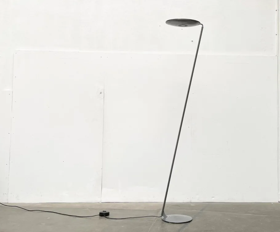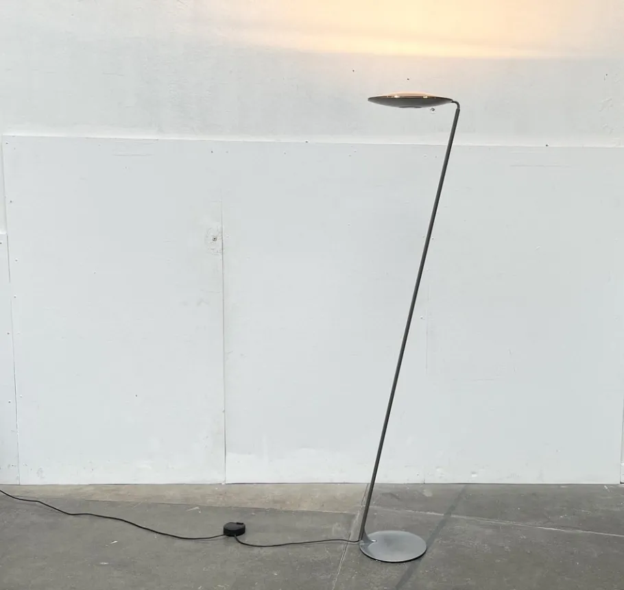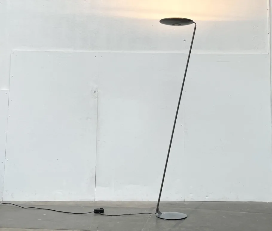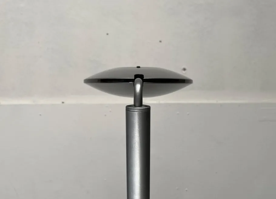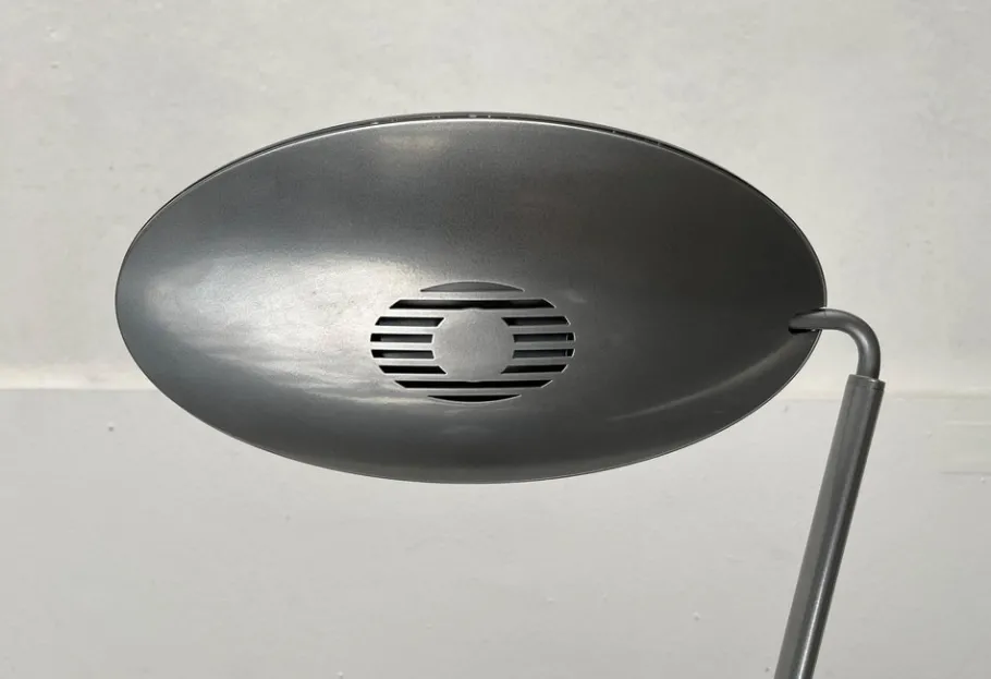 The Zeta Terra is a classic ceiling flooder with indirect lighting effect. The lamp has an elliptical luminaire head that sits at the top of a diagonally running shaft. He ends in a round plate foot below. The shaft is almost “floating” with the foot via a striking angle so that the cable can escape on the underside of the shaft. The flat ellipse of the light head consists of two shells that are separated by a transparent joint made of plastic. The frame is on the top of the head. On the underside, the Lumina logo is milled as an ornament and to derive the heat. The light is primarily released. In addition, the transparent joint appears slightly in the middle of the light head. The head is movable and can be rotated. In this way, the light can be aligned at a certain angle. The lamp has a cord dimmer. The Zeta Terra is no longer produced and is accordingly rare.