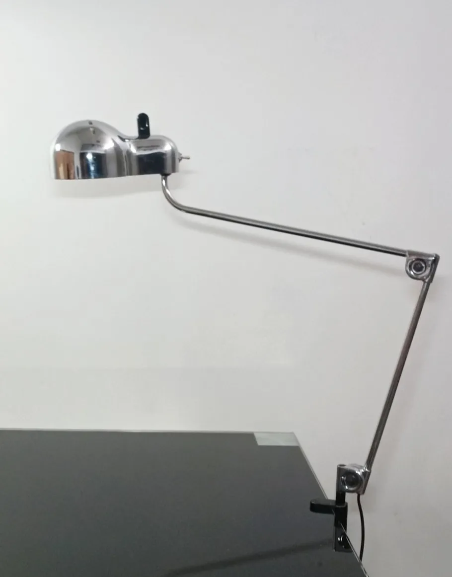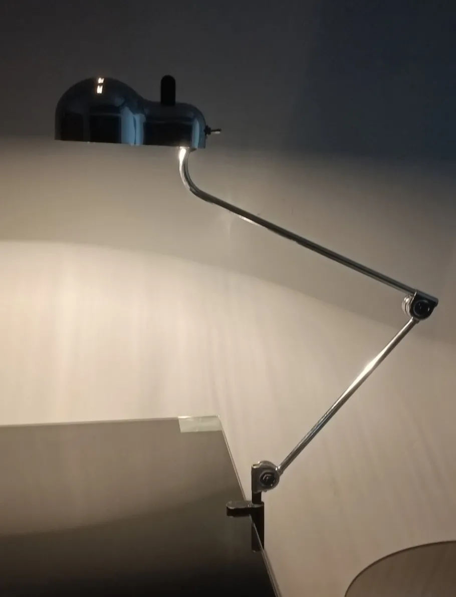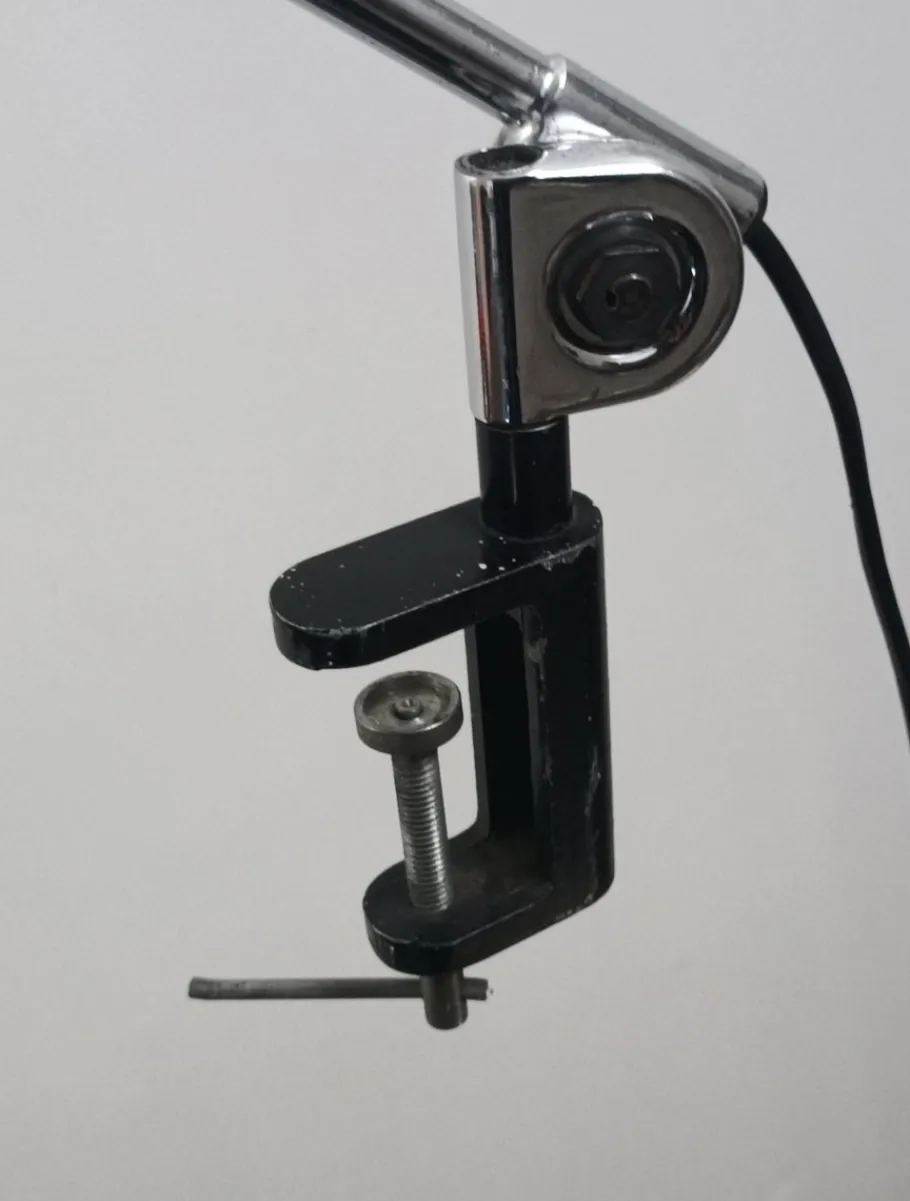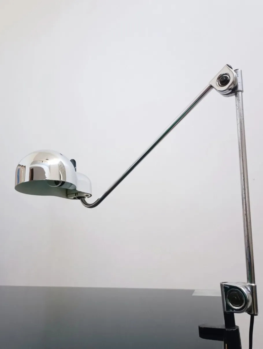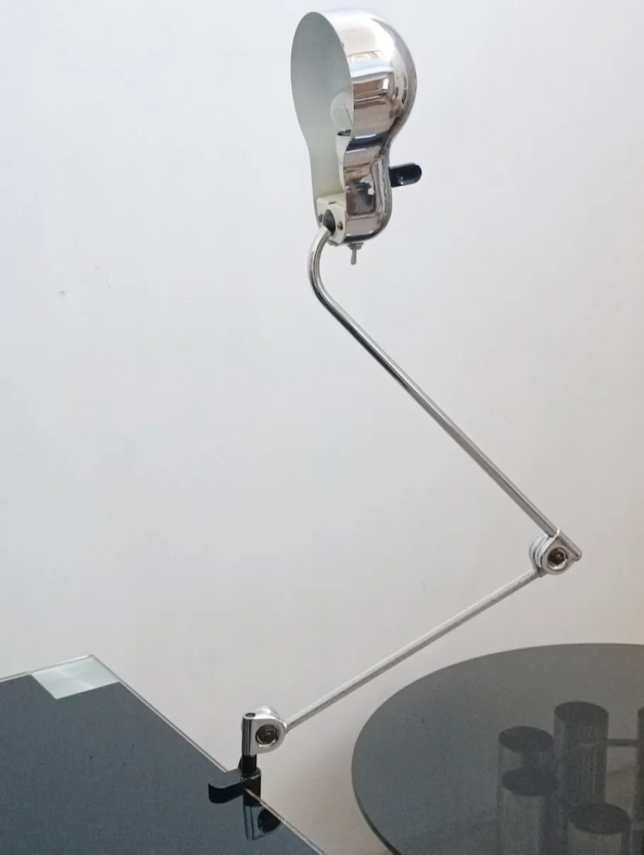 A long, two-part articulated arm that attaches to a desk or shelf.