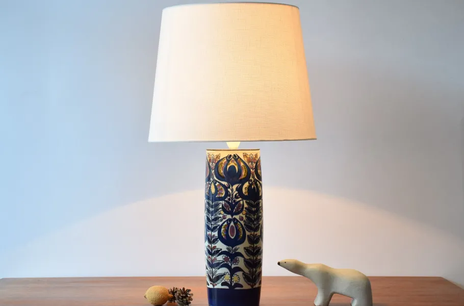 Included is a new lampshade designed and made in Denmark. It is made of woven fabric with some texture and is off white. It has a top cover so it will spread a cosy light downwards.