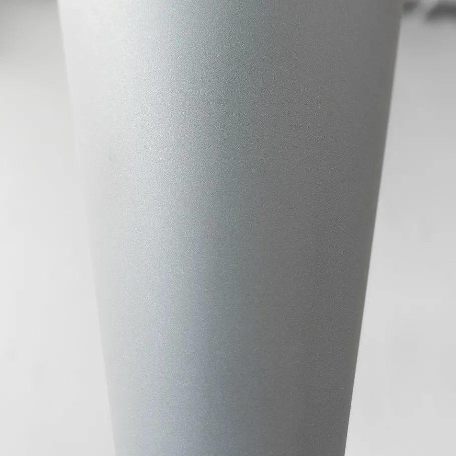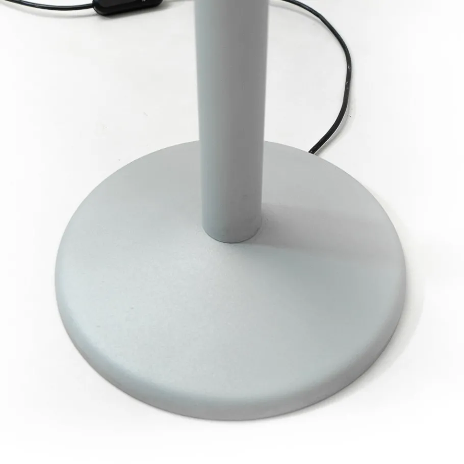 The lamp is completely built up in metal, consisting of a stem that widens into a cone. The color can be best described as a very light grey, with a hint of blue. The finish is not smooth, but has a relief to it.