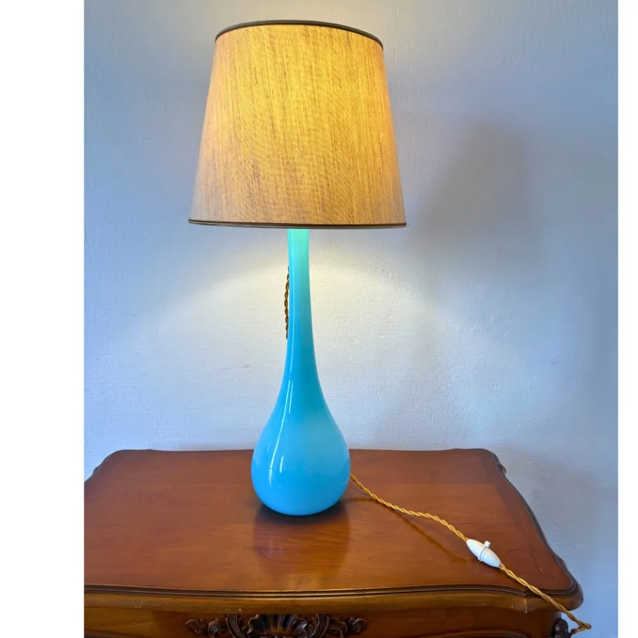 The lamp features a striking hand-blown Murano glass base in a vibrant gradient of blue, with a teardrop form that embodies the refined artistry of Venetian glassmakers.