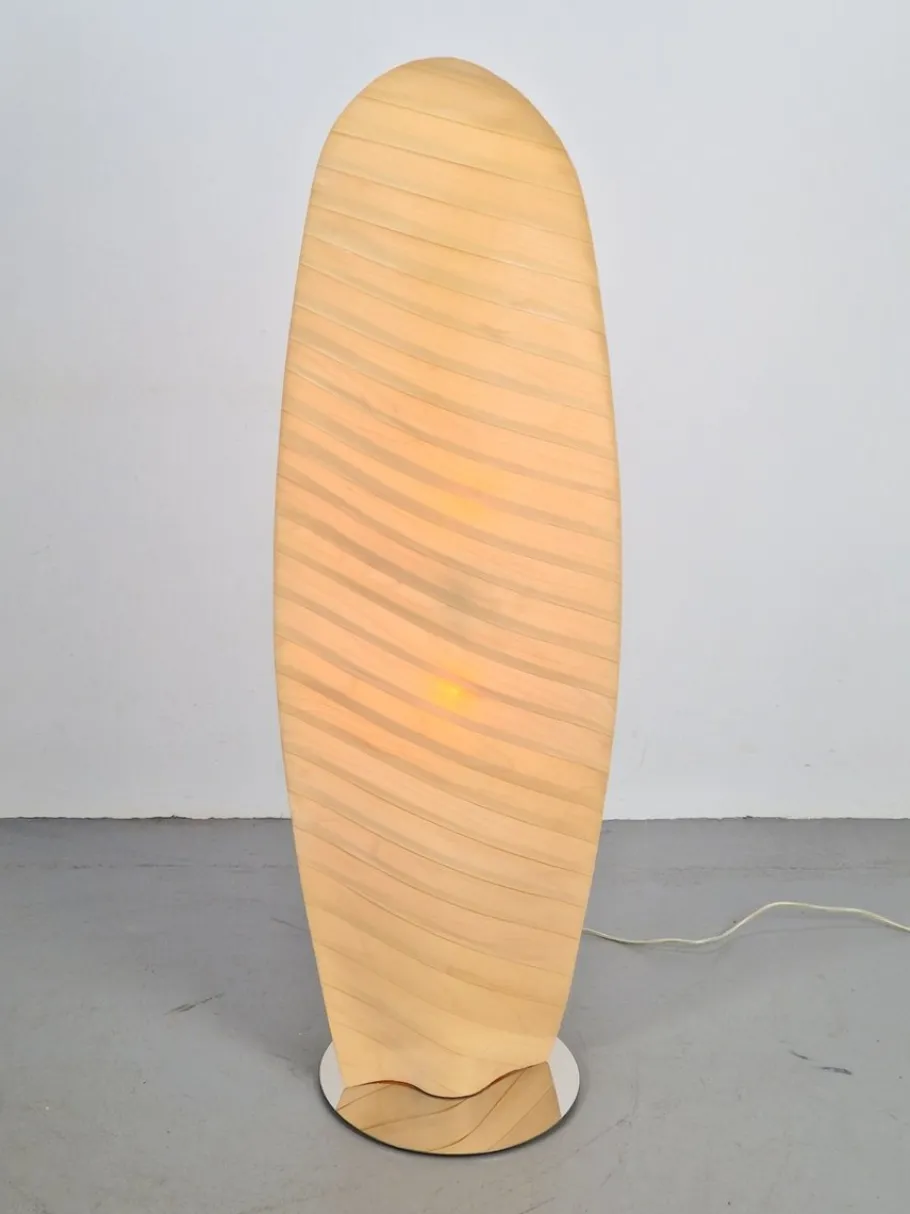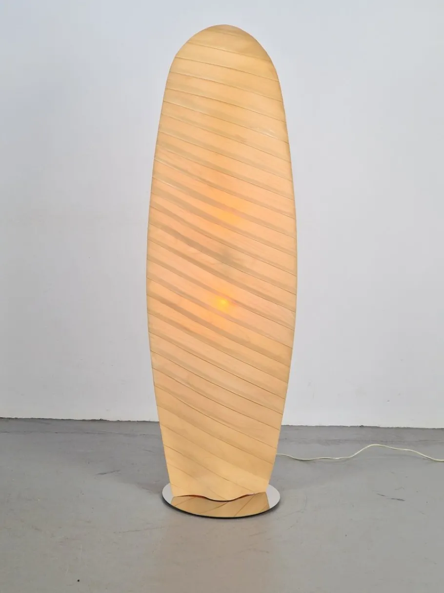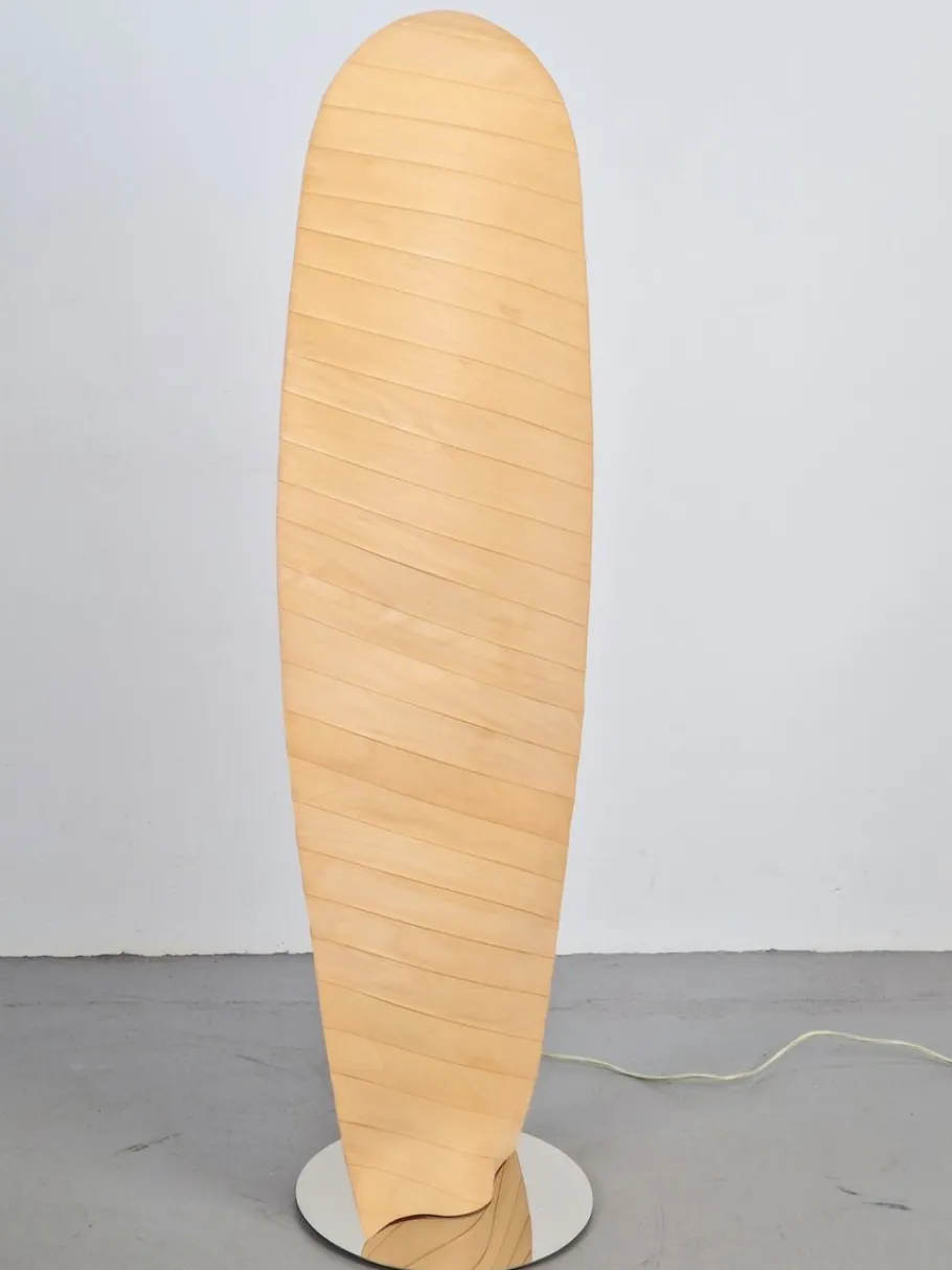 It consists of a chrome metal base, which carries a wing made of thin strips of wood.