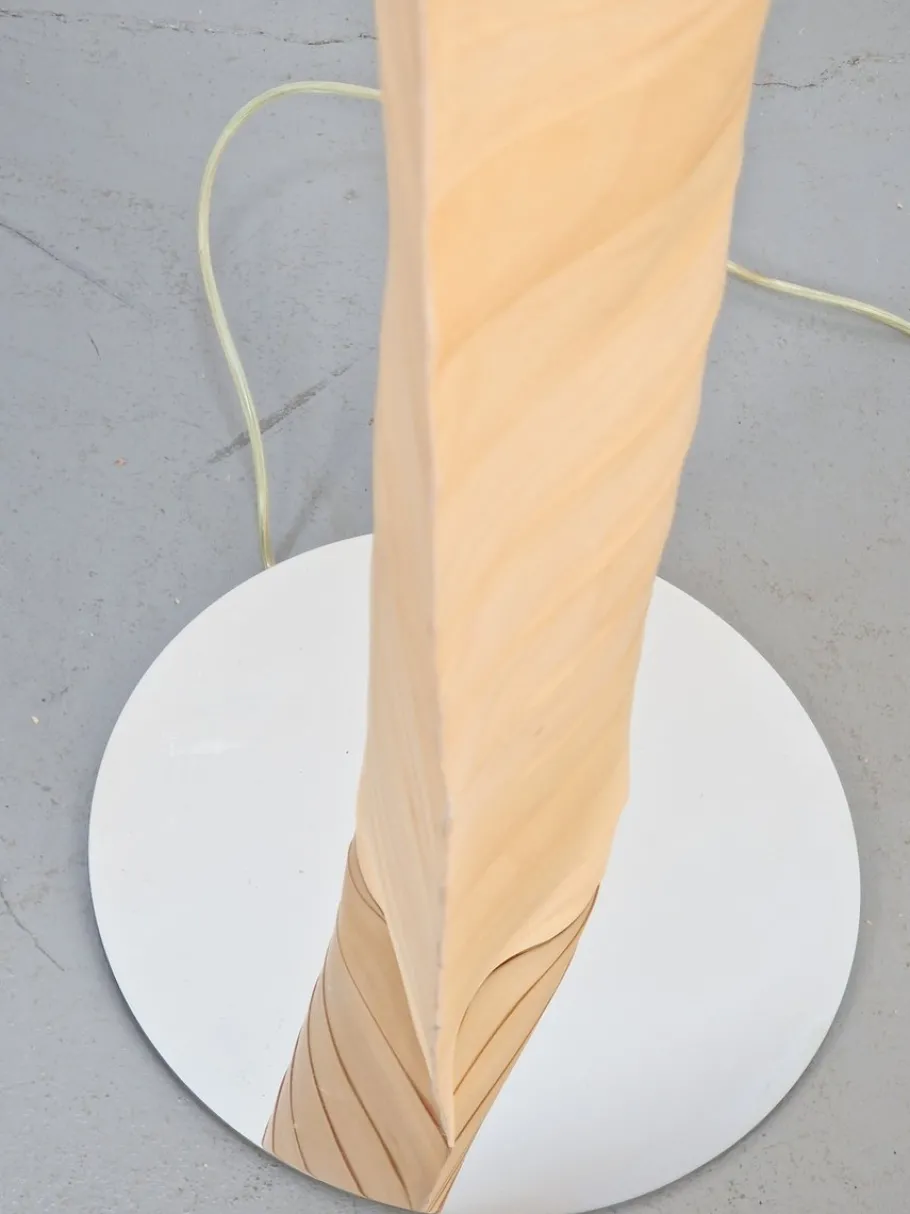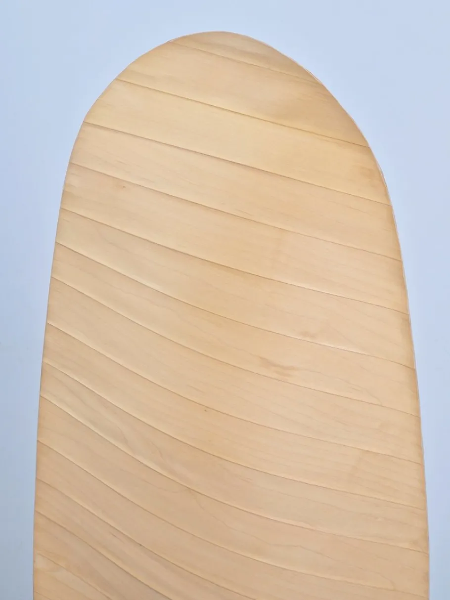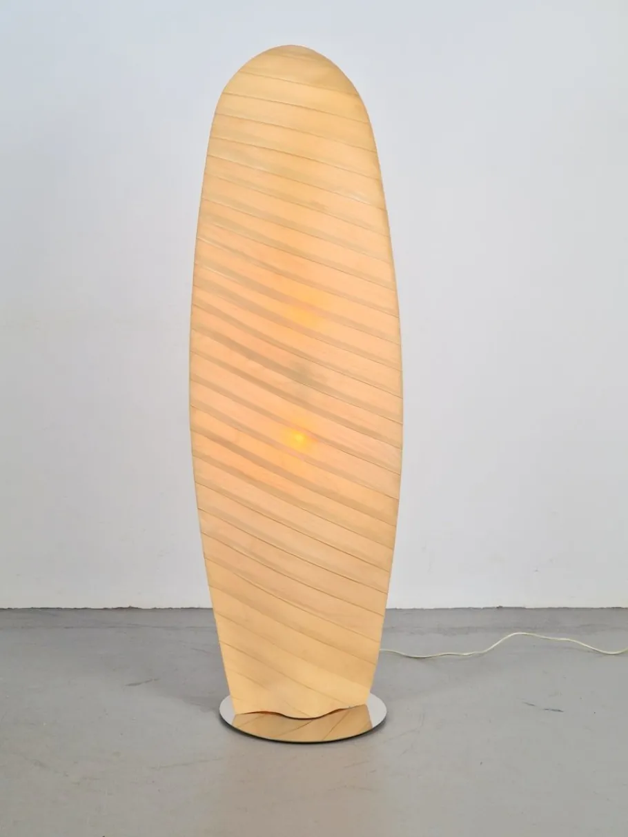 It consists of a chrome metal base, which carries a wing made of thin strips of wood.